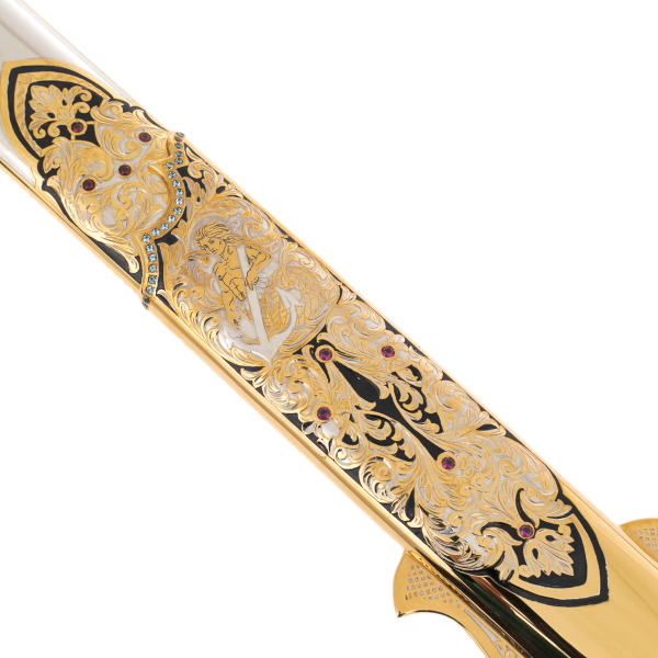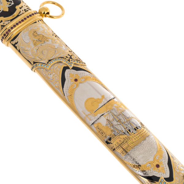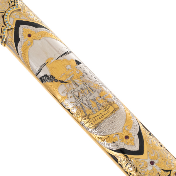 Техника исполнения — златоустовская гравировка — доведена в этой работе до высшей степени выразительности. Все изображения выполнены с филигранной точностью, включающей чернение, золочение, никелирование и инкрустацию камнями. Орнаменты ножен и клинка разворачиваются в сложные геральдические и мифологические сцены, отсылающие к морской славе, путешествиям, открытию новых горизонтов. На клинке выгравирован лавровый венок с трезубцем — символ победы и морской власти, обрамлённый златоустовским узором, напоминающим водовороты. Каждый элемент здесь — не просто декор, а образ, насыщенный аллюзиями.