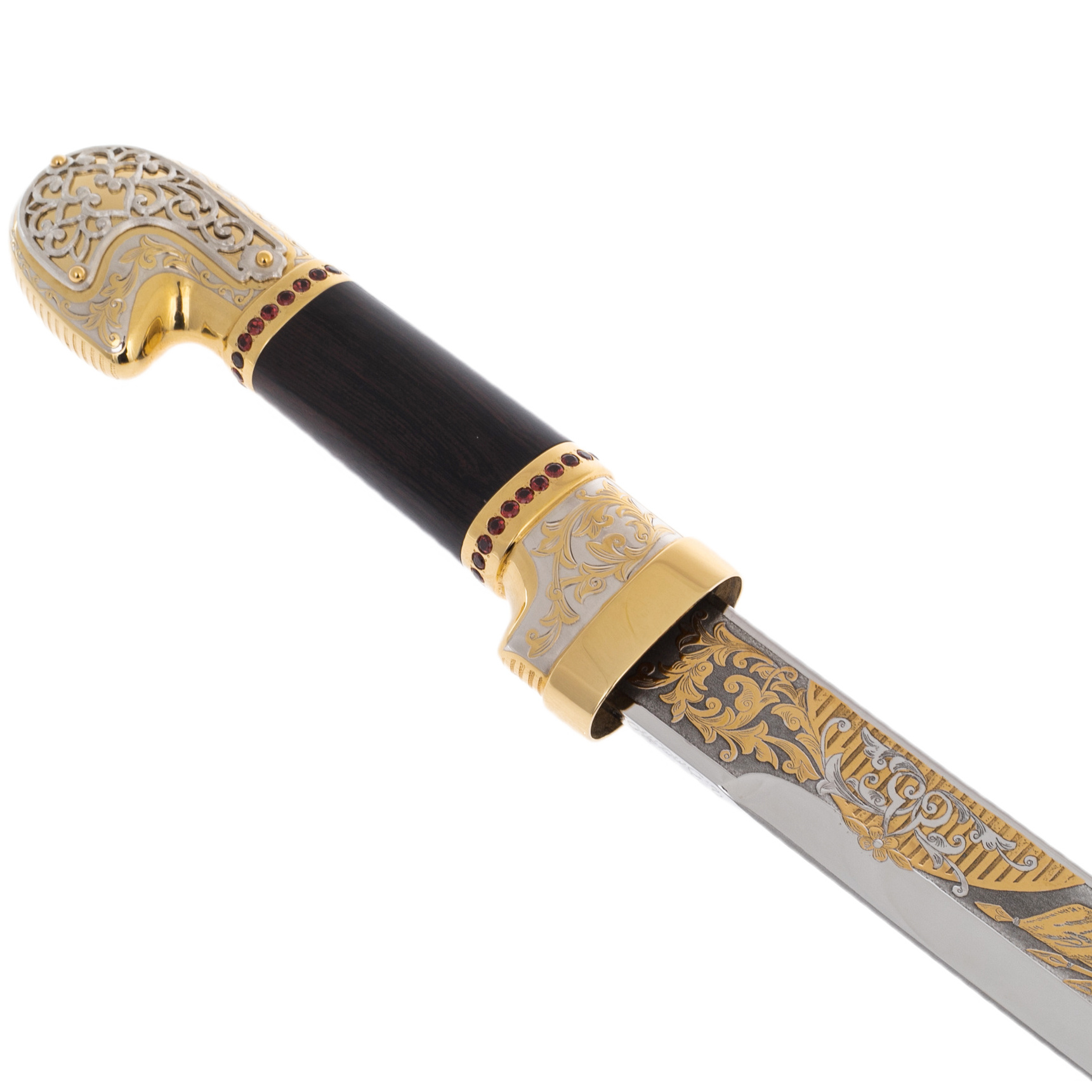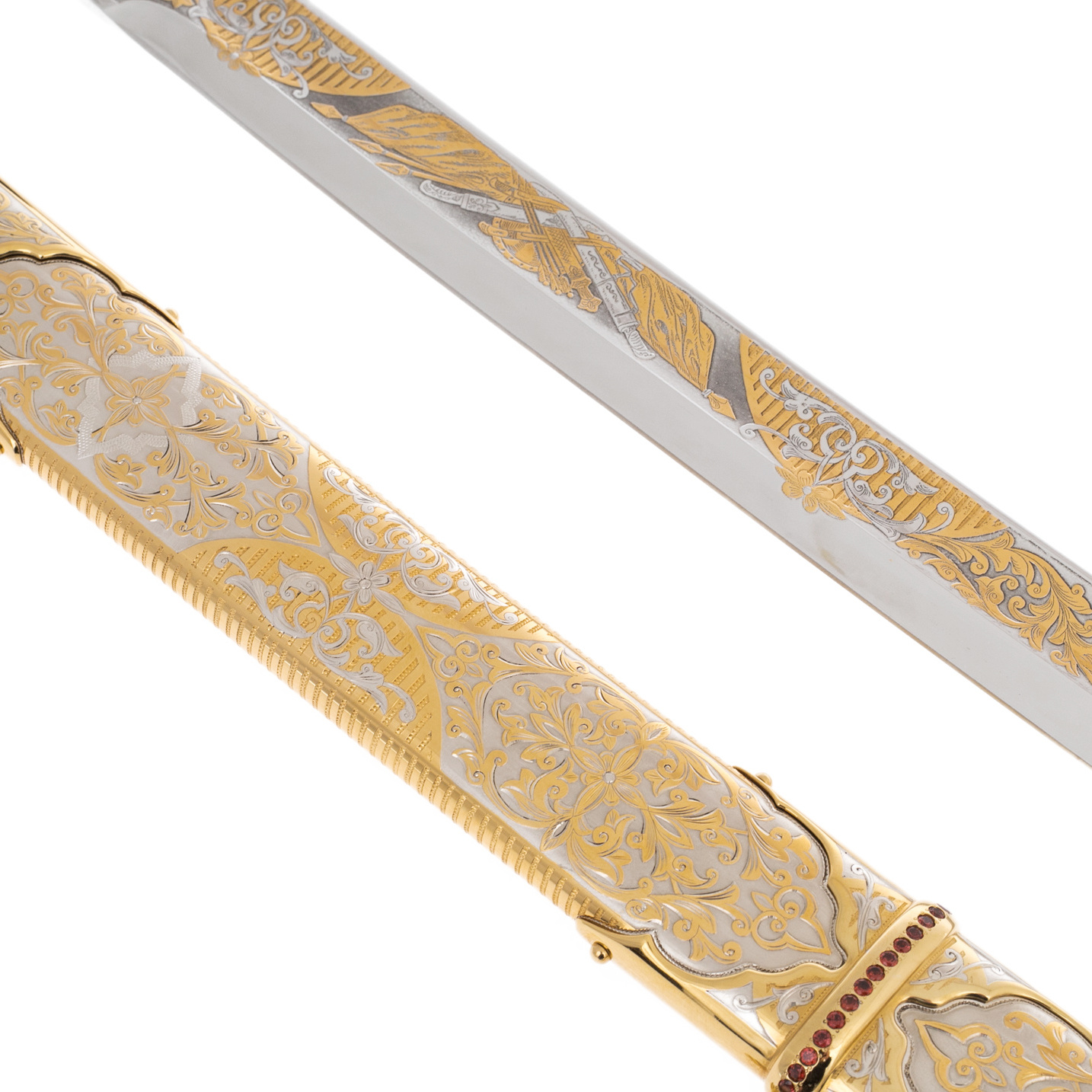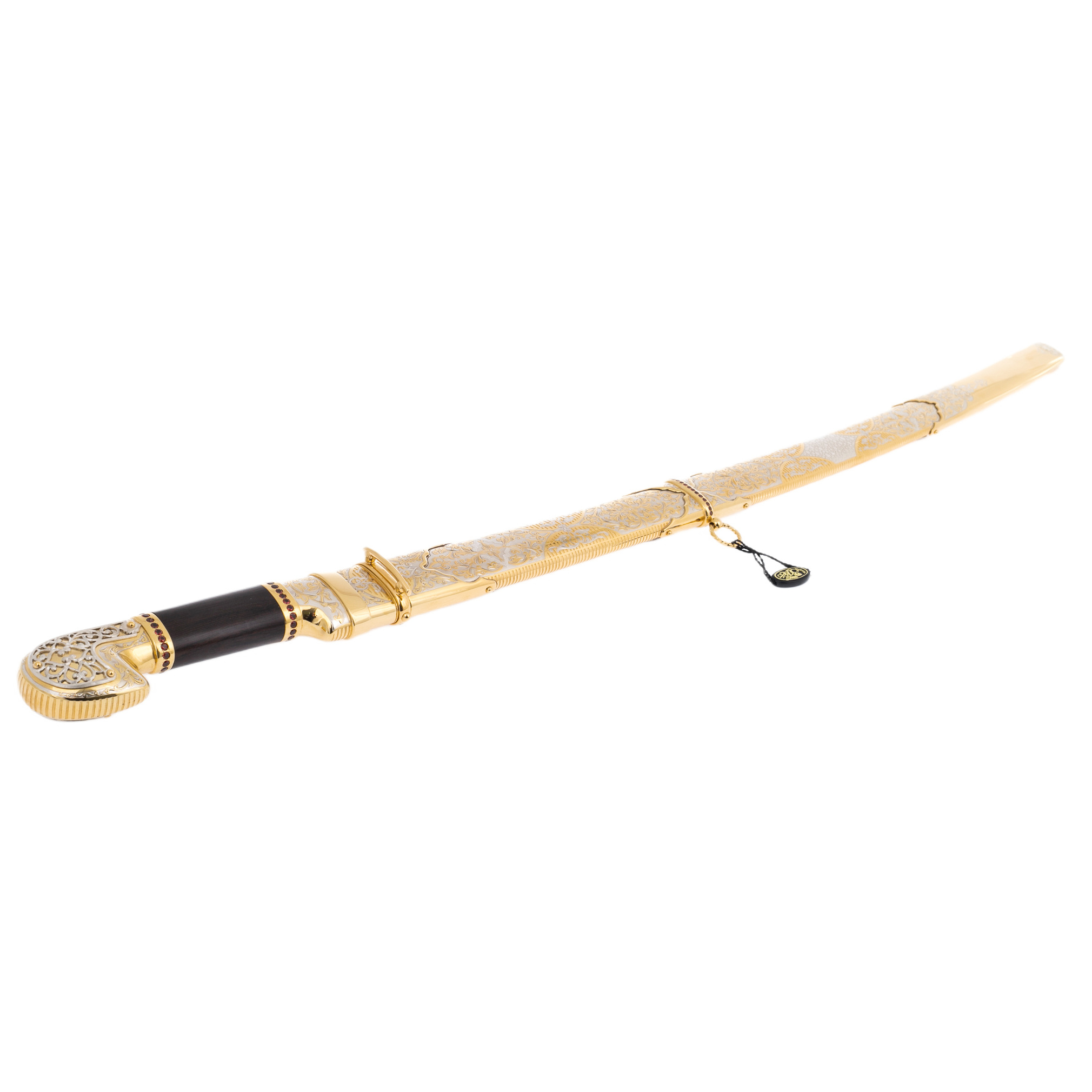 Сувенирная шашка "Золотой орден" из Златоуста представляет собой изысканный образец художественного оружейного мастерства, обращённый к истинным коллекционерам и ценителям декоративного искусства. Клинок, изящно изогнутый и украшенный золотым и серебряным узорчатым гравированием, раскрывает уникальный орнаментальный сюжет с растительными мотивами и символами, создавая эффект глубины и объёма. Рукоять из благородного дерева, декорированная филигранными вставками из золота и серебра, дополнена аккуратной золотой гардой и навершием, украшенным рядами рубинов, что придаёт изделию благородство и изысканность. Ножны, покрытые тончайшей гравировкой и золотым напылением, становятся достойным обрамлением для клинка, подчёркивая статус изделия как исключительного подарка и памятного предмета.