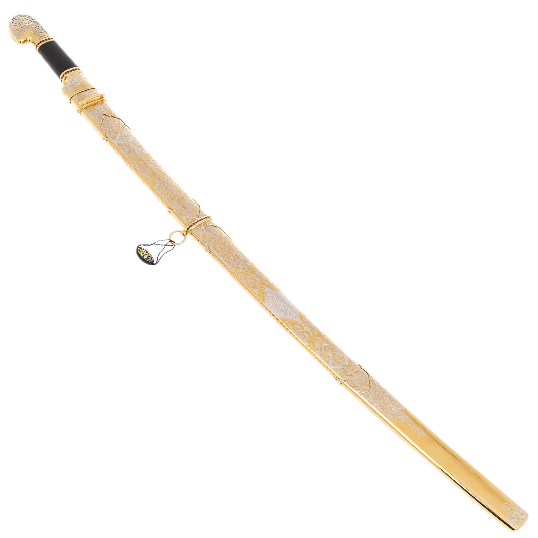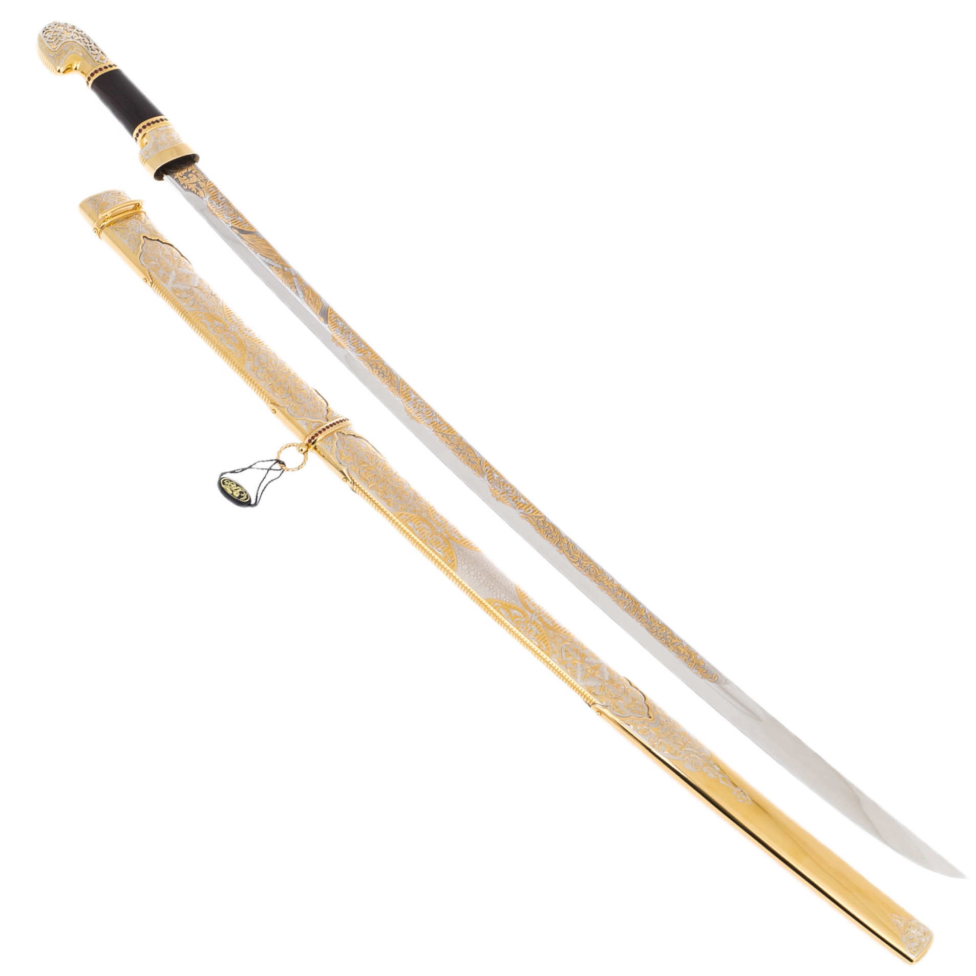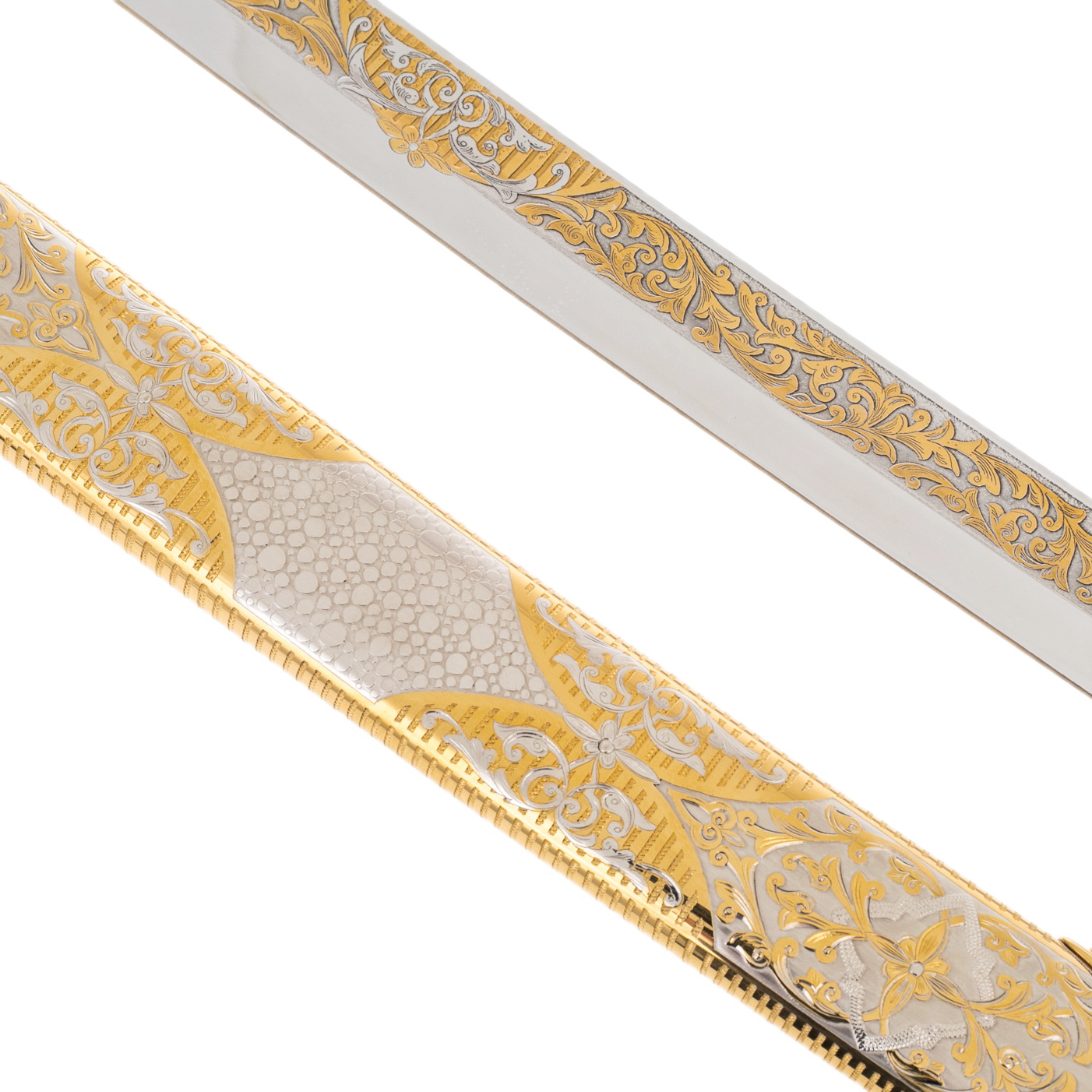 Сувенирная шашка "Золотой орден" из Златоуста представляет собой изысканный образец художественного оружейного мастерства, обращённый к истинным коллекционерам и ценителям декоративного искусства. Клинок, изящно изогнутый и украшенный золотым и серебряным узорчатым гравированием, раскрывает уникальный орнаментальный сюжет с растительными мотивами и символами, создавая эффект глубины и объёма. Рукоять из благородного дерева, декорированная филигранными вставками из золота и серебра, дополнена аккуратной золотой гардой и навершием, украшенным рядами рубинов, что придаёт изделию благородство и изысканность. Ножны, покрытые тончайшей гравировкой и золотым напылением, становятся достойным обрамлением для клинка, подчёркивая статус изделия как исключительного подарка и памятного предмета.