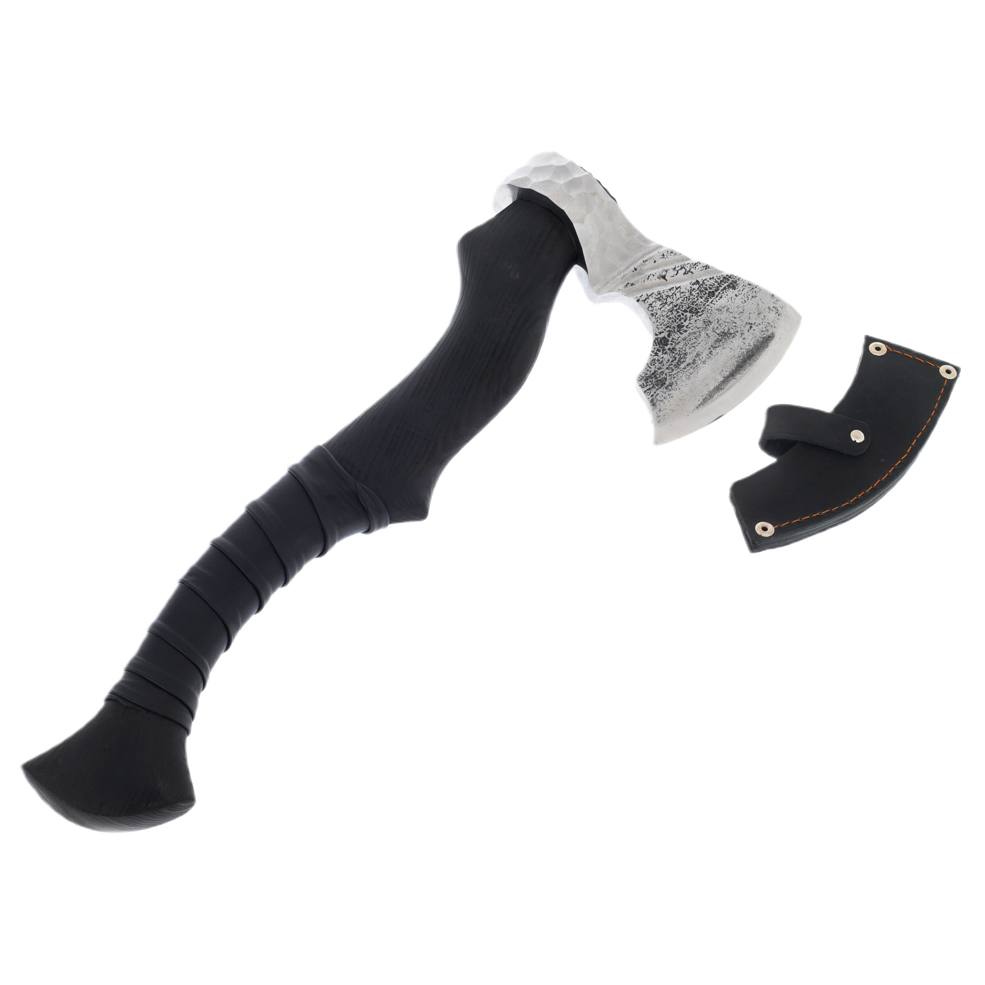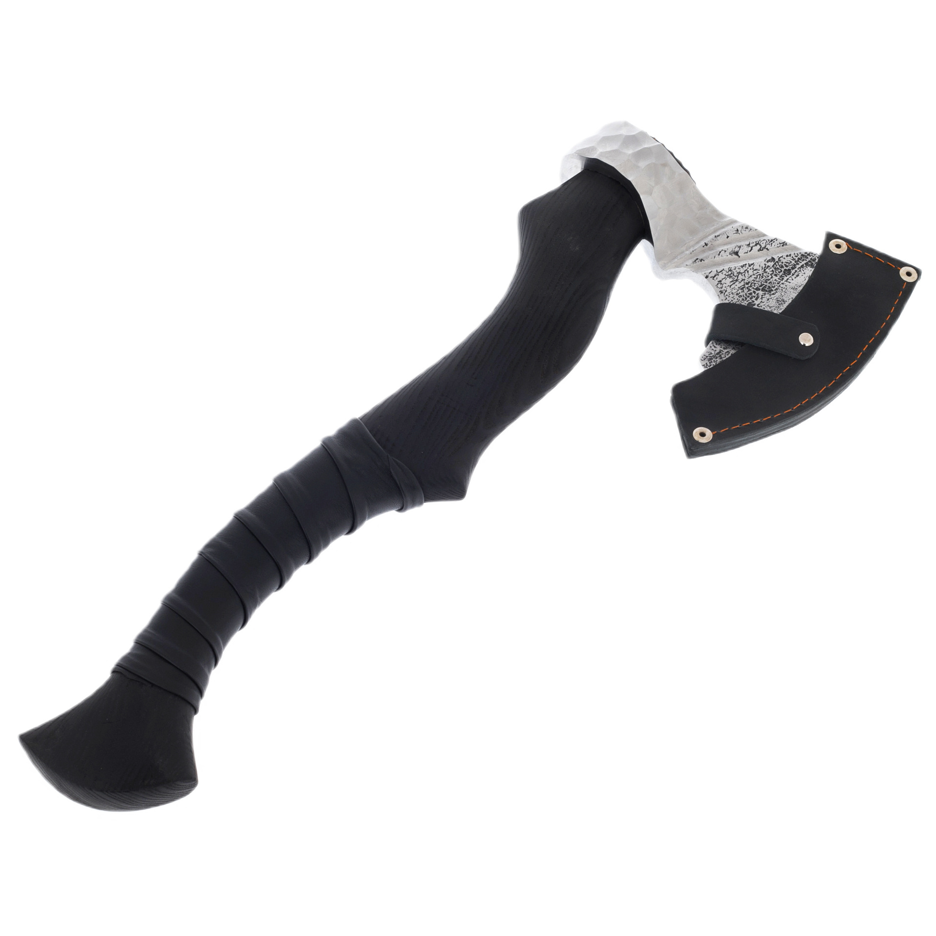 Топор «Дровосек» — это не просто инструмент, а выразительное воплощение силы, достоинства и безупречного вкуса. Массивная сталь клинка, обработанная с эффектом ручной чеканки, производит впечатление архаичной мощи, искусно соединённой с современным минимализмом. Слегка изогнутая рукоять, выточенная из прочного дерева и обтянутая кожей, лежит в руке уверенно и надёжно, словно продолжение собственной силы. Съёмный кожаный чехол на заклёпках защищает лезвие и одновременно подчёркивает характер изделия: сдержанный, но вызывающий уважение.