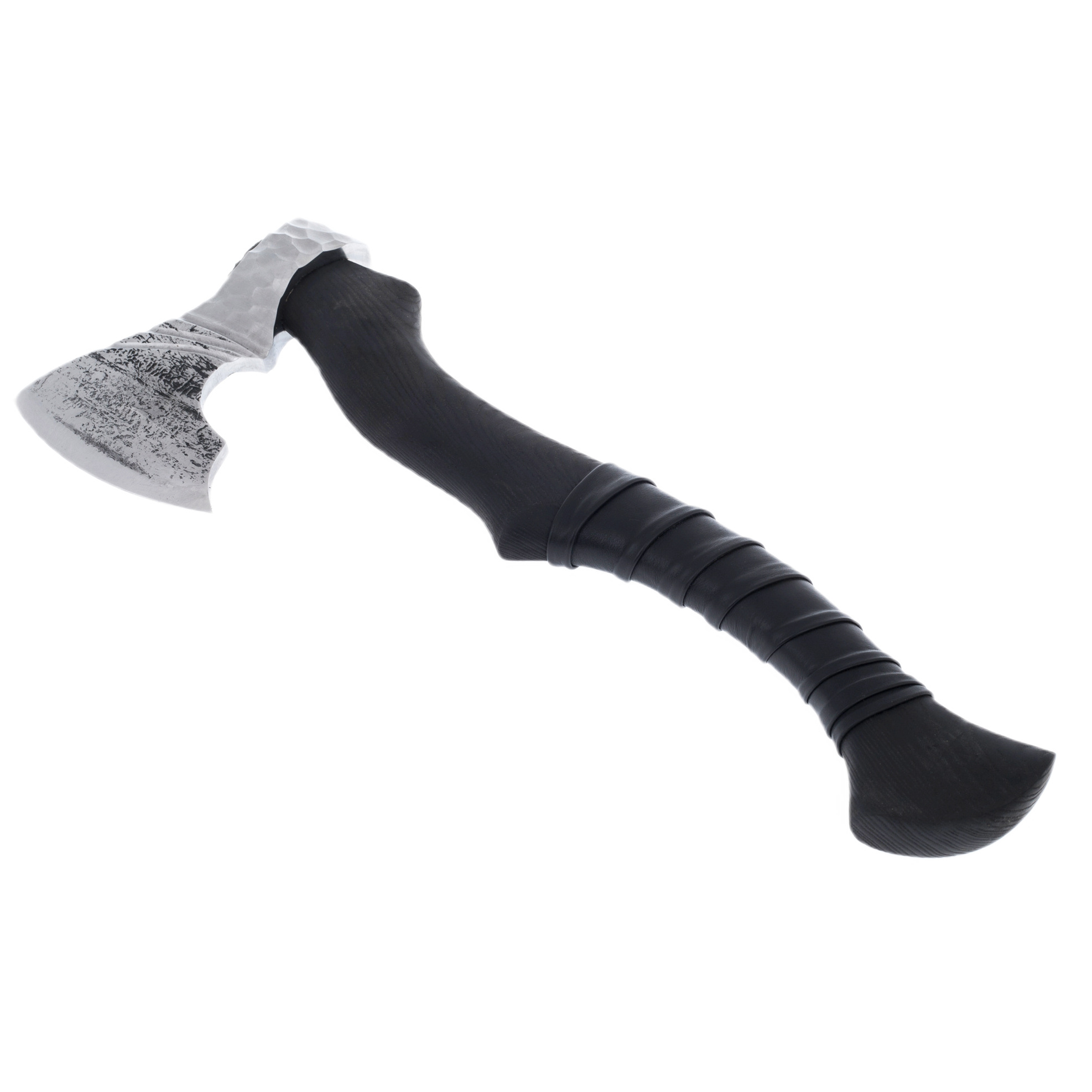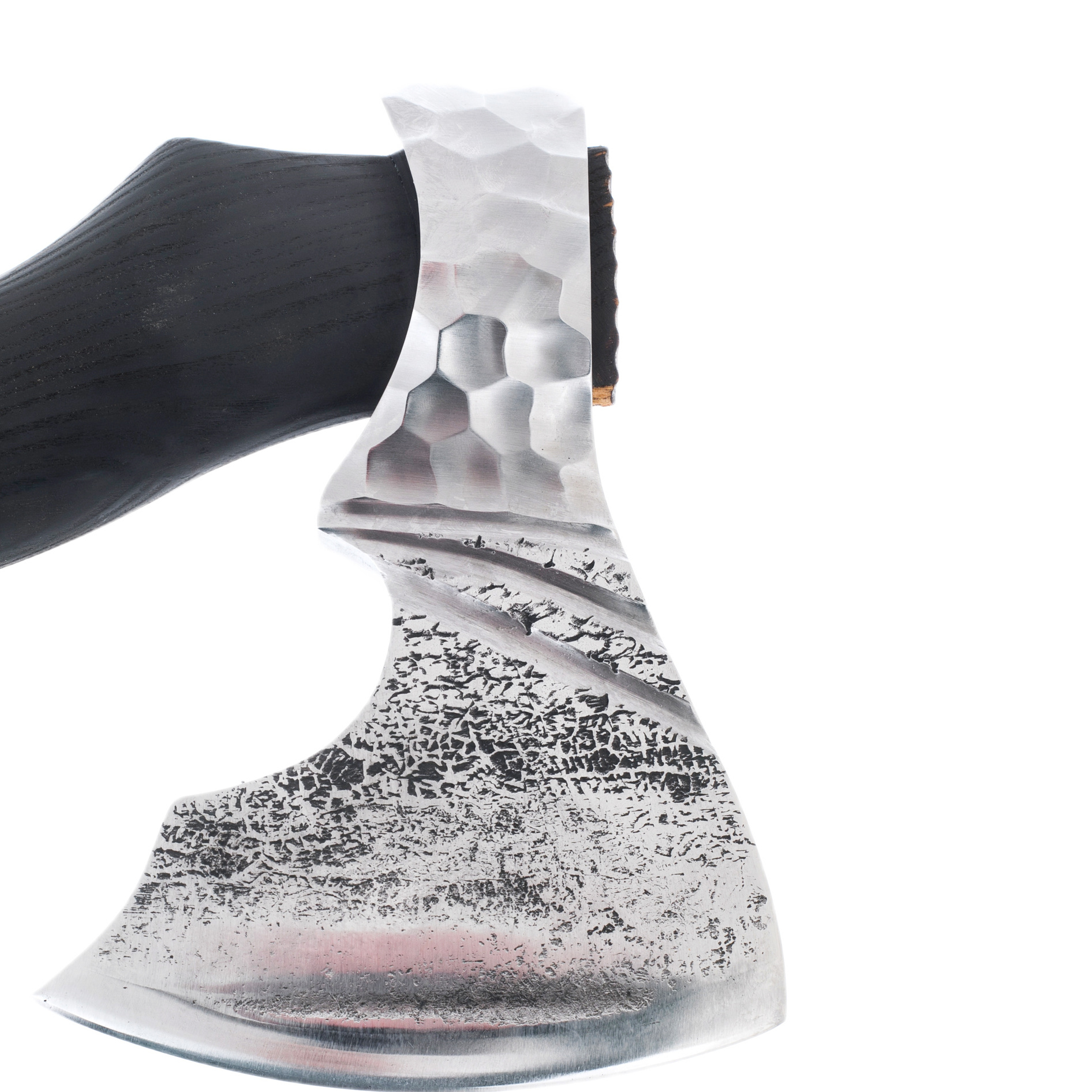 В топоре нет ни одной детали, скомпонованной случайно — всё продумано до мелочей. Клинок выкован из стали с сохранённой текстурой ковки, оставляющей на поверхности характерный узор, напоминающий следы древнего ремесла. Эта поверхность не отполирована до зеркального блеска, но и не лишена эстетики: она сурова, лаконична и в высшей степени выразительна. Линия режущей кромки усилена термообработкой, придающей остроту и долговечность, а сам изгиб клинка оптимален для работы с древесиной любой плотности.