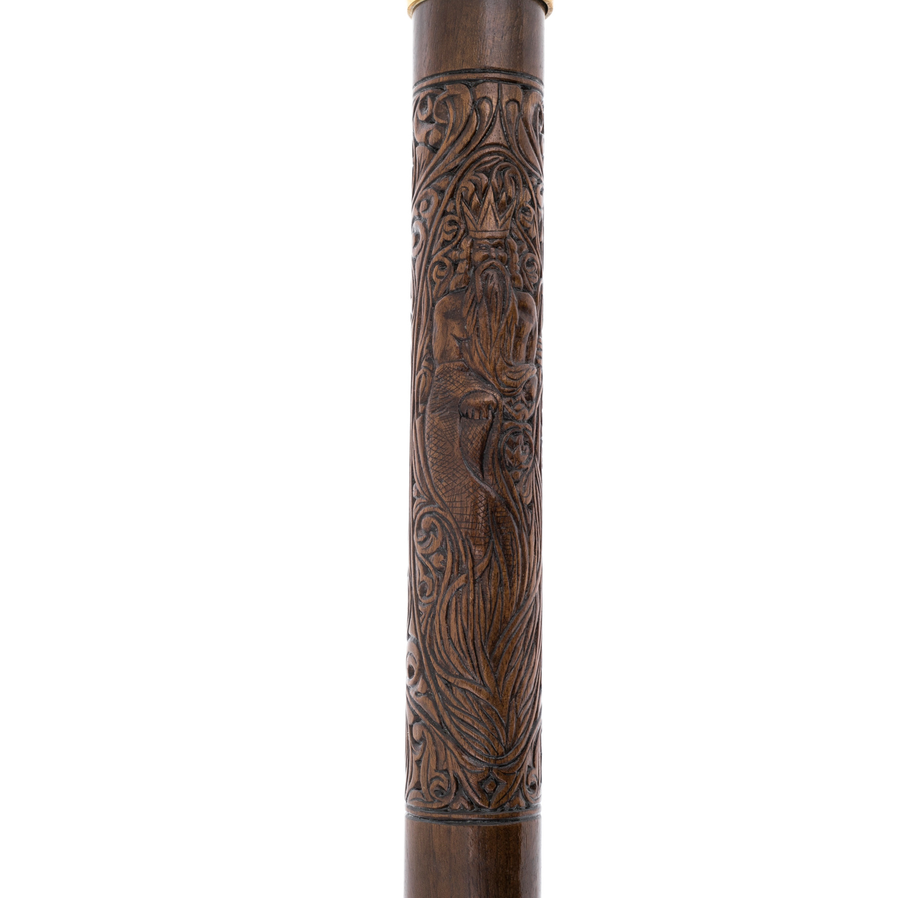 Трезубец из Златоуста — артефакт исключительного уровня, предназначенный для тех, кто способен оценить в одном предмете силу мифа, эстетику оружейного ремесла и символику власти. Основание выполнено из благородного дерева с резными элементами в виде морских божеств: на одной стороне — могучий повелитель океанов с трезубцем и короной, на другой — загадочная русалка с развевающимся хвостом. Верх венчает золотистый трезубец с тремя острыми лезвиями, украшенными растительным орнаментом и филигранной гравировкой. Все металлические детали инкрустированы вручную, а кольцевые обоймы покрыты узорами, напоминающими древние славянские плетёнки.