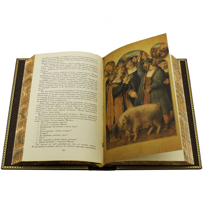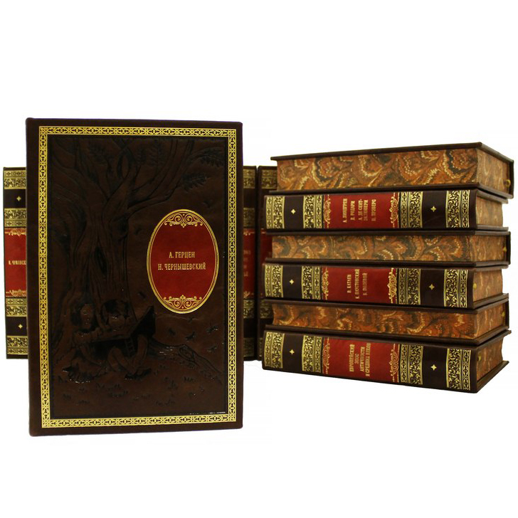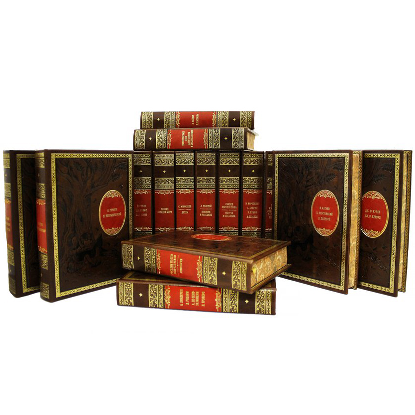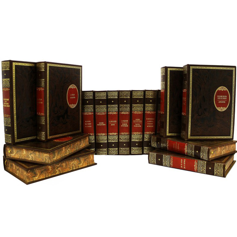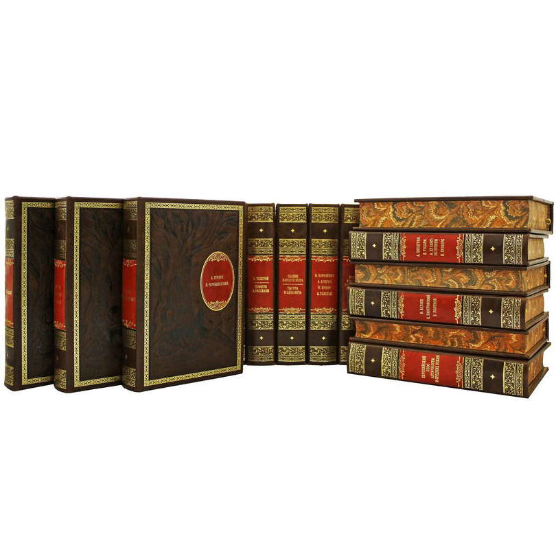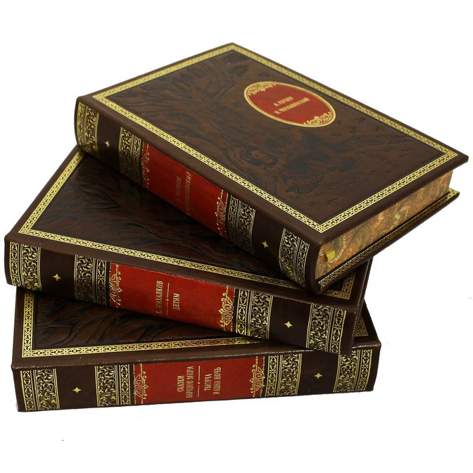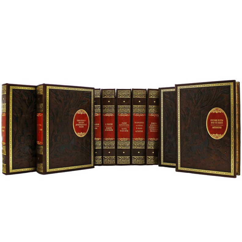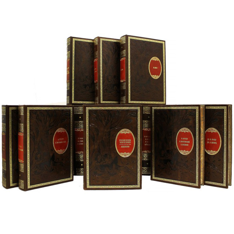 Исполнение: Оригинальный дизайн данного букинистического собрания представлен сочетанием цветного, блинтового и золотого тиснения, выполненных на высококачественной натуральной коже. Крашенный в тон переплетного материала обрез. Ляссе. Богато оформленные дюблюрами составные форзацы.