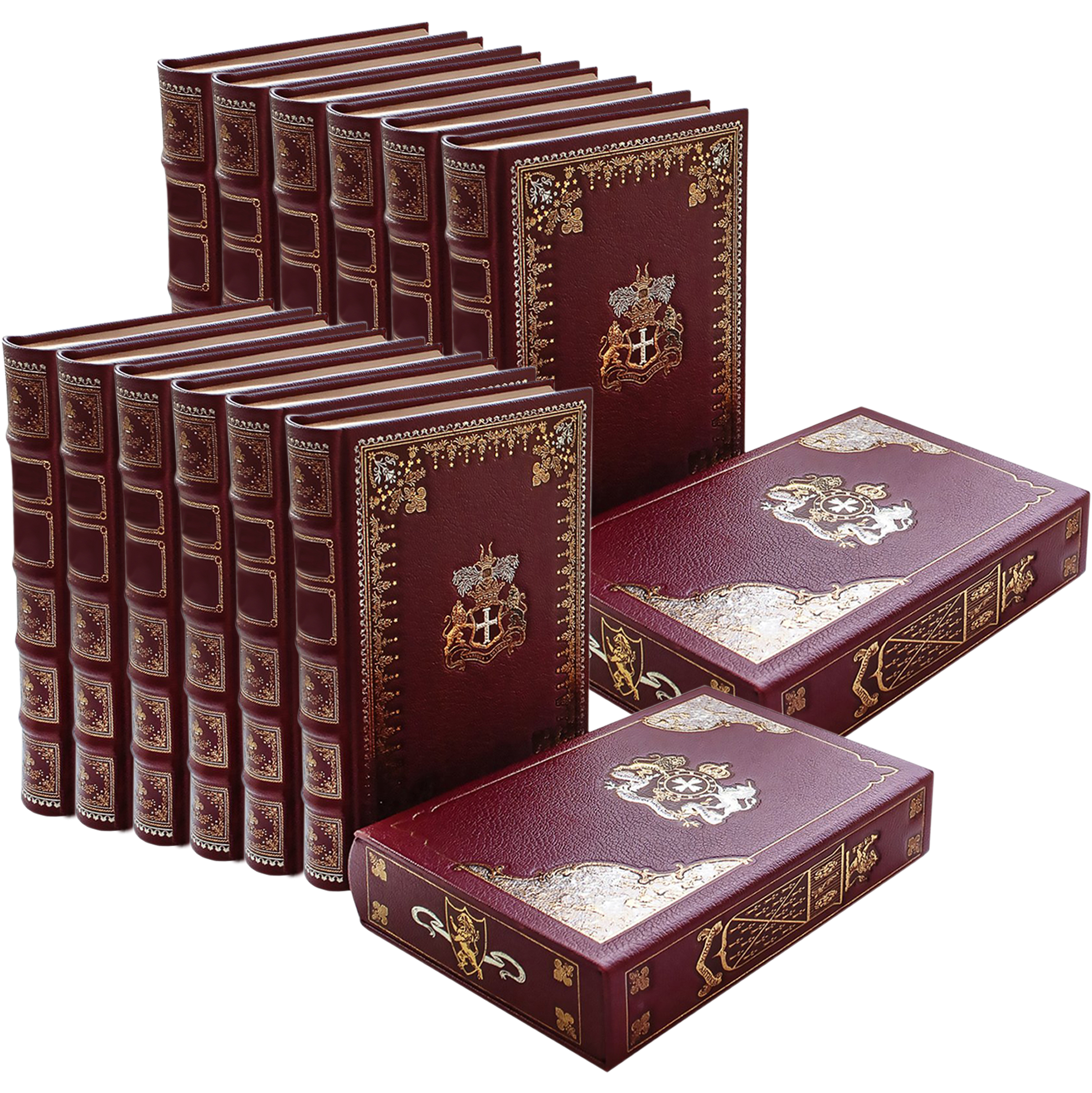Особенности оформления: все книги имеют трехсторонний золотой обрез и помещены в футляр из кожи ручной работы с тиснением фольгой на всех сторонках футляра. Тиснение — до 9 различных цветов фольги на обложке и футляре.