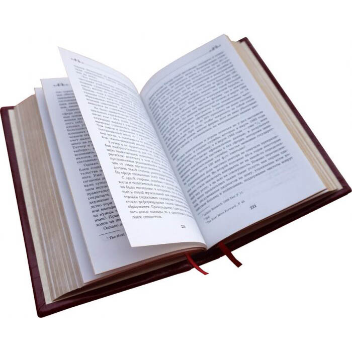 Особенности оформления: французский составной переплет ручной работы выполнен из комбинации натуральной кожи Pecora nera и Robbat Rossa, со вставками из козьей кожи Grande oro производства итальянской кожевенной фабрики Claudio. Обложка книги оформлена глубоким блинтовым тиснением и комбинацией рельефного тиснения, с использованием золотой фольги Luxor 240 и черной фольги Schwarz, а также декорирована объемным шрифтом ручного тиснения, с росписью сусальным золотом в 24 карата. Обрез блока вручную полирован и позолочен сусальным золотом.