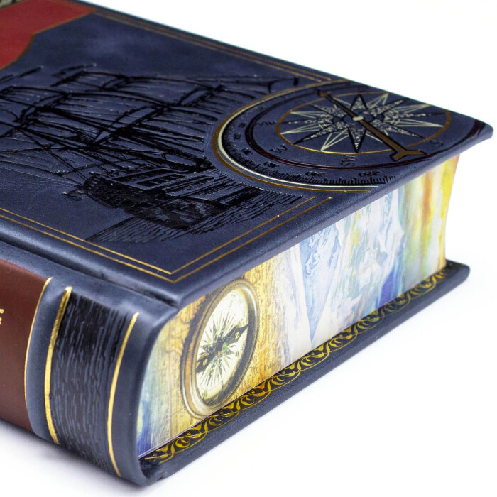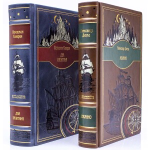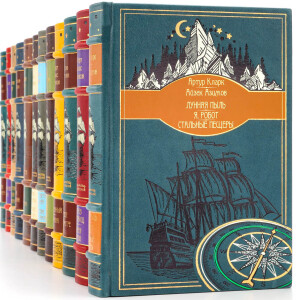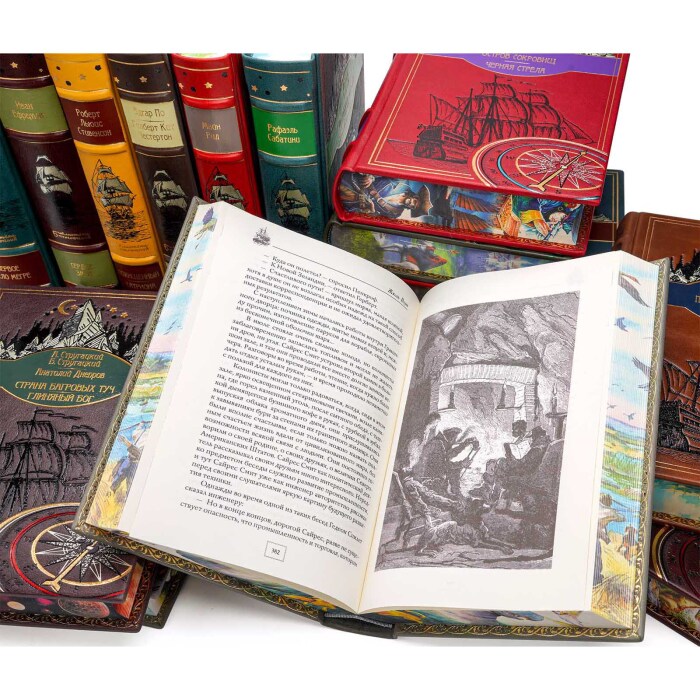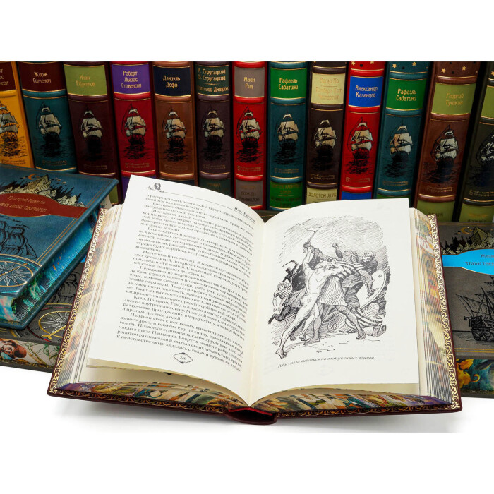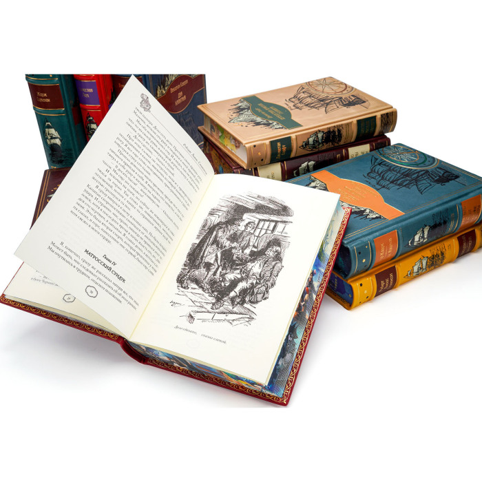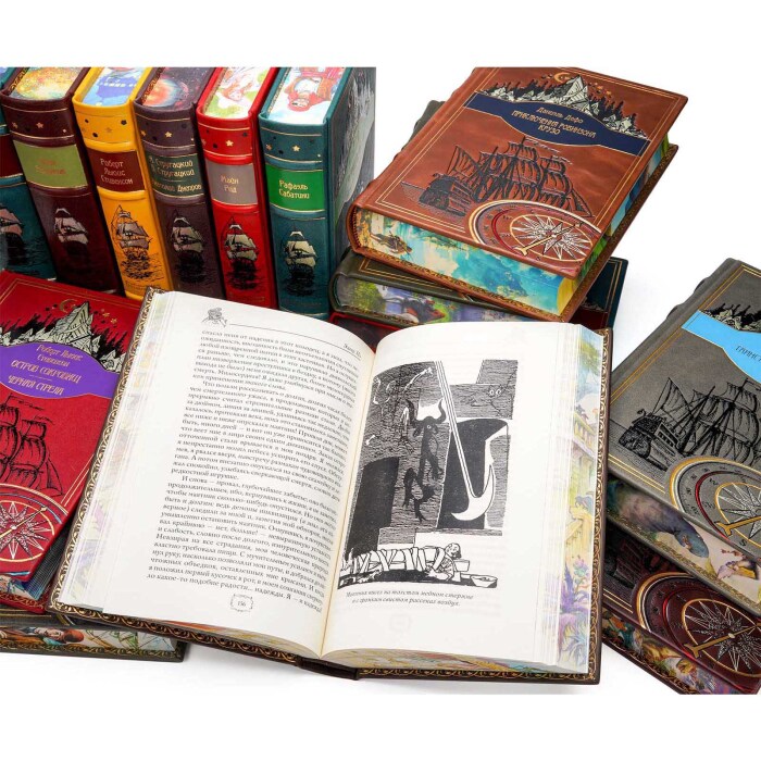 Иллюстрированное издание, сборник популярных авторов и произведений в жанре приключения. Книги для библиотеки в кожаном переплете. Многотомное издание, художественный стиль кожаного переплета, многообразие цветовых стилей в оформлении. Книги отпечатаны на дизайнерской бумаге тёпло бежевого оттенка, производство Италия.