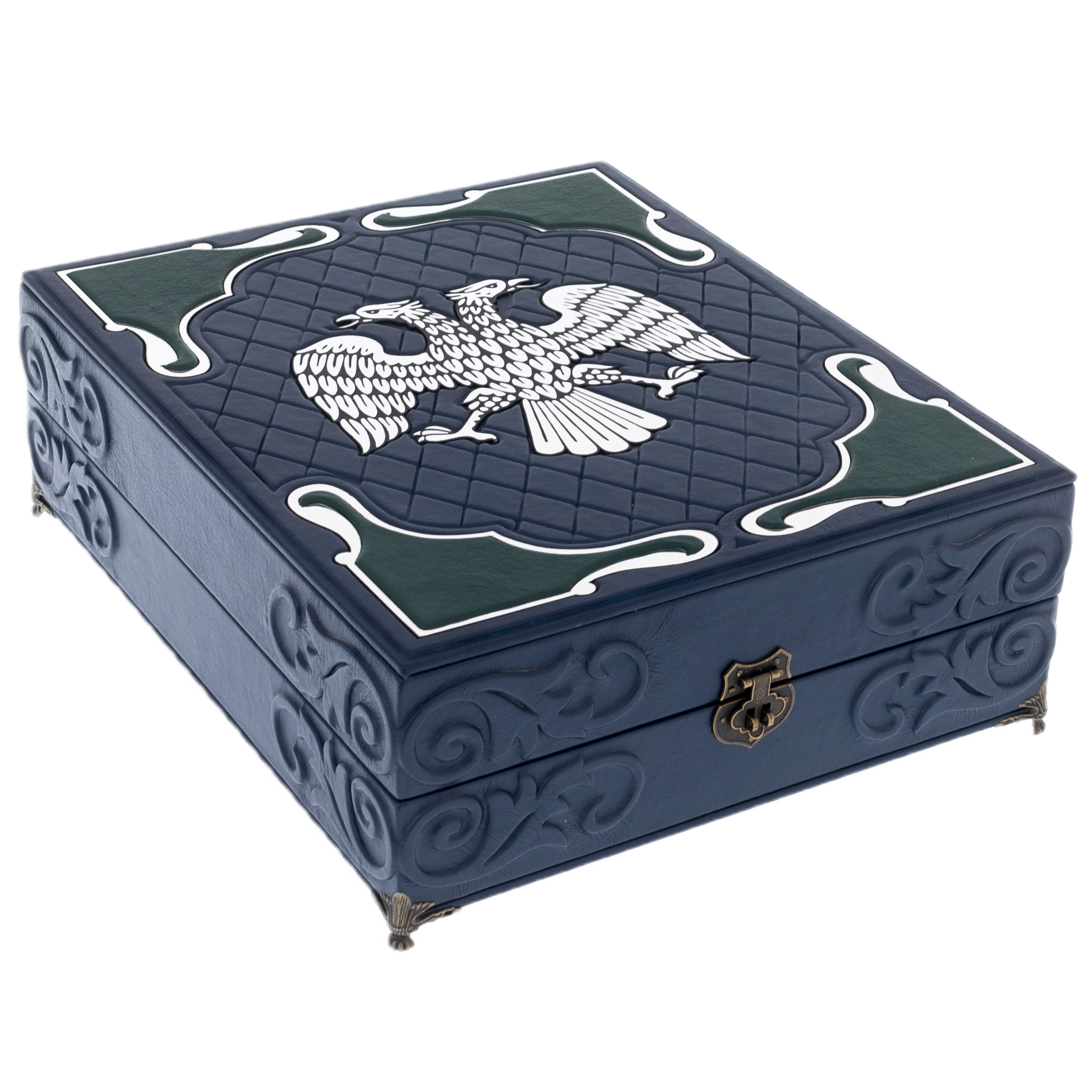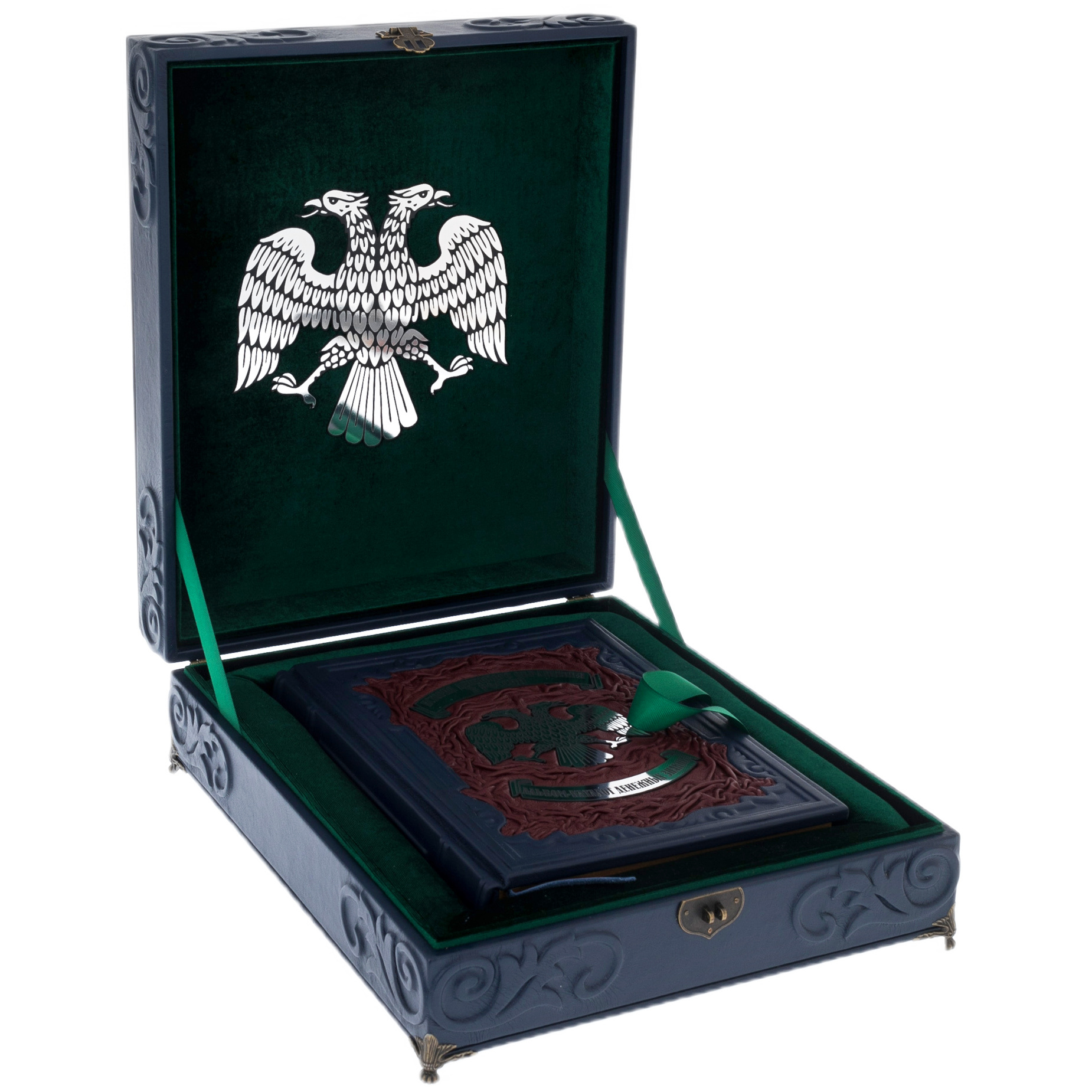 Особенности оформления: мелованная бумага, цельнокожаный переплет ручной работы, рельефные узоры и тиснение, вставки из бронзы, обрез полированный и золоченый; короб выполнен в едином стиле с книгой, внутри покрыт бархатом.