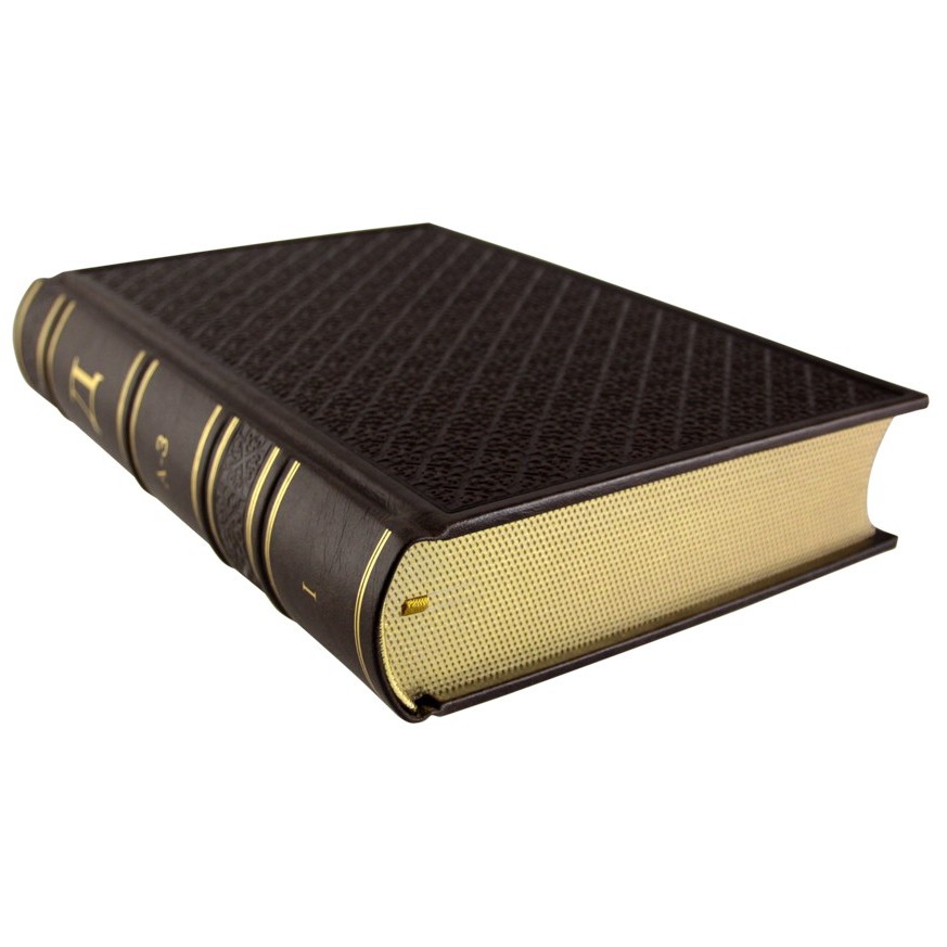 Исполнение: Переплёт ручной работы из натуральной кожи. Форзац из дизайнерской бумаги. 4 бинта на корешке, ручной обработки. Каптал золотой из натуральной кожи. Обрез блока торшонированный золотой. Тиснение блинтовое и золотой фольгой. Ляссе.