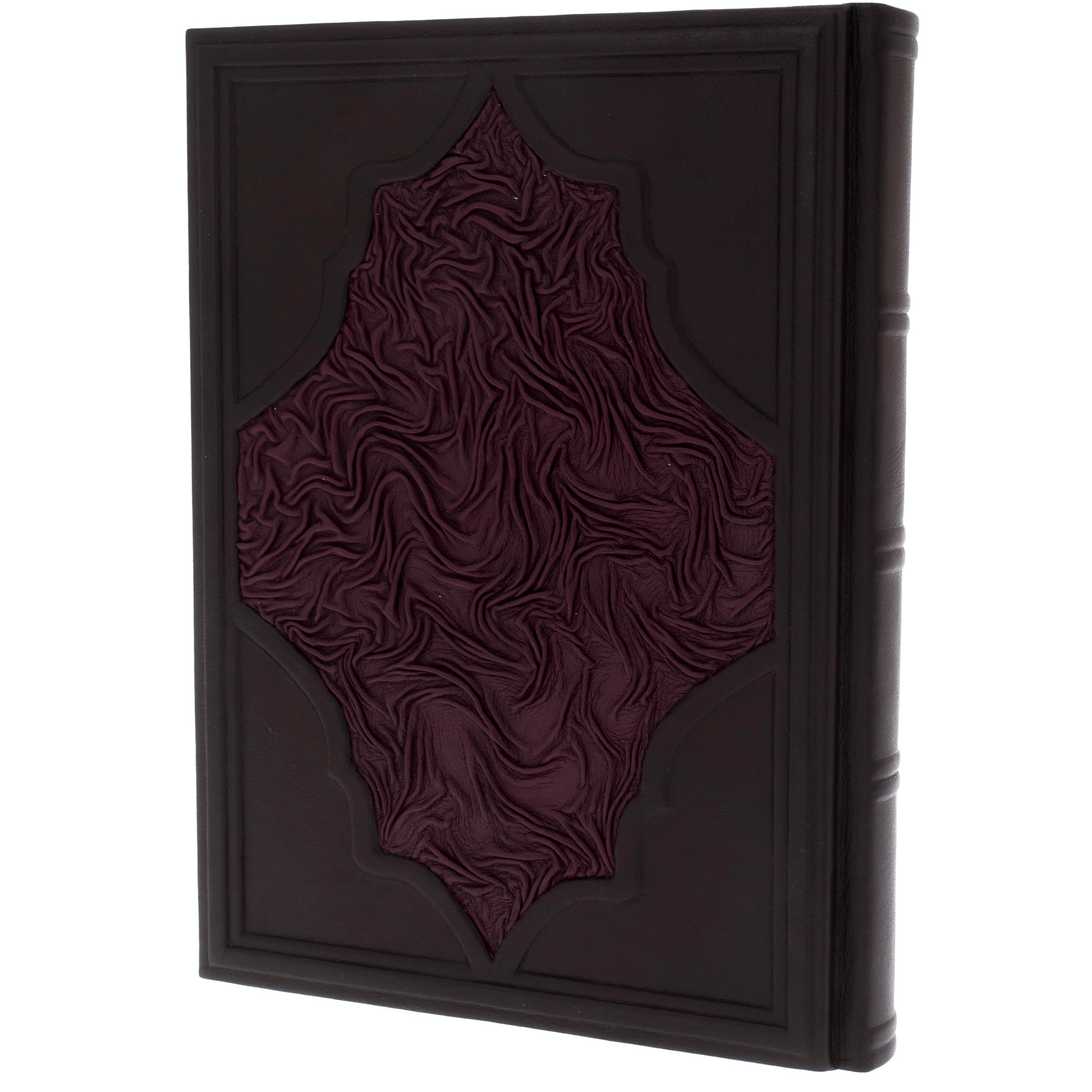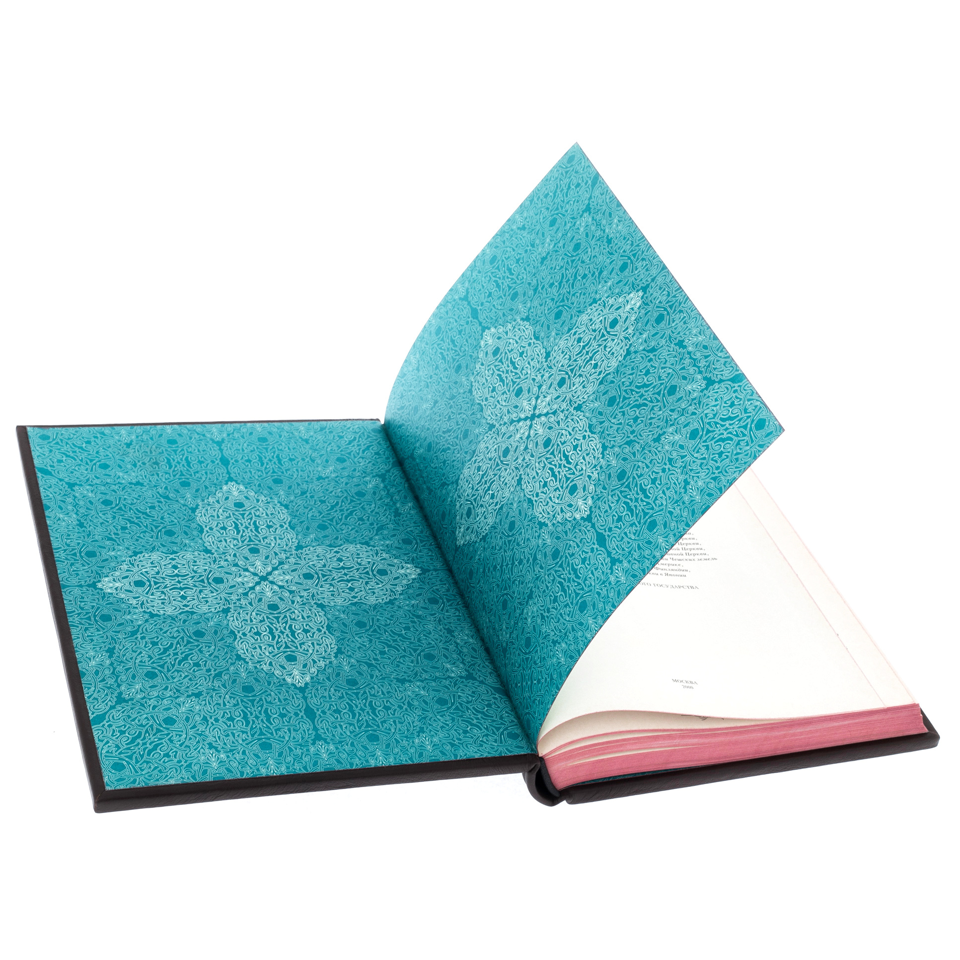 Материалы:цельнокожаный переплет ручной работы, крашеный обрез, мелованная бумага, вставка - пластик.