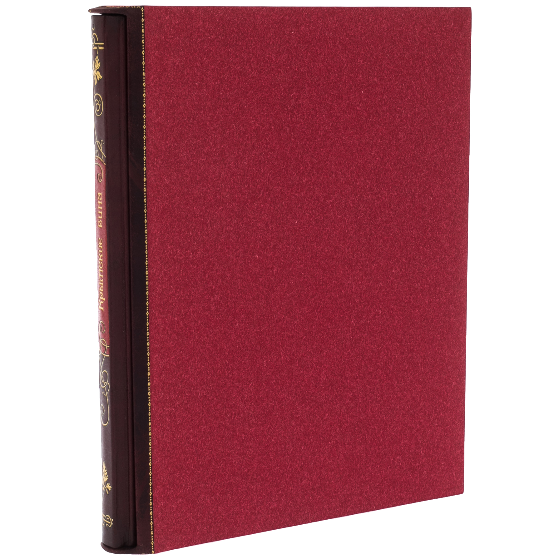 Исполнение:цельнокожаный переплёт из застаренной вручную кожи, вставки из красной шагреневой кожи, художественное тиснение тремя цветами фольги. Обрез позолочен с двух сторон, сверху окрашен и гравирован вручную. Форзац выполнен из мраморной бумаги ручного крашения; по периметру окатан вручную бордюрным орнаментом. Индивидуальный футляр с кожаной окантовкой.