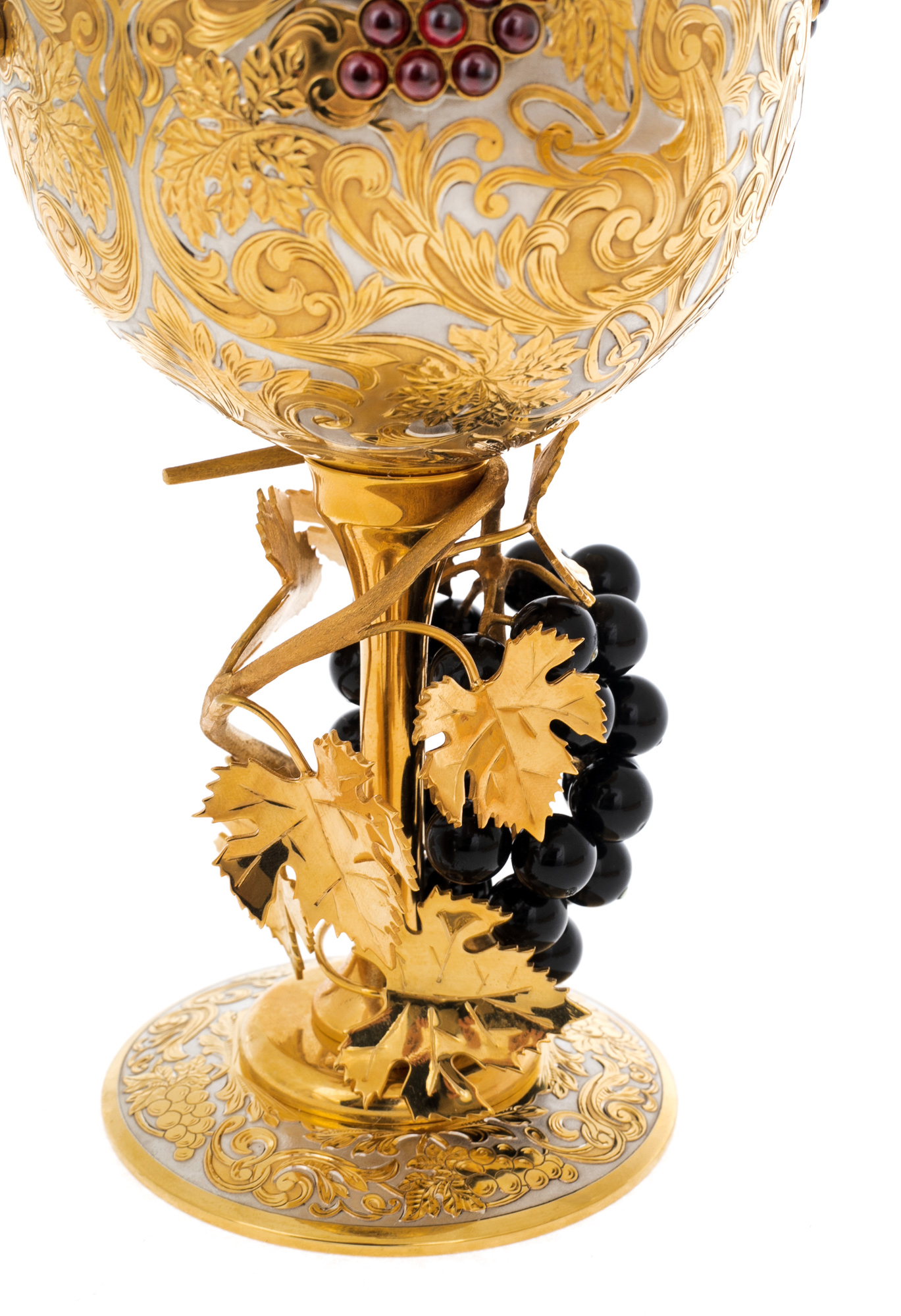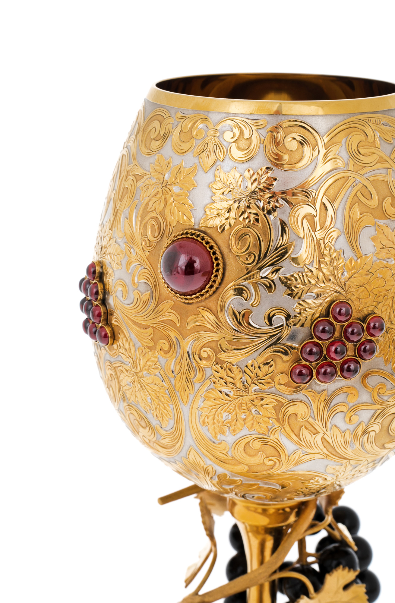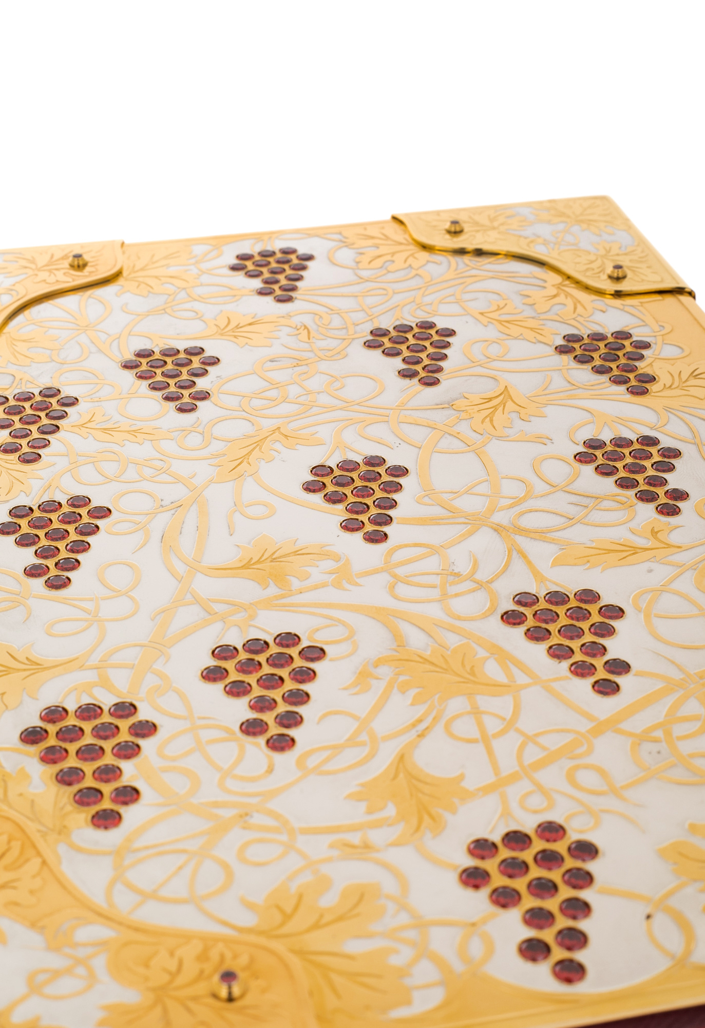 Техника исполнения:многоступенчатый цикл нанесения художественной гравюры: рисовка кистью, травление, гравировка иглой и резцом, никелирование, золочение. Инкрустация камнями. Декоративные элементы выполнены методом ручной резьбы по металлу.