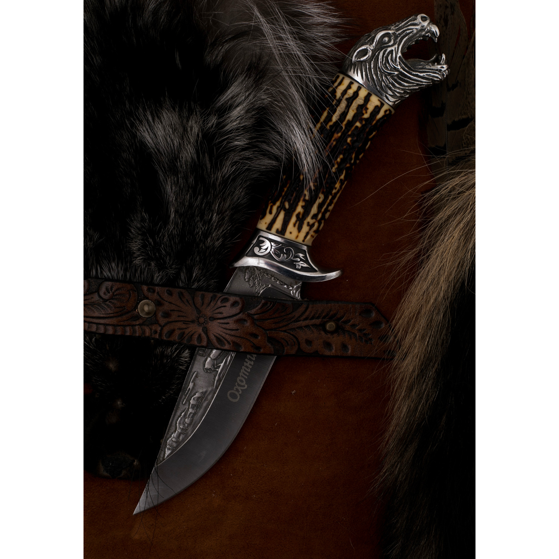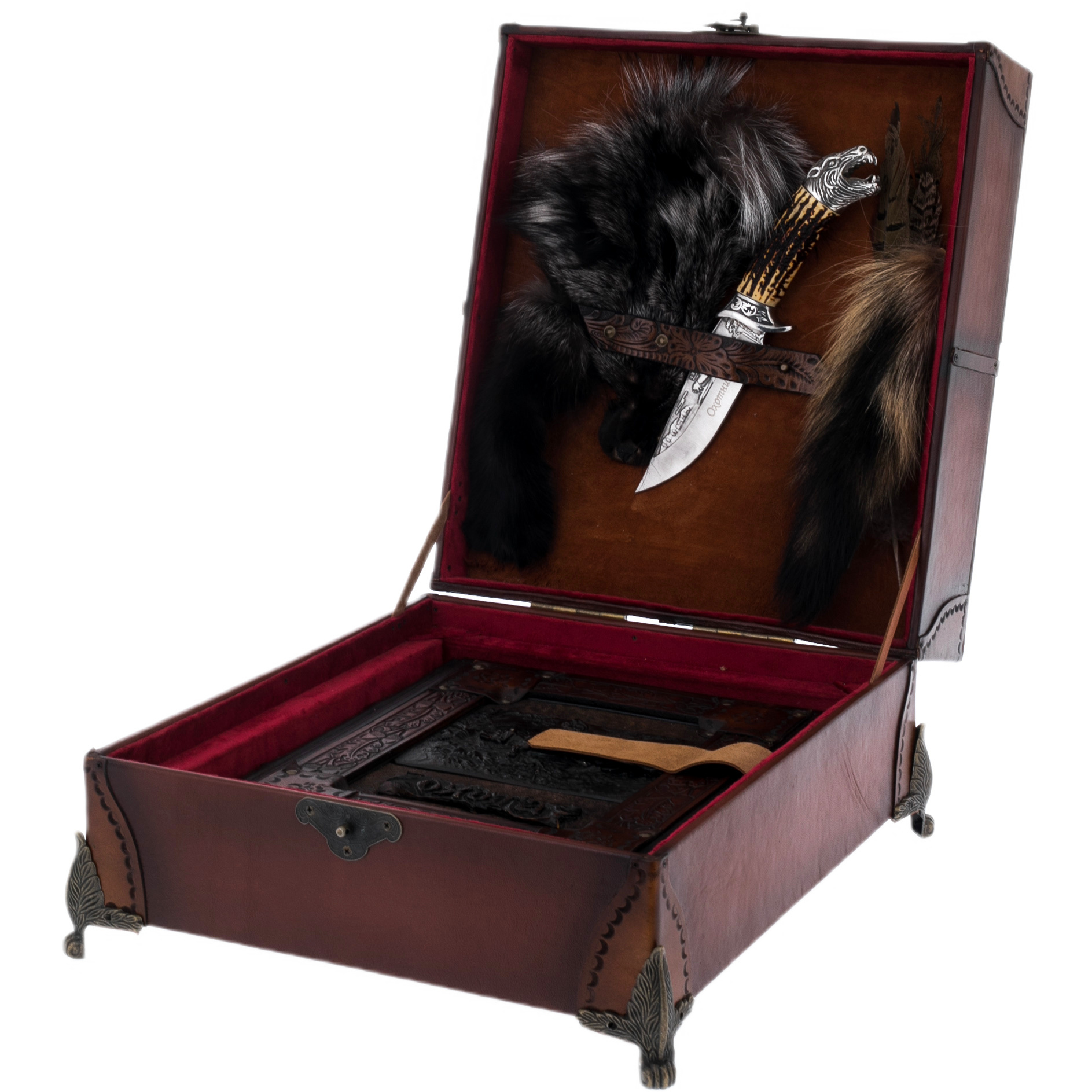 Материалы: нож - сталь 65Х13, орех; короб - бархат, кожа, латунь, натуральный мех.