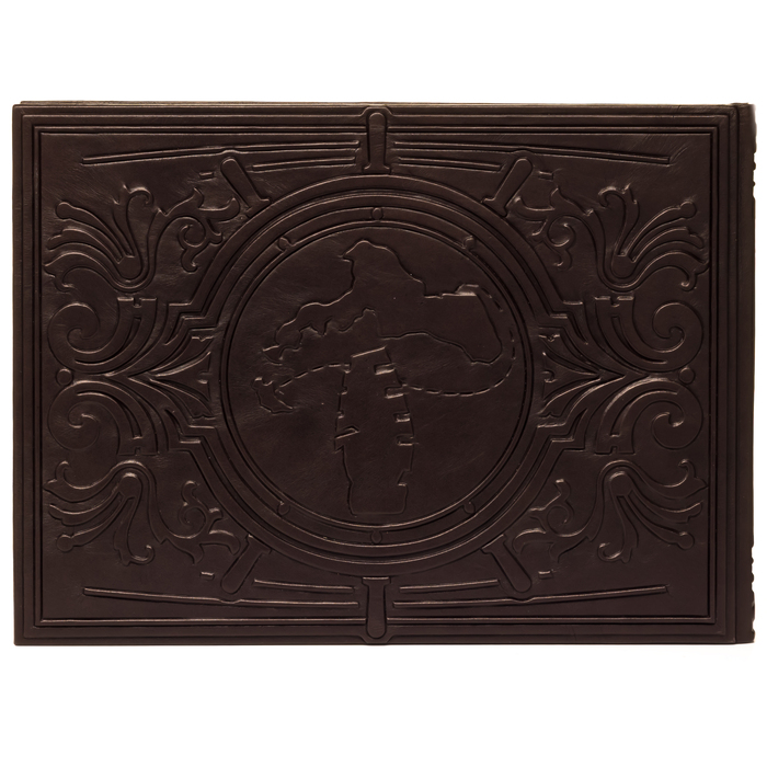 Особенности оформления: мелованная бумага; кожаный переплет ручной работы; обложка книги оформлена рельефным тиснением, а также декорирована вставками из металлопласта, фианитами; обрез книги вручную полирован и окрашен.