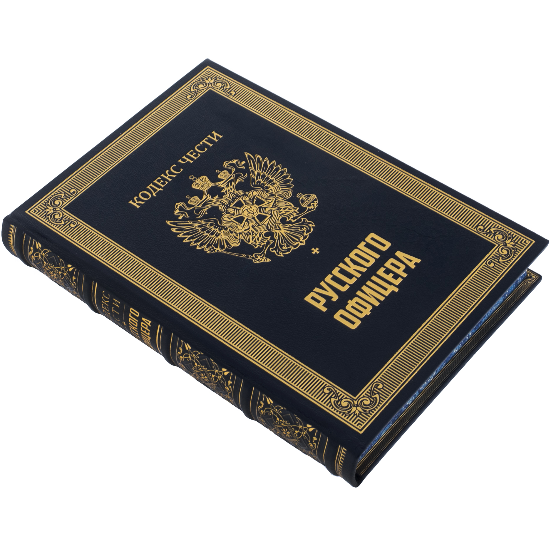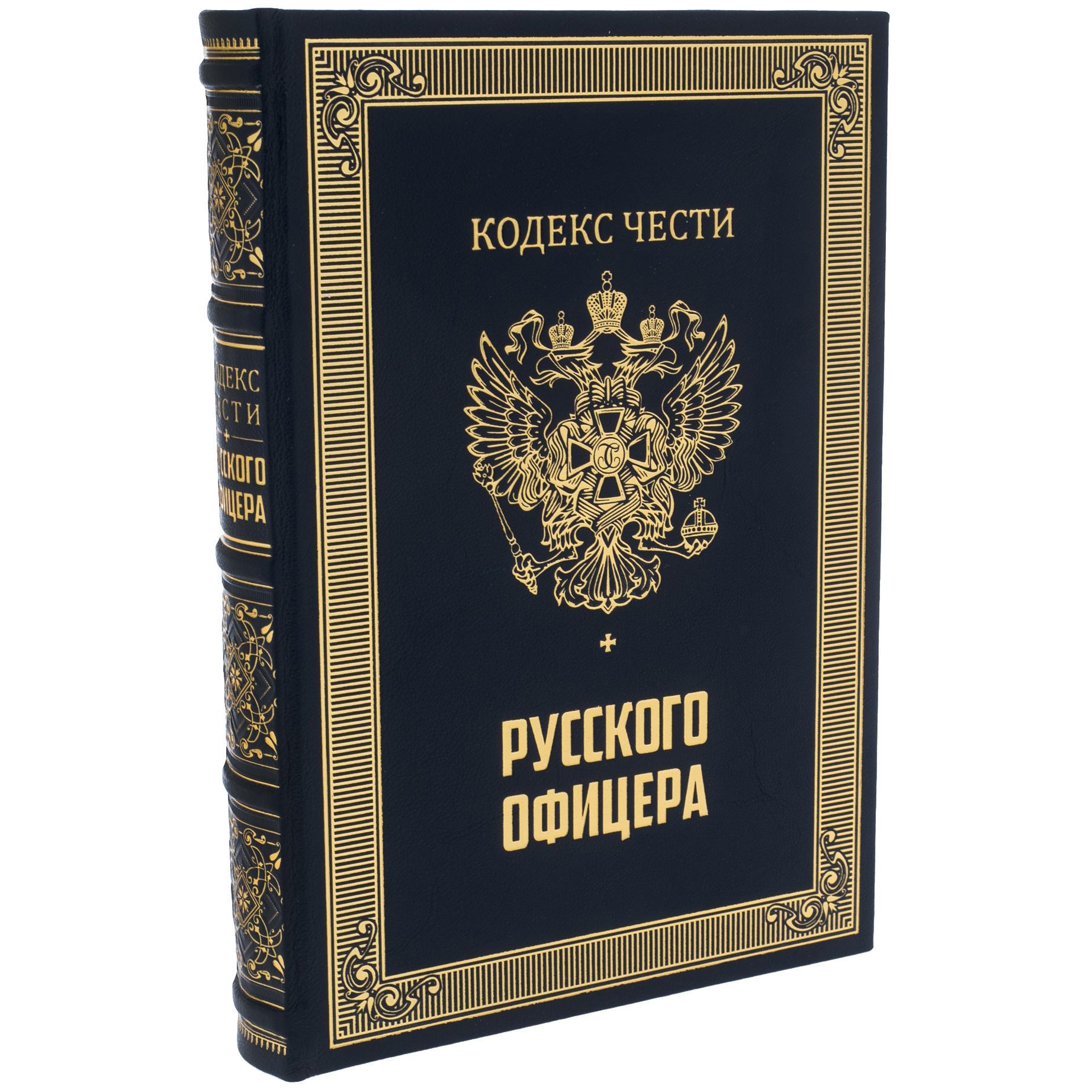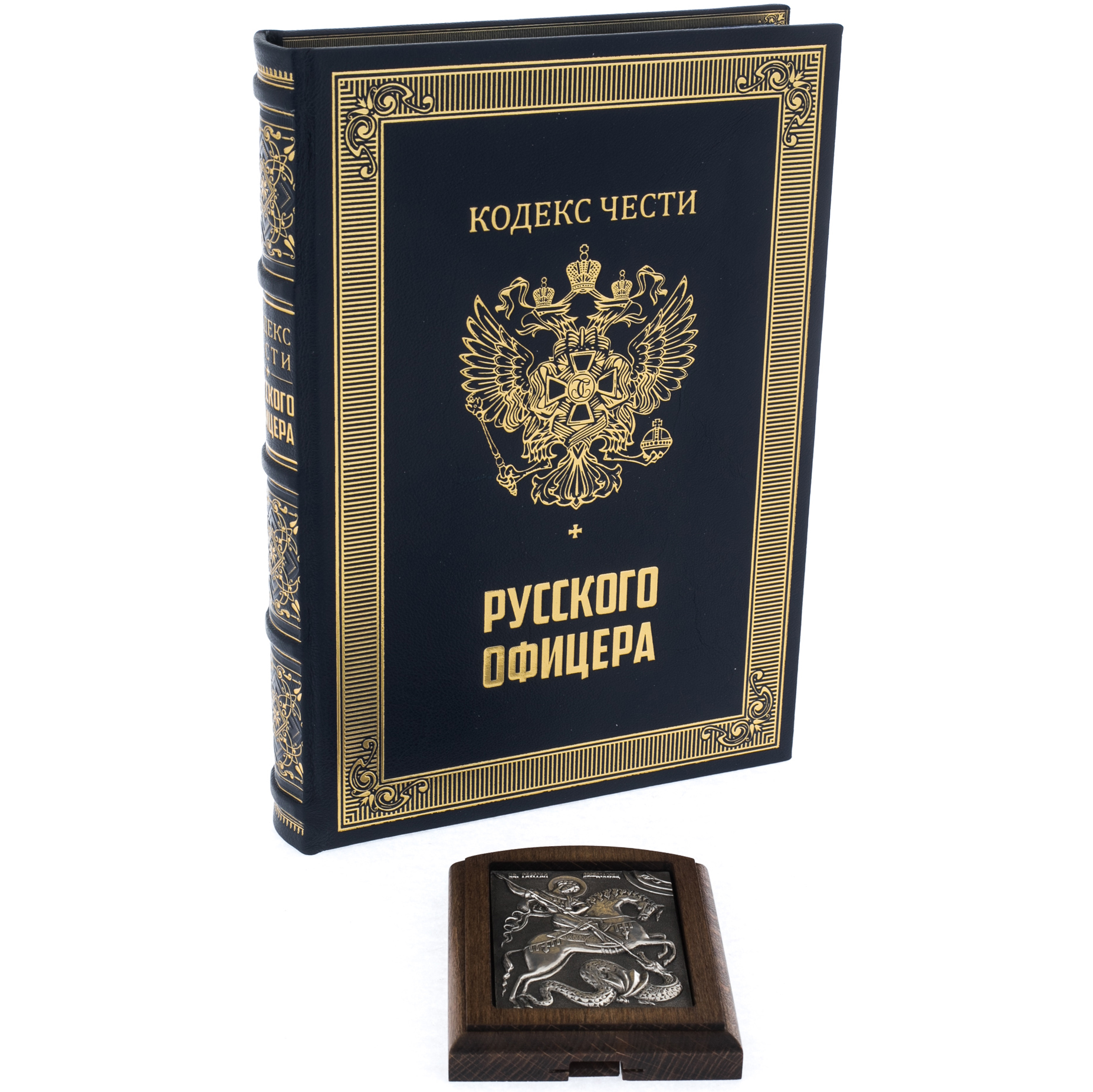 Особенности оформления:оригинальный подарочный набор включает в себя книгу в кожаном переплете «Кодекс чести русского офицера» и икону «Св. Георгий Победоносец», оформленных в деревянной коробке, обтянутой кожей. Подарочное издание в цельнокожаном переплете ручной работы; золотое тиснение, блинт, крашенный в тон переплетного материала обрез, ляссе; богато оформленные дюблюрами составные форзацы; икона выполнена методом гальванопластики с серебрением поверхности, в сочетании с деревянной основой.