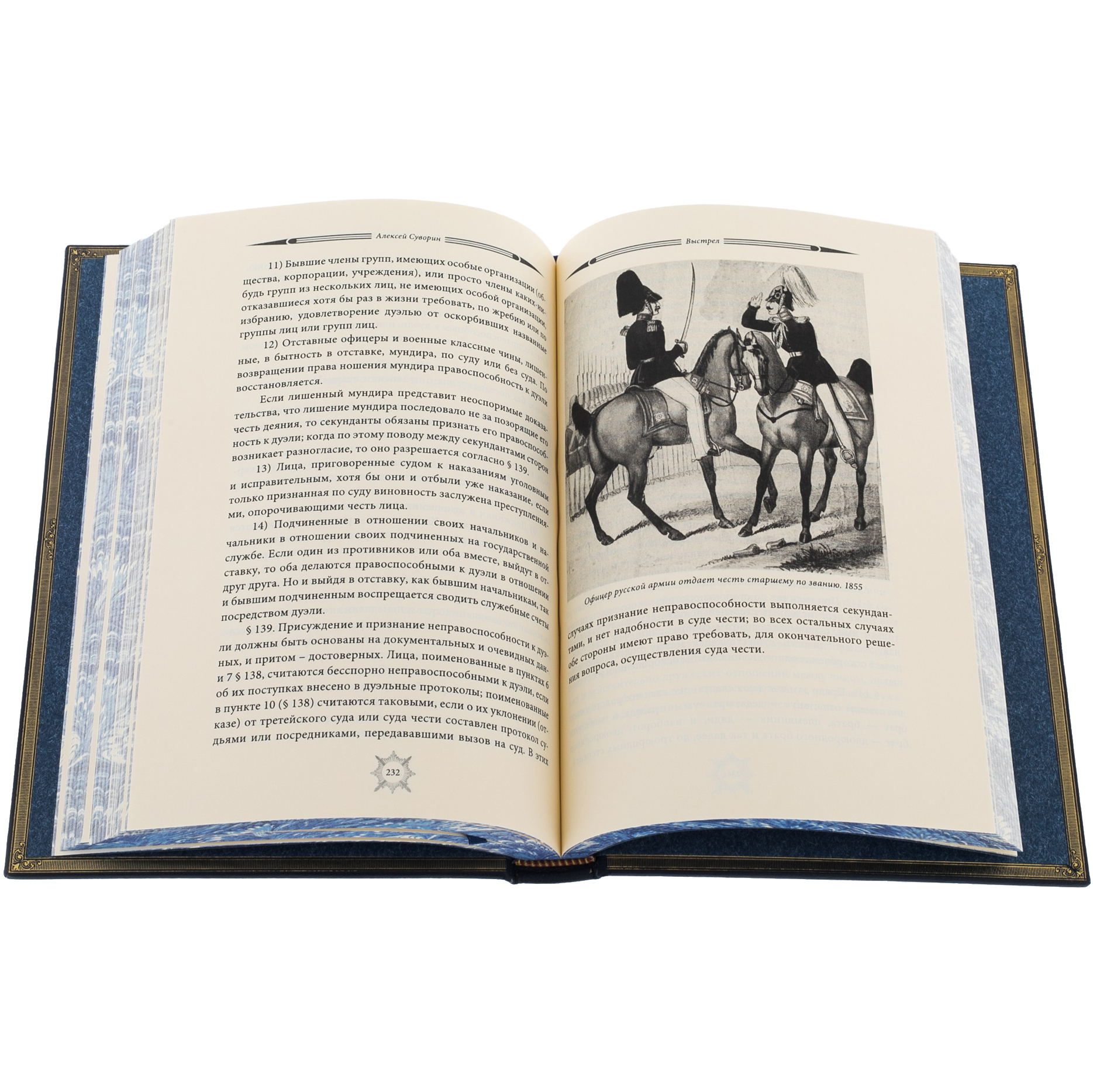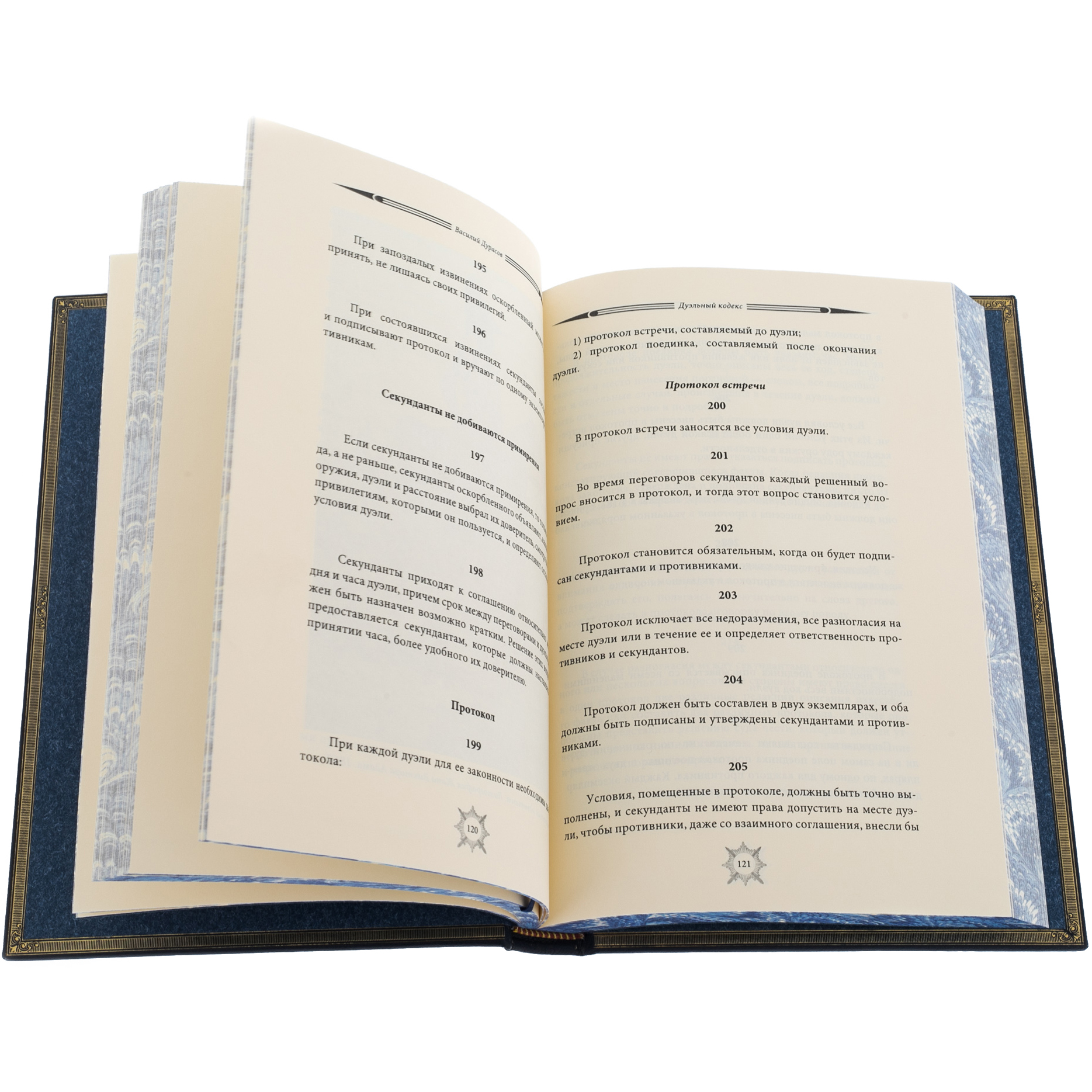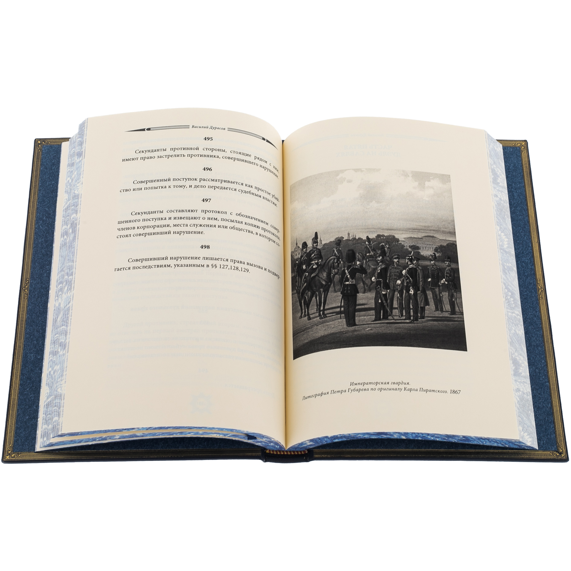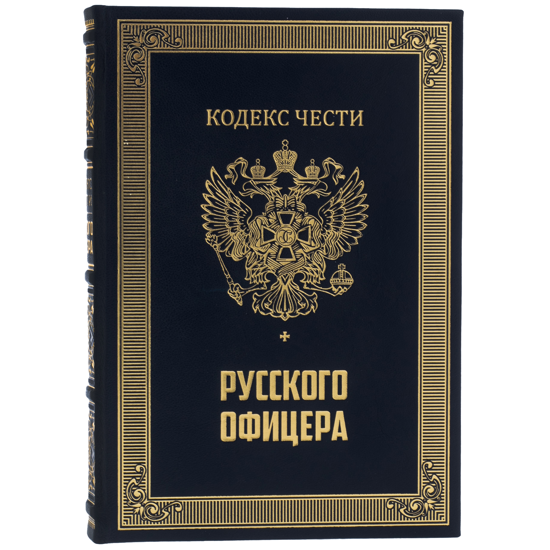 Особенности оформления:оригинальный подарочный набор включает в себя книгу в кожаном переплете «Кодекс чести русского офицера» и икону «Св. Георгий Победоносец», оформленных в деревянной коробке, обтянутой кожей. Подарочное издание в цельнокожаном переплете ручной работы; золотое тиснение, блинт, крашенный в тон переплетного материала обрез, ляссе; богато оформленные дюблюрами составные форзацы; икона выполнена методом гальванопластики с серебрением поверхности, в сочетании с деревянной основой.