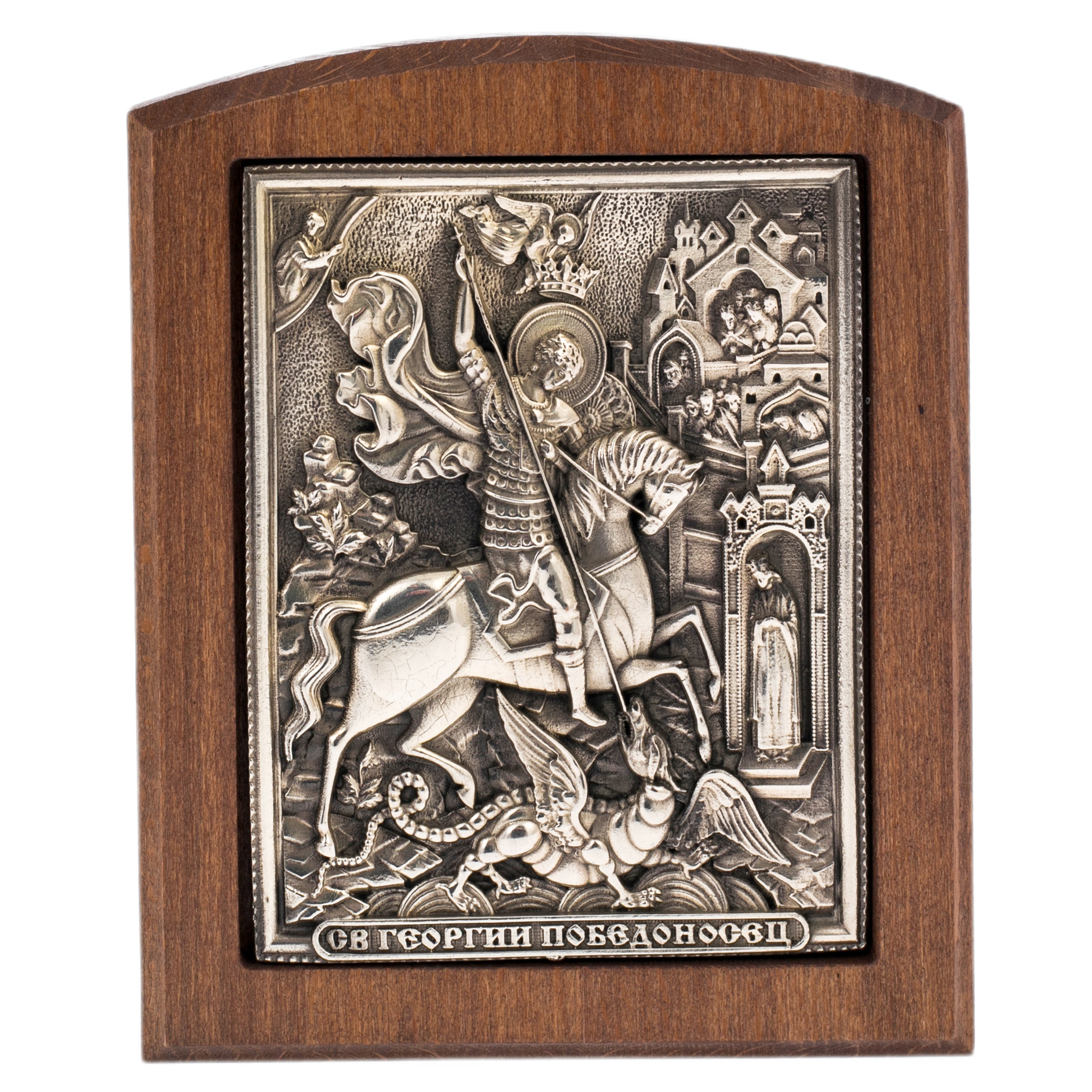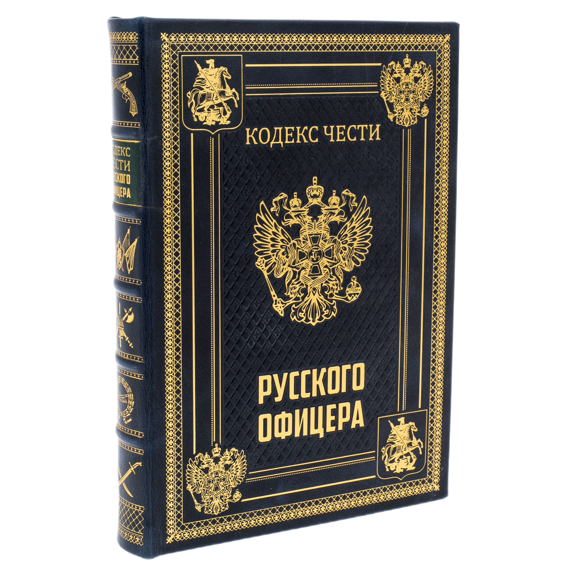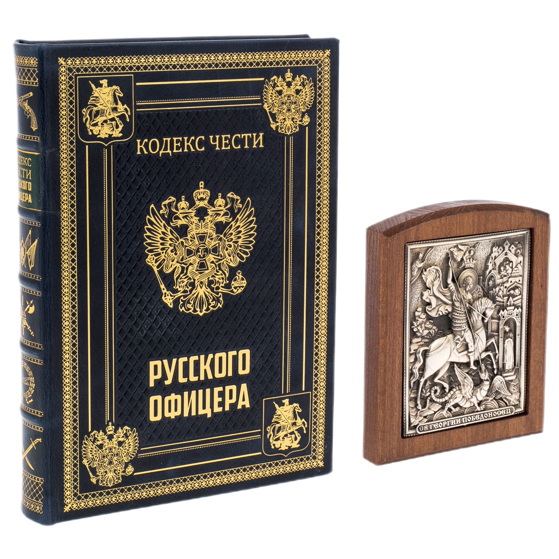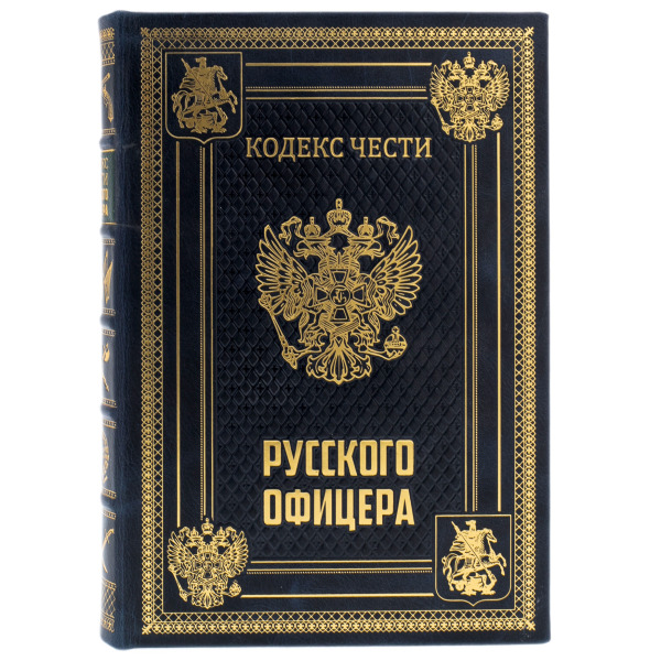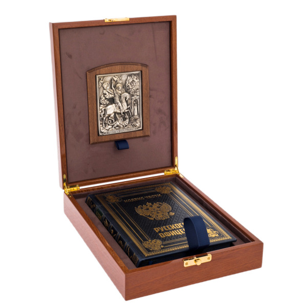 Оригинальный подарочный набор включает в себя книгу в кожаном переплете «Кодекс чести русского офицера» и икону «Св. Георгий Победоносец», оформленных в лакированной шкатулке, покрытой рояльным лаком и украшена золотым гербом из металлостикера.