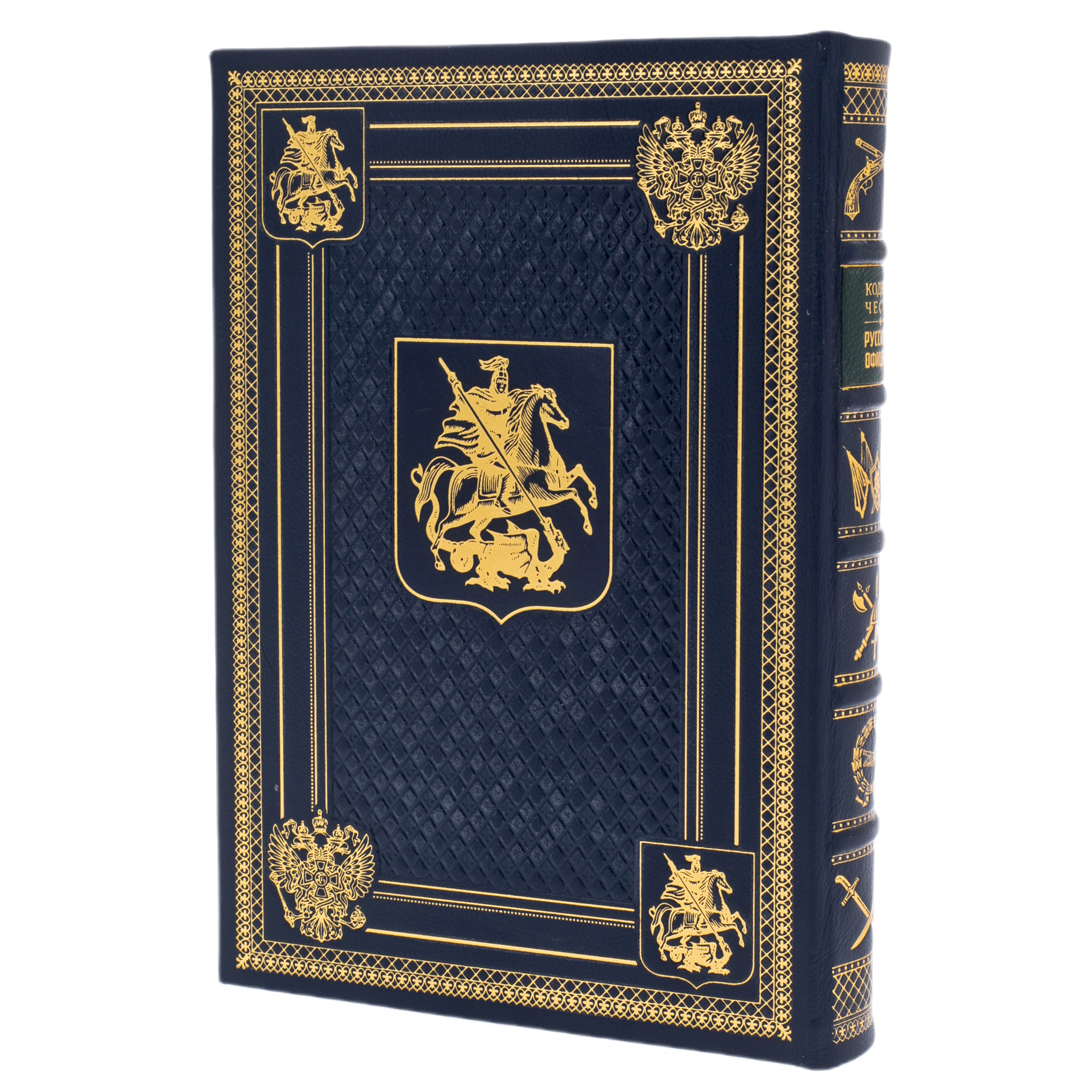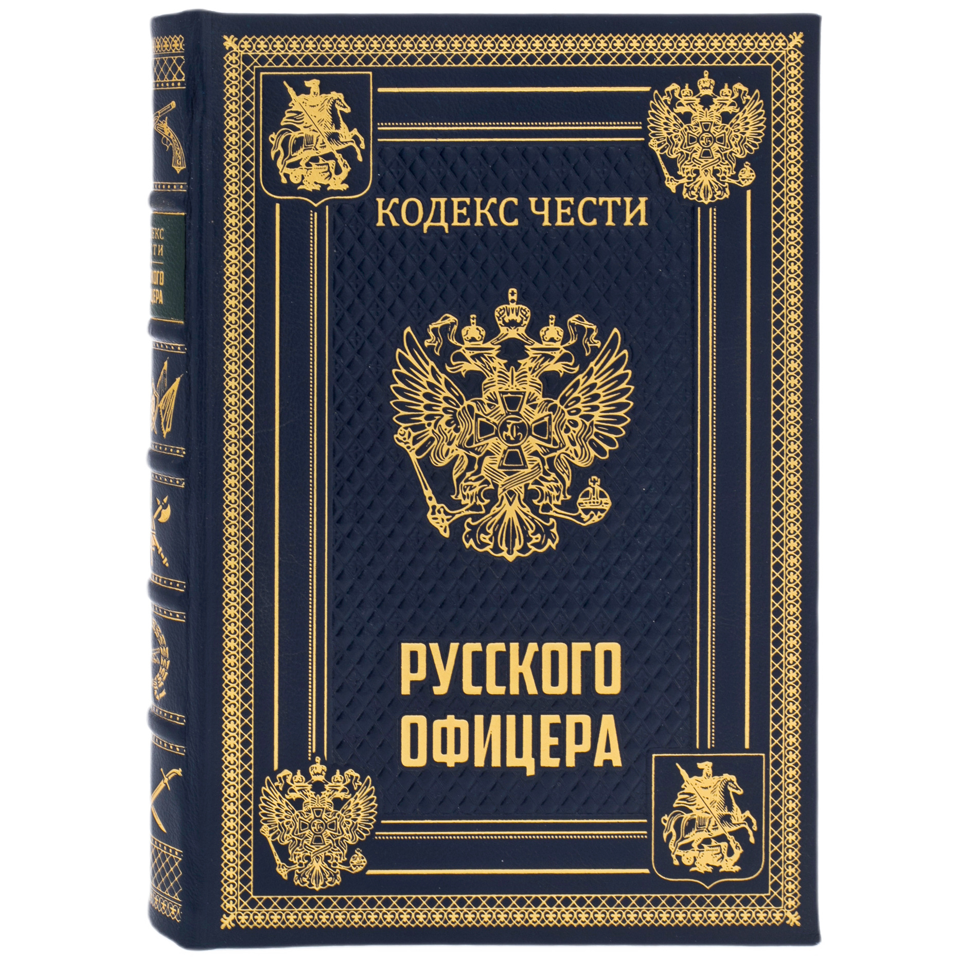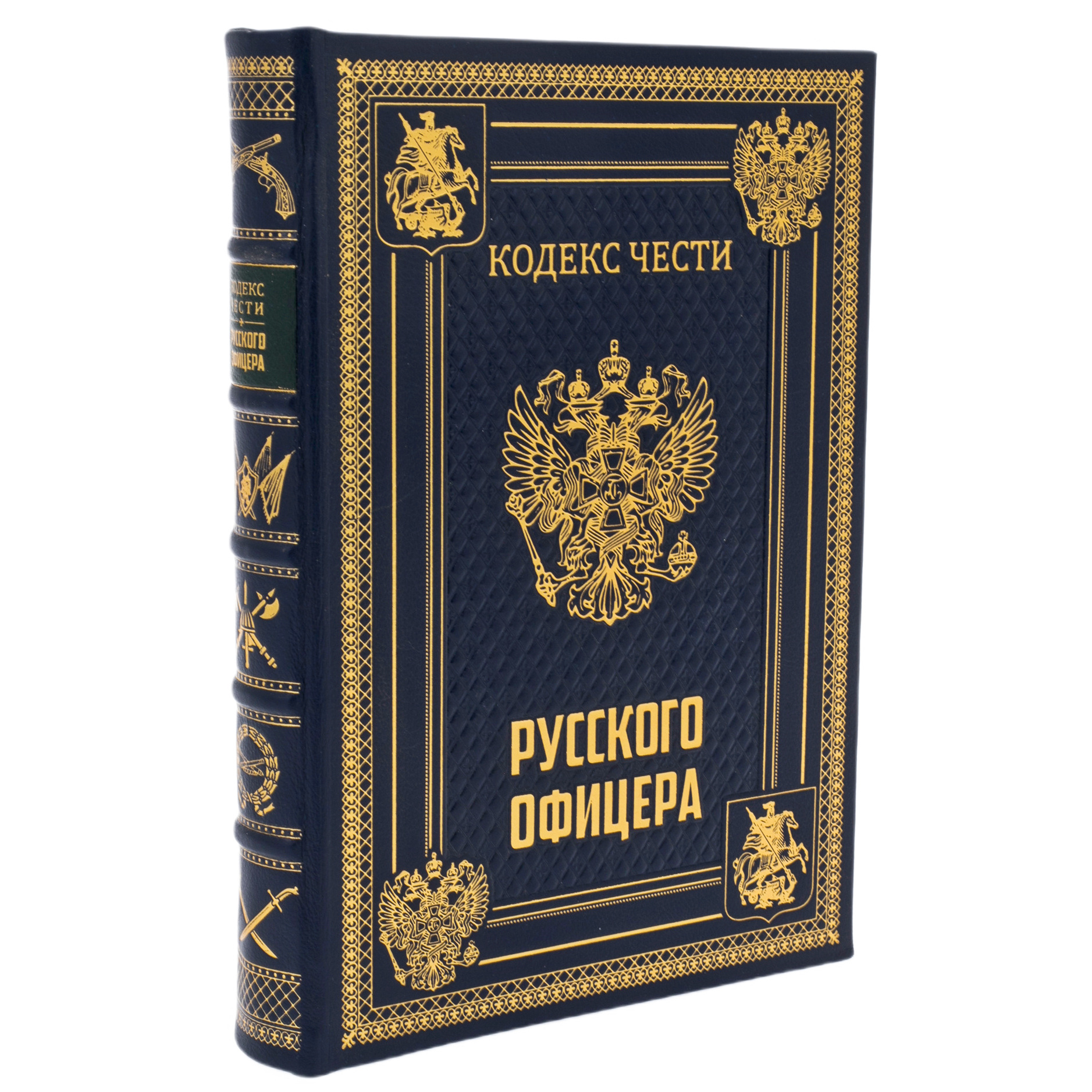 Особенности оформления:оригинальный подарочный набор включает в себя книгу в кожаном переплете «Кодекс чести русского офицера» и икону «Св. Георгий Победоносец», оформленных в деревянной лаковой коробке. Подарочное издание в цельнокожаном переплете ручной работы; золотое тиснение, блинт, крашенный в тон переплетного материала обрез, ляссе; богато оформленные дюблюрами составные форзацы; икона выполнена методом гальванопластики с серебрением поверхности, в сочетании с деревянной основой.
