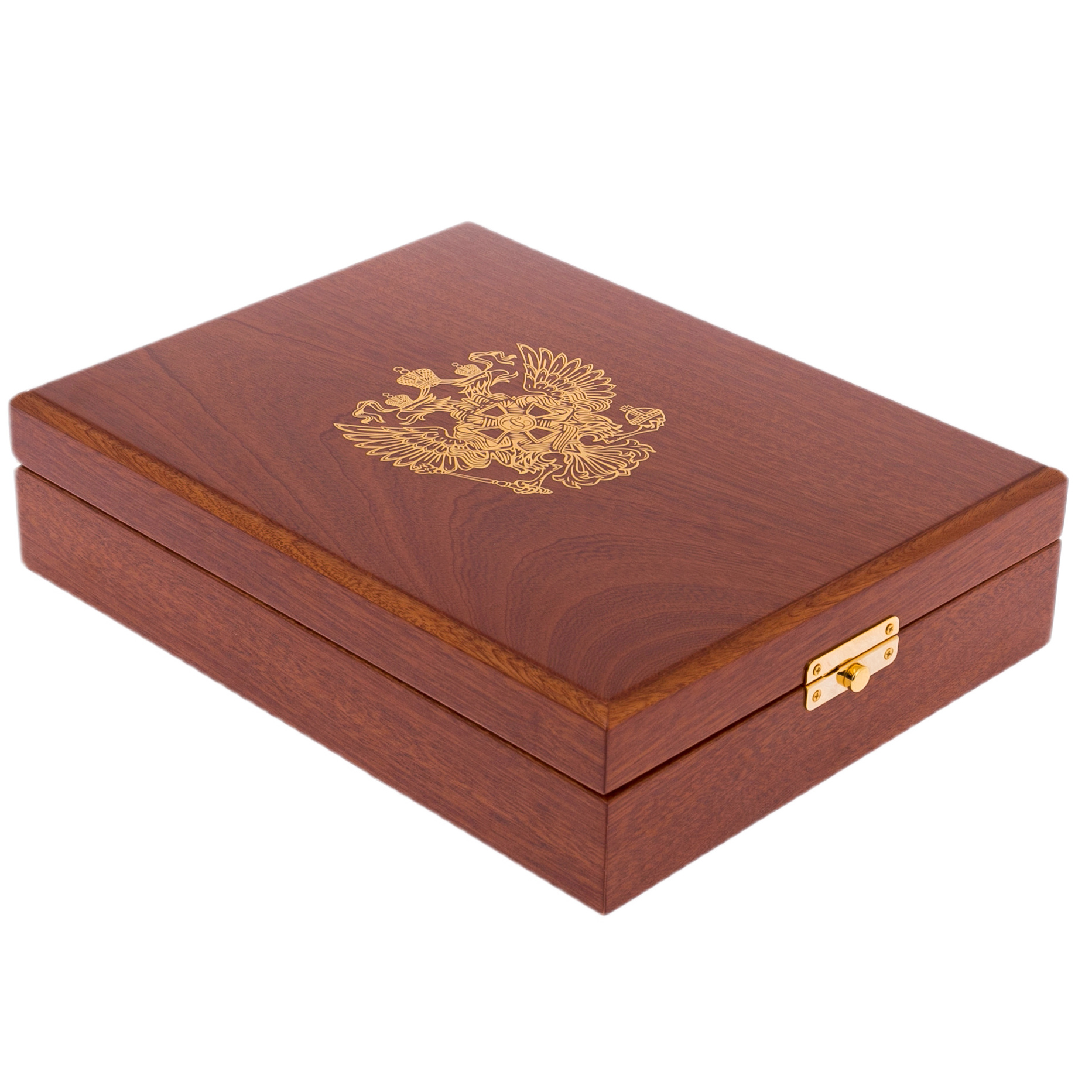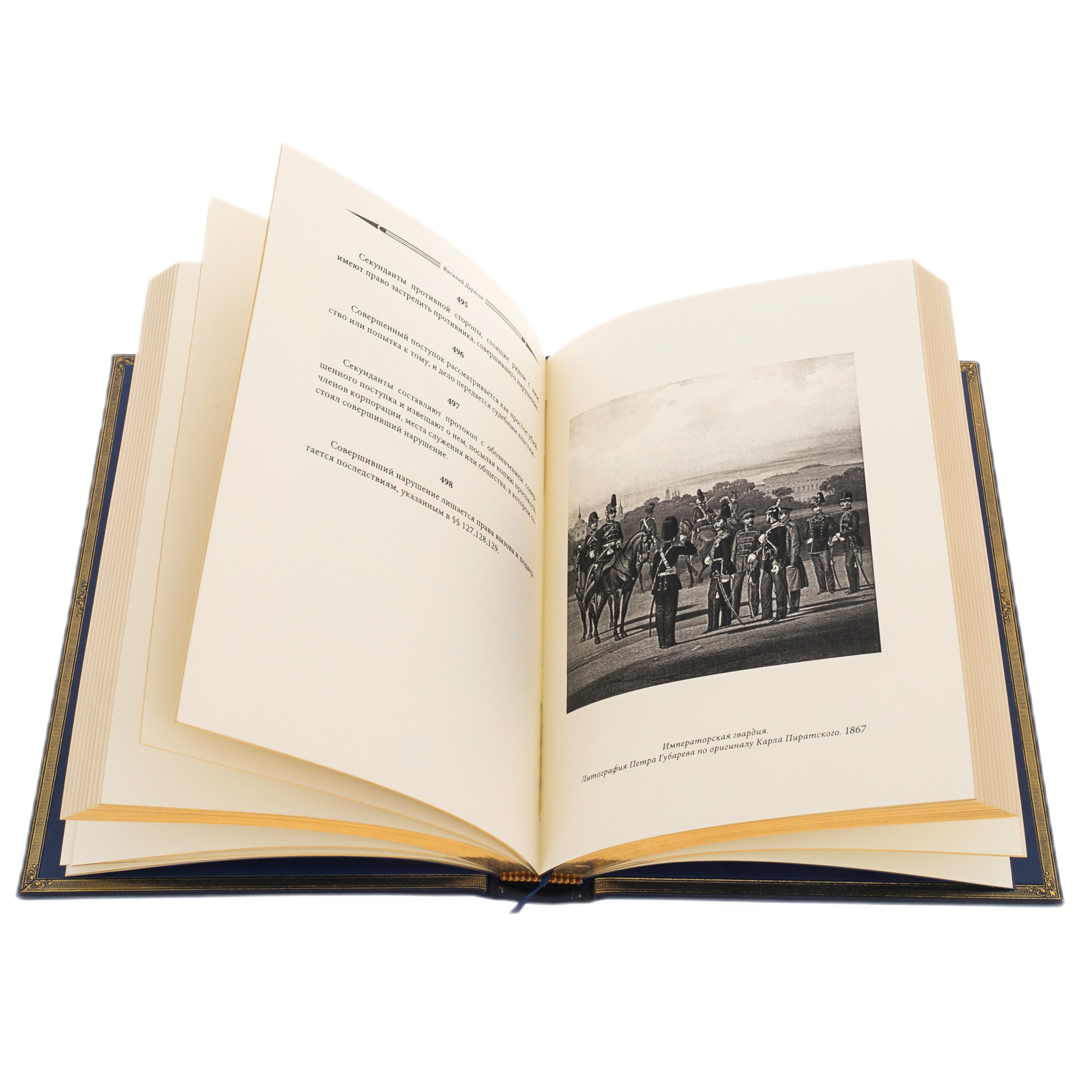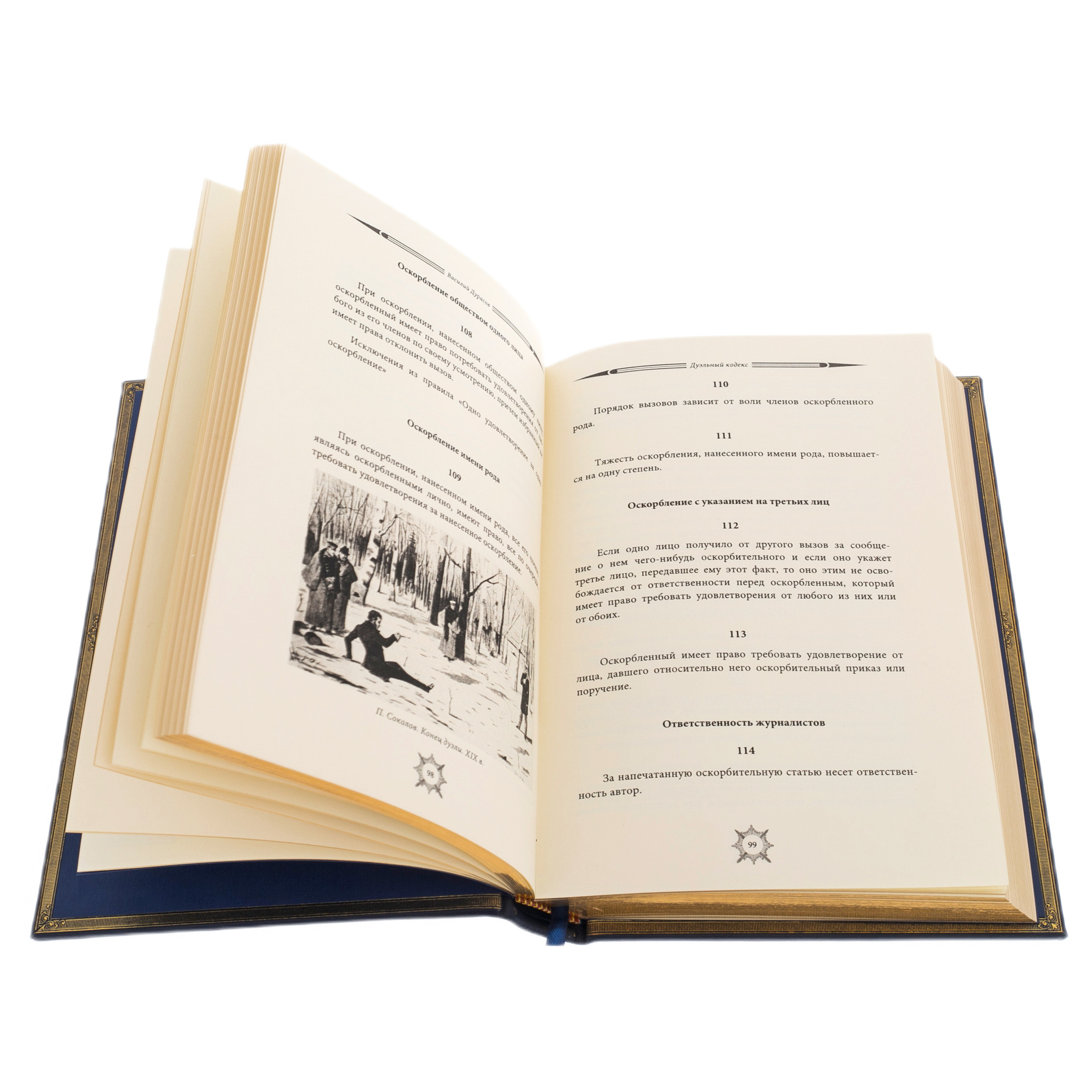Особенности оформления:оригинальный подарочный набор включает в себя книгу в кожаном переплете «Кодекс чести русского офицера» и икону «Св. Георгий Победоносец», оформленных в деревянной лаковой коробке. Подарочное издание в цельнокожаном переплете ручной работы; золотое тиснение, блинт, крашенный в тон переплетного материала обрез, ляссе; богато оформленные дюблюрами составные форзацы; икона выполнена методом гальванопластики с серебрением поверхности, в сочетании с деревянной основой.