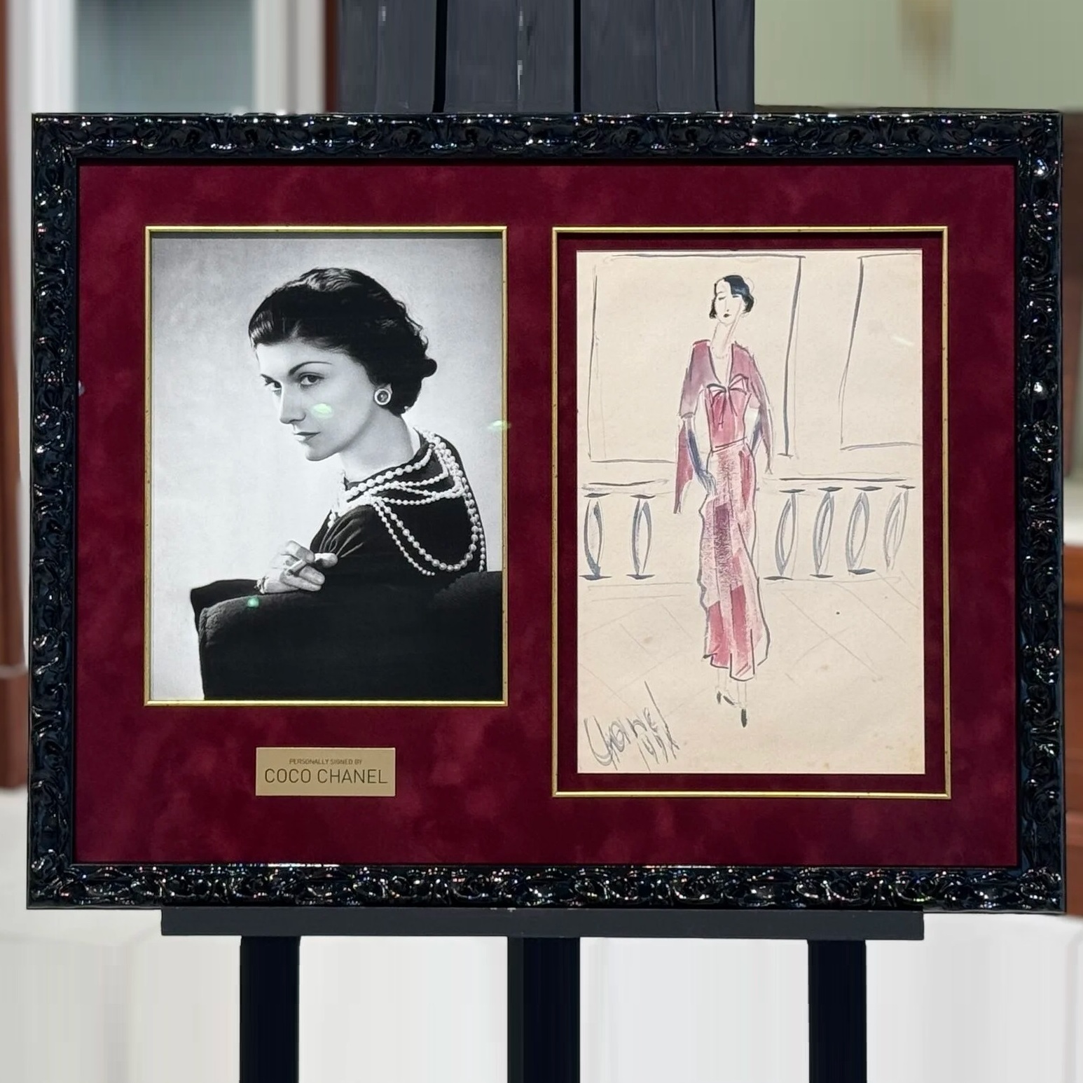 Эскиз, представленный в коллекции Stargift, датирован 1928 годом и собственноручно подписан Шанель. Он изображает женщину в элегантном длинном розовом платье с драпировкой, образующей изысканный бант, на груди. Этот дизайн отражает характерный для Шанель подход к женскому гардеробу — сочетание простоты линий с утонченными деталями.