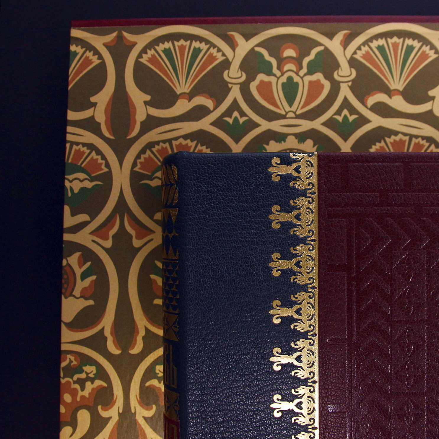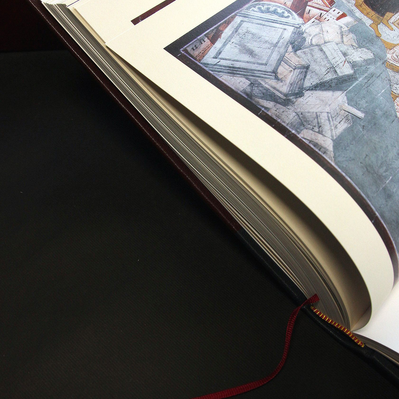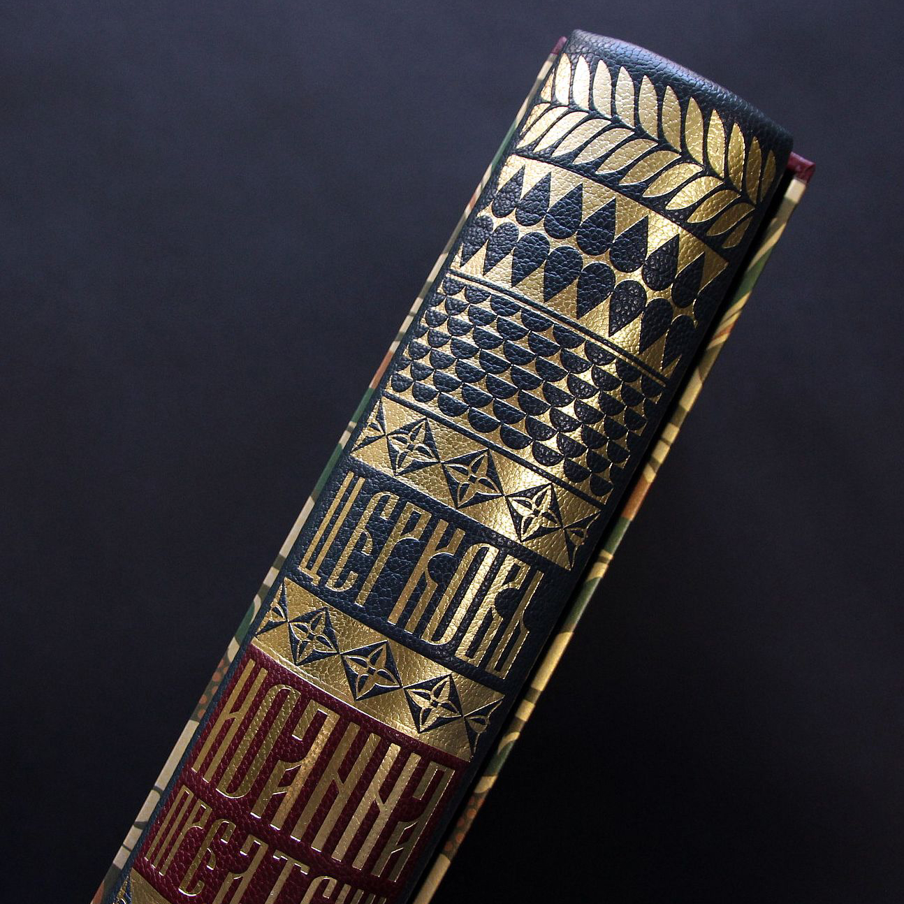 Исполнение:составной переплет ручной работы из натуральной кожи, составной футляр ручной работы: искусственная кожа, дизайнерская бумага, бумага SL Volume Brilliant White, переплет украшен тиснением золотой фольгой и блинтовым тиснением, шелковые каптал и ляссе, форзацы из дизайнерской бумаги.