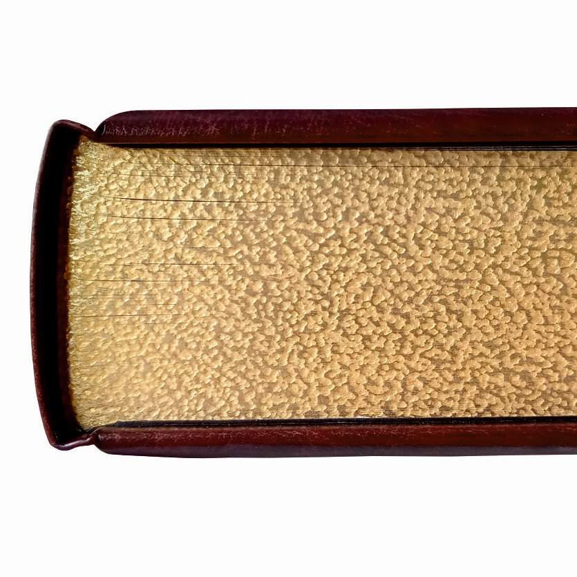 Особенности оформления: Переплет ручной работы. Натуральная переплетная кожа. Каптал из шелковых нитей. Ляссе шелковое. Обрез торшонированный золотой фольгой. Украшение переплета: тиснение полиграфической фольгой двух цветов.