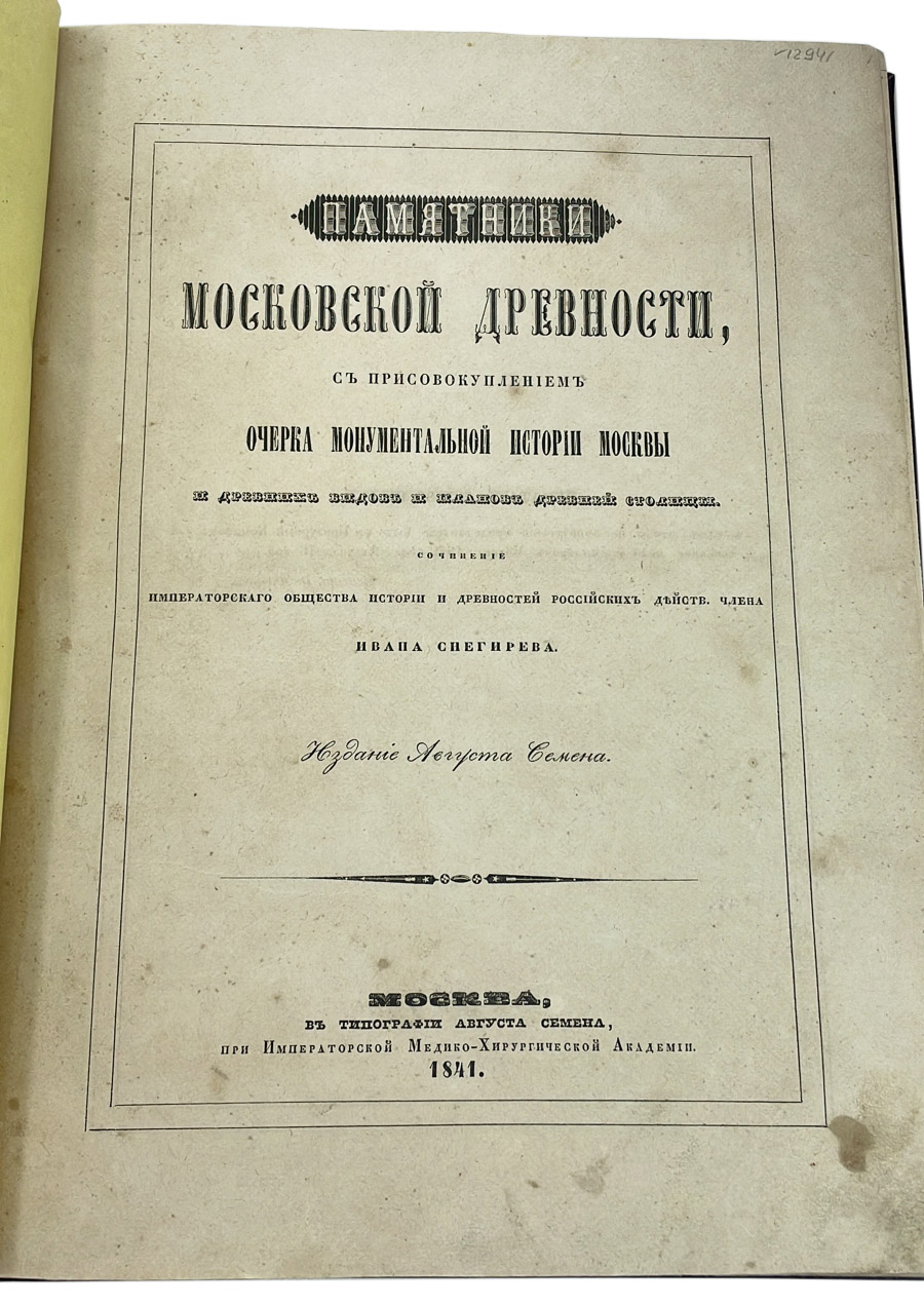 Книга антикварная в кожаном переплете "Памятники московской древности" Снегирев И. 1841г.