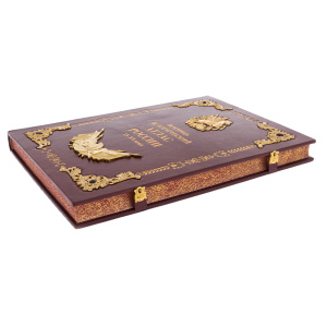 Книга в кожаном переплете с накладками "История государства Российского" Н.М. КарамзинКнига в кожаном переплете с накладками "История государства Российского" Н.М. КарамзинКлассическое произведение «последнего русского летописца» Николая Михайловича Карамзина, труд последних 25-ти лет его жизни, представлен в эксклюзивном оформлении. История России проиллюстрирована картинами великих русских художников, сумевших передать колорит каждой эпохи и выразить силу духа русского народа. Кожаный переплет с металлическими вставками и замками, золотой обрез, разнообразные орнаментальные рамки, обрамляющие легкий и увлекательный текст великого историка – все это никого не оставит равнодушным. Книга станет великолепным подарком для любого человека и займет достойное место в книжной коллекции.