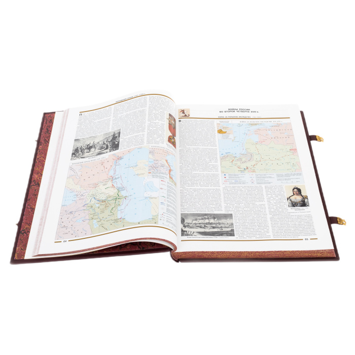 Внутреннее убранство книги продумано до мелочей: плотная бумага передаёт яркость карт и иллюстраций, формирующих целостное представление о развитии русского государства через призму ключевых военных кампаний. Красочные карты, архивная графика, исторические комментарии и детально выстроенная структура глав превращают издание в глубокий исследовательский труд, созданный для вдумчивого чтения. Декоративные элементы на форзацах, изящные ляссе и общий художественный строй формируют визуальную гармонию, перекликающуюся с роскошью внешнего оформления.