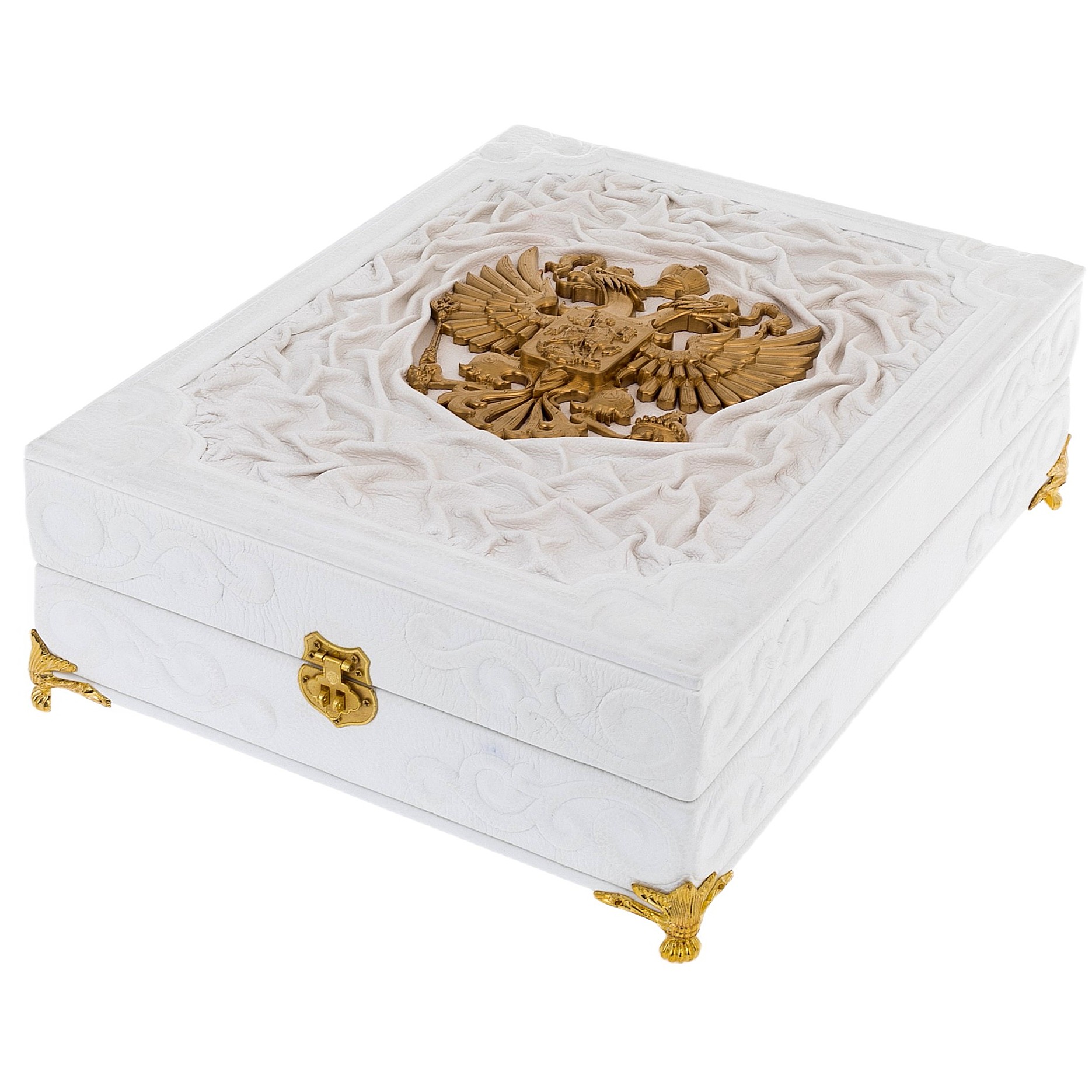 Особенности оформления:цельнокожаный переплет ручной работы, мелованная бумага, декоративные вставки, тиснение, ляссе, крашенный и полированный обрез; короб - бархат, кожа, латунь, декоративные вставки.