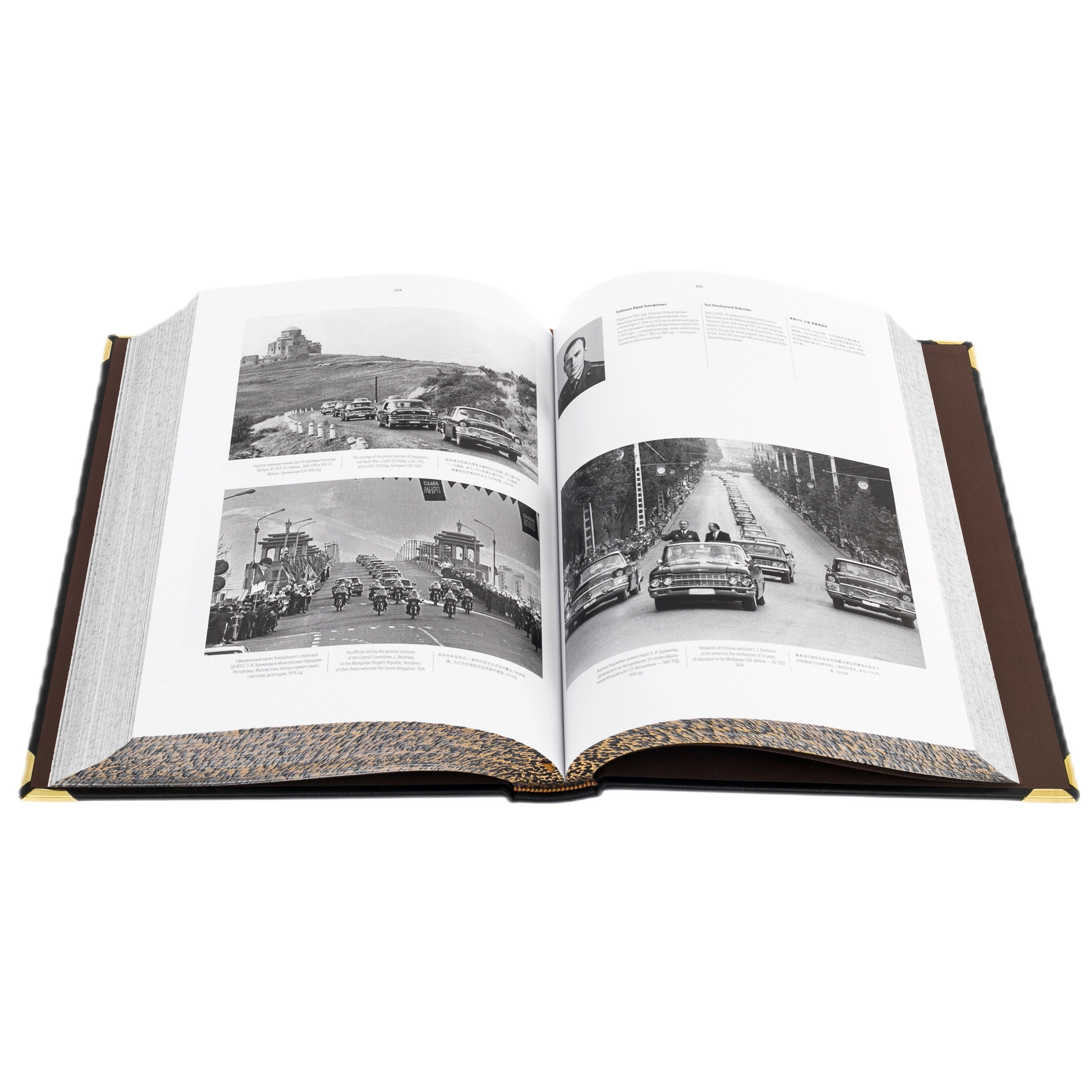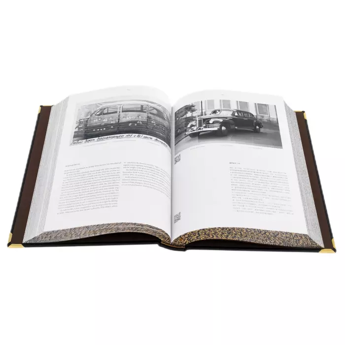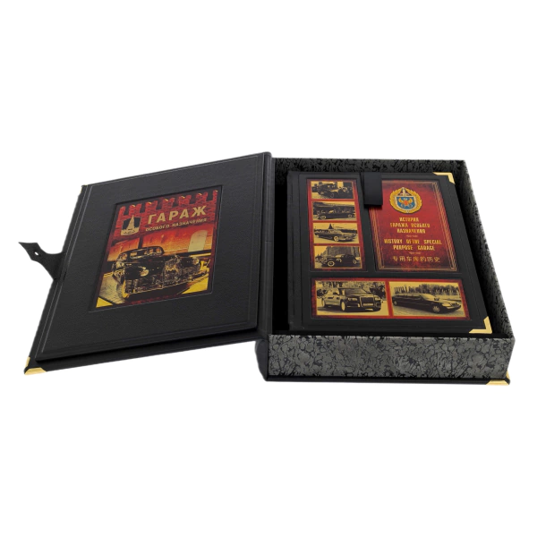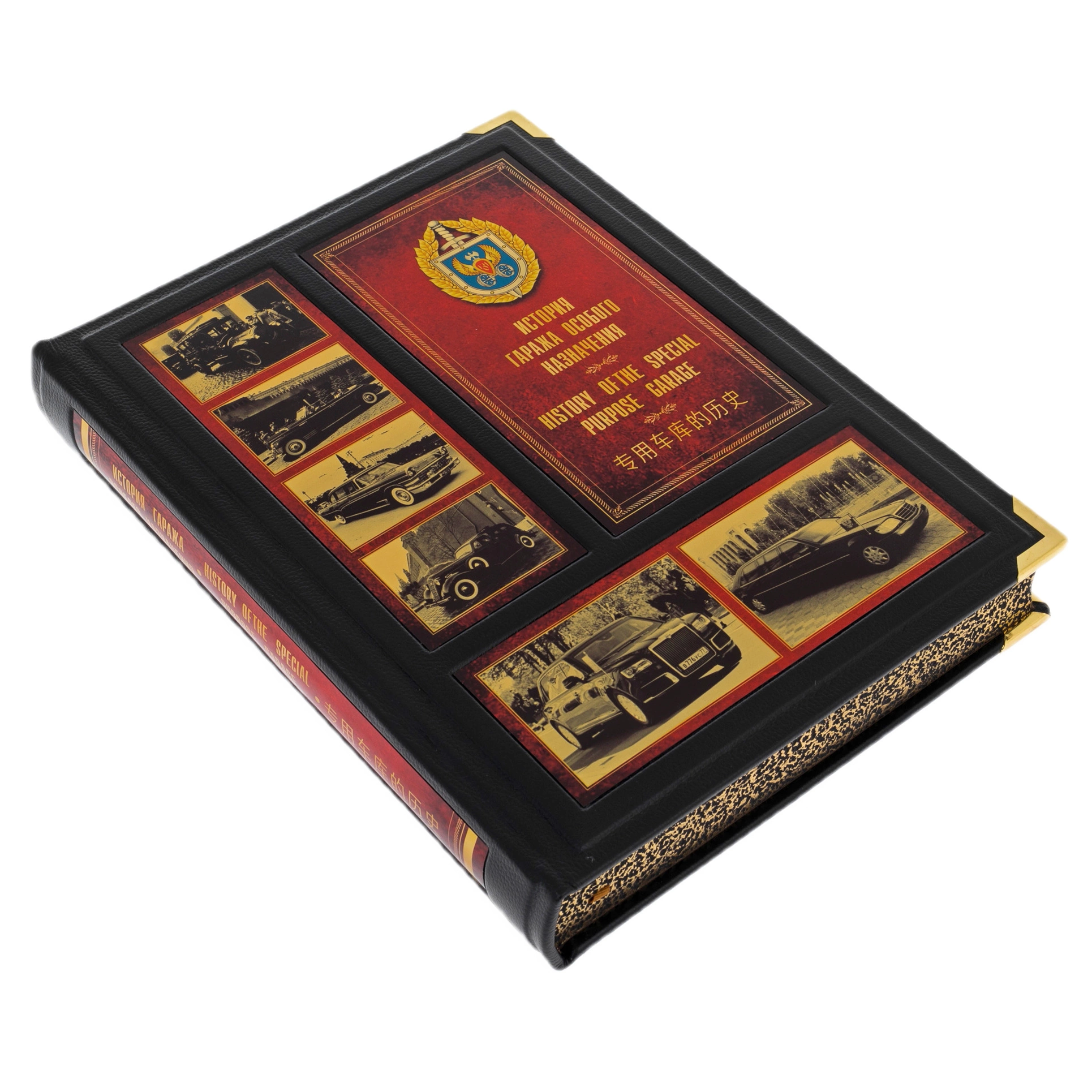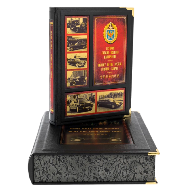 «Гараж особого назначения» — издание, открывающее двери в закрытую и полную тайн главу российской истории. Книга оформлена в кожаном переплёте чёрного цвета с глубокой текстурой, а её лицевую сторону украшает коллаж из архивной фотографии правительственного автомобиля на фоне стены Кремля. Яркая палитра оттенков — от красно-кирпичного до золотистого — подчёркивает торжественность и значимость материала. Углы книги защищены латунными накладками, а сама она заключена в массивный подарочный короб, оформленный в едином стиле и снабжённый надписями на трёх языках — русском, английском и китайском.