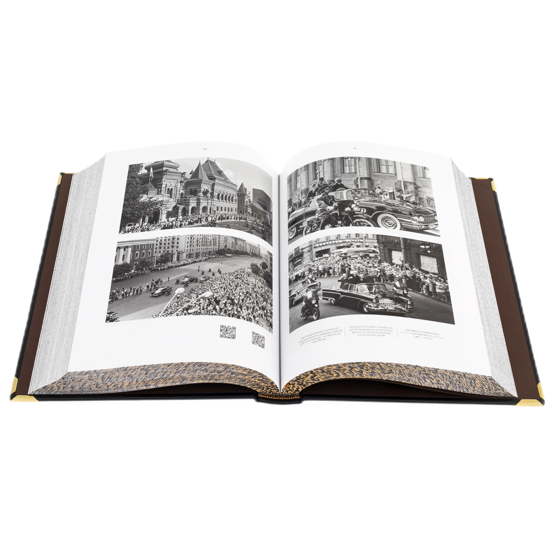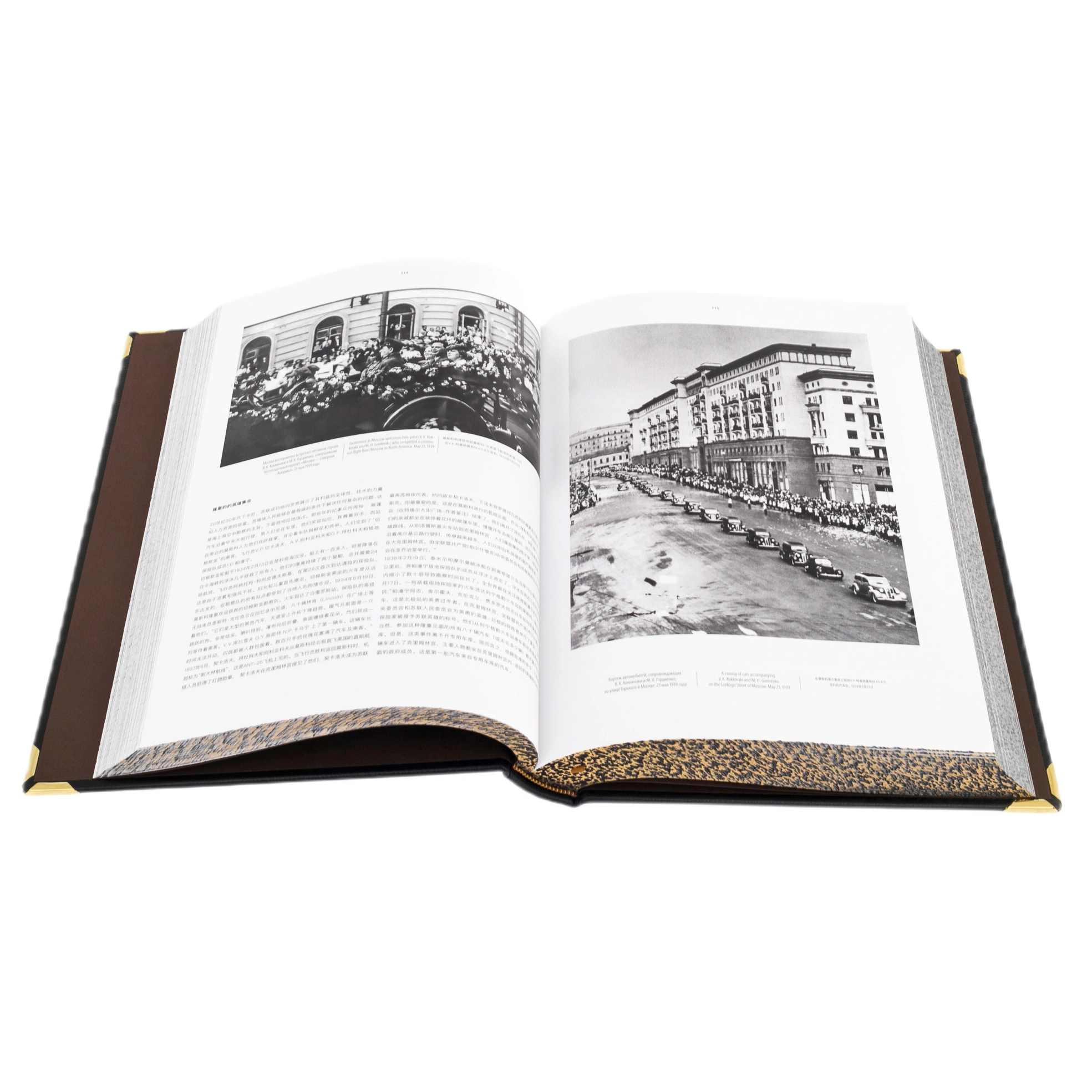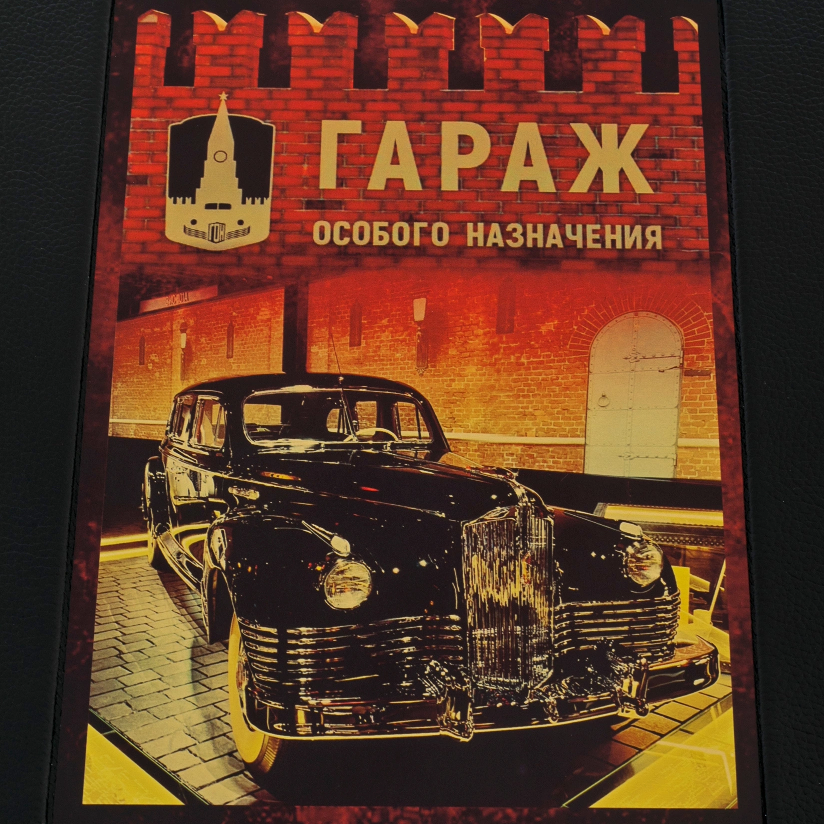 «Гараж особого назначения» — издание, открывающее двери в закрытую и полную тайн главу российской истории. Книга оформлена в кожаном переплёте чёрного цвета с глубокой текстурой, а её лицевую сторону украшает коллаж из архивной фотографии правительственного автомобиля на фоне стены Кремля. Яркая палитра оттенков — от красно-кирпичного до золотистого — подчёркивает торжественность и значимость материала. Углы книги защищены латунными накладками, а сама она заключена в массивный подарочный короб, оформленный в едином стиле и снабжённый надписями на трёх языках — русском, английском и китайском.