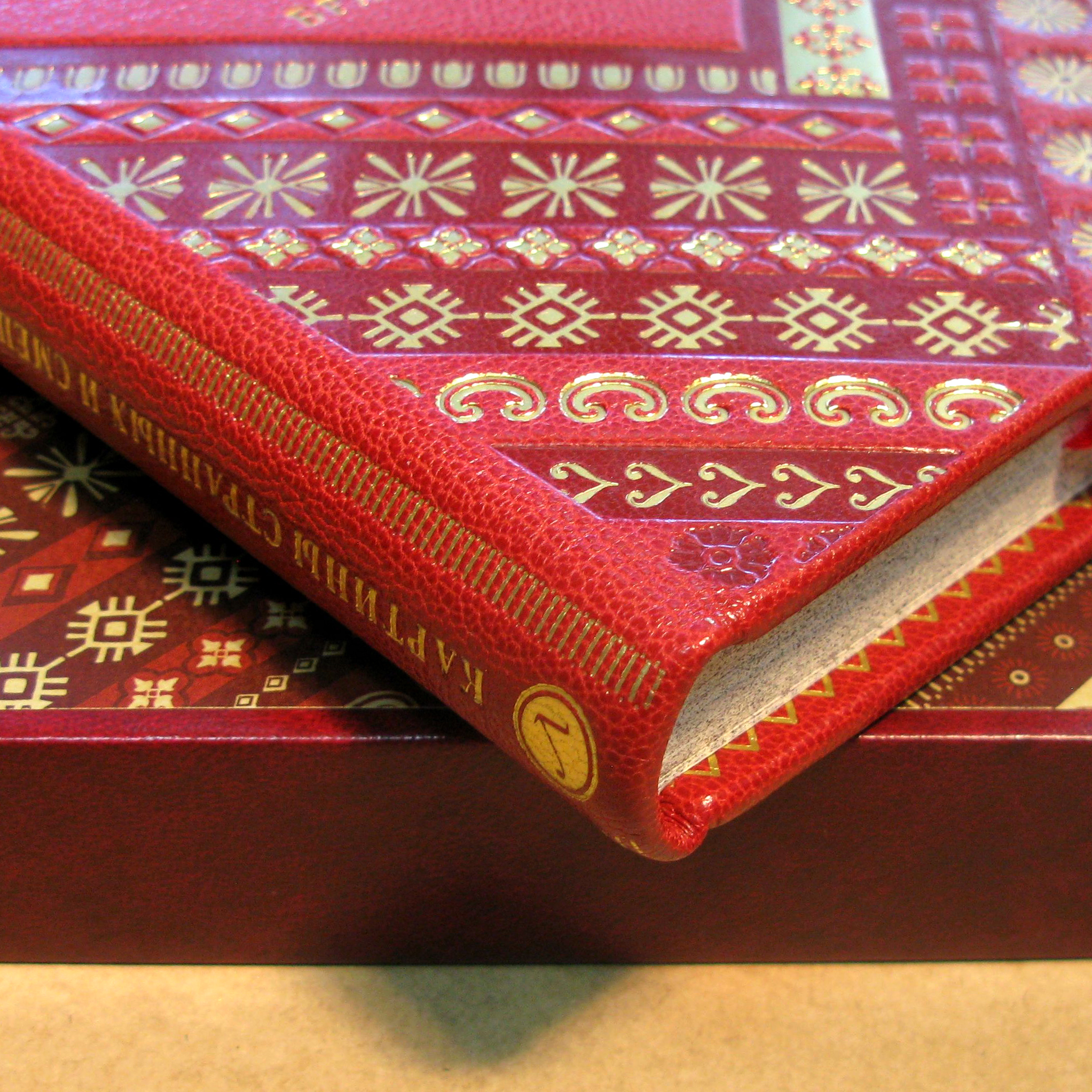 Особенности:Переплет украшен блинтовым тиснением и тиснением золотой фольгой, форзацы украшены дизайнерской бумагой с авторским рисунком.Крапленый обрез, верхняя часть обреза с тиснением золотой фольгой.Размеры: 14 × 21 см .
