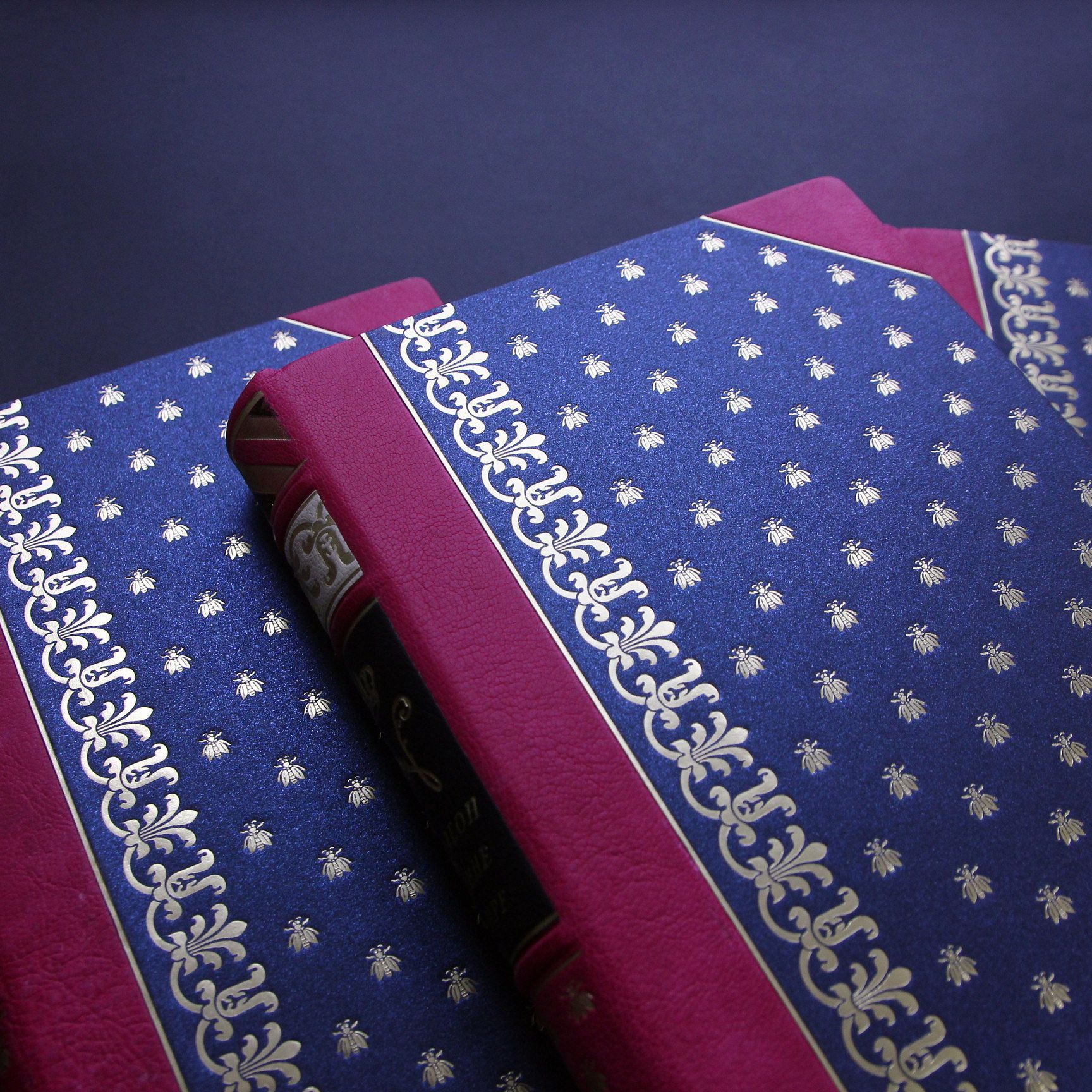 Особенности:Шелковые каптал и ляссе, форзацы из дизайнерской бумаги, переплет украшен тиснением золотой и медной фольгой, на корешках бинты и вклейки из контрастной кожи.Размеры: 15 × 23 см .