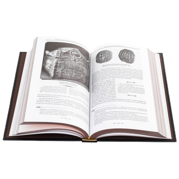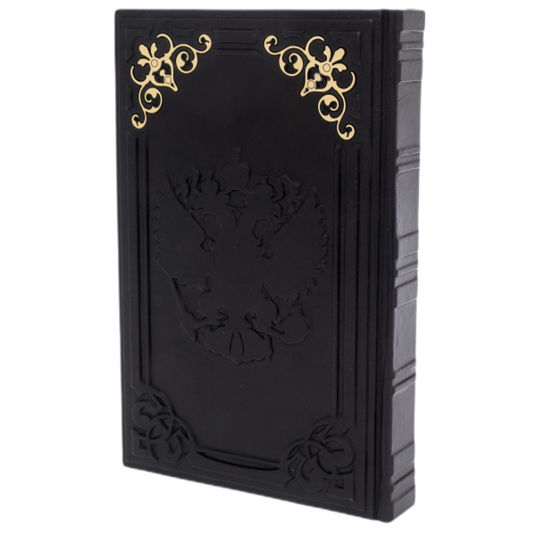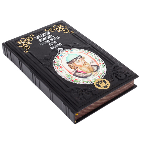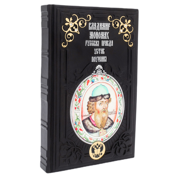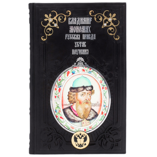 Книга «Русская Правда. Устав. Поучения» — это издание, в котором прошлое обретает плоть и голос. Переплёт из натуральной кожи глубокого чёрного цвета, украшенный объемным тиснением и золотыми элементами, словно щит, бережно охраняет знания, оставленные потомкам великим князем Владимиром Мономахом. На обложке — его лик в традициях старинной миниатюры, заключённый в цветочный венец, отсылающий к летописной стилистике и идее просвещённого правления. Каждая деталь издания — от декоративных вставок до герба Российской Федерации — подчёркивает его значение как не просто книги, но исторического реликвария, достойного места в собрании интеллектуала и ценителя великорусской традиции.