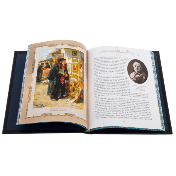 Переплет из высококачественной кожи с золотым тиснением и витиеватым орнаментом превращает книгу в настоящее украшение для любой библиотеки. На обложке размещен портрет автора на фоне старинной Москвы — образ, который сразу настраивает на погружение в атмосферу ушедшей эпохи. Тонко проработанные детали оформления, благородный блеск золота и глубокие цвета создают ощущение уникальности и элитарности. Эта книга не просто передает содержание, она визуально и тактильно подчеркивает свою ценность.
