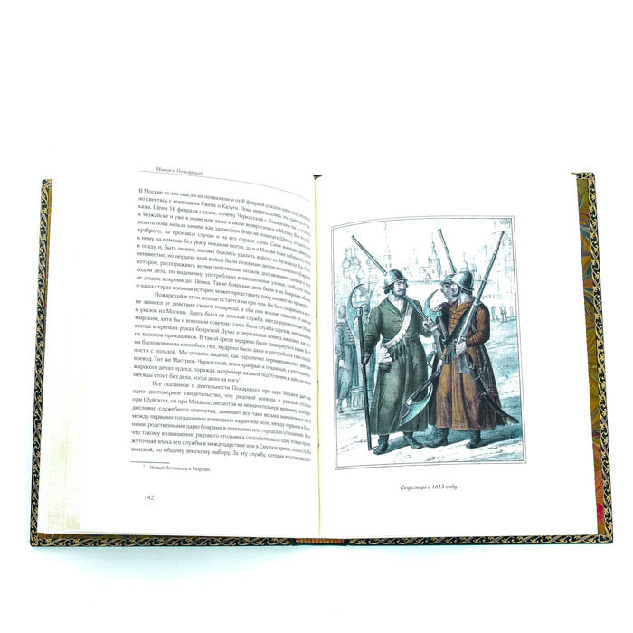 Особенности оформления: украшенная золотым, цветным и блинтовым тиснением. Верхний обрез окрашен и гравирован вручную. Полукожаный футляр.
