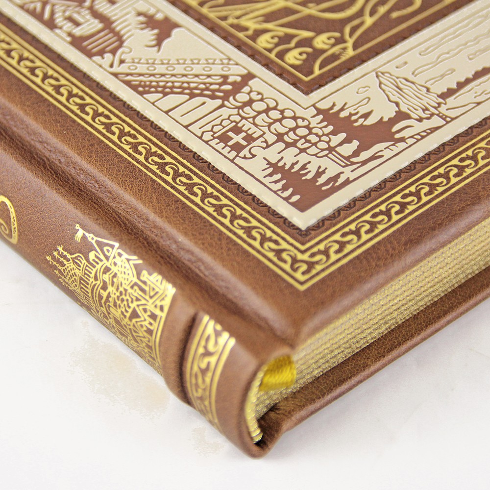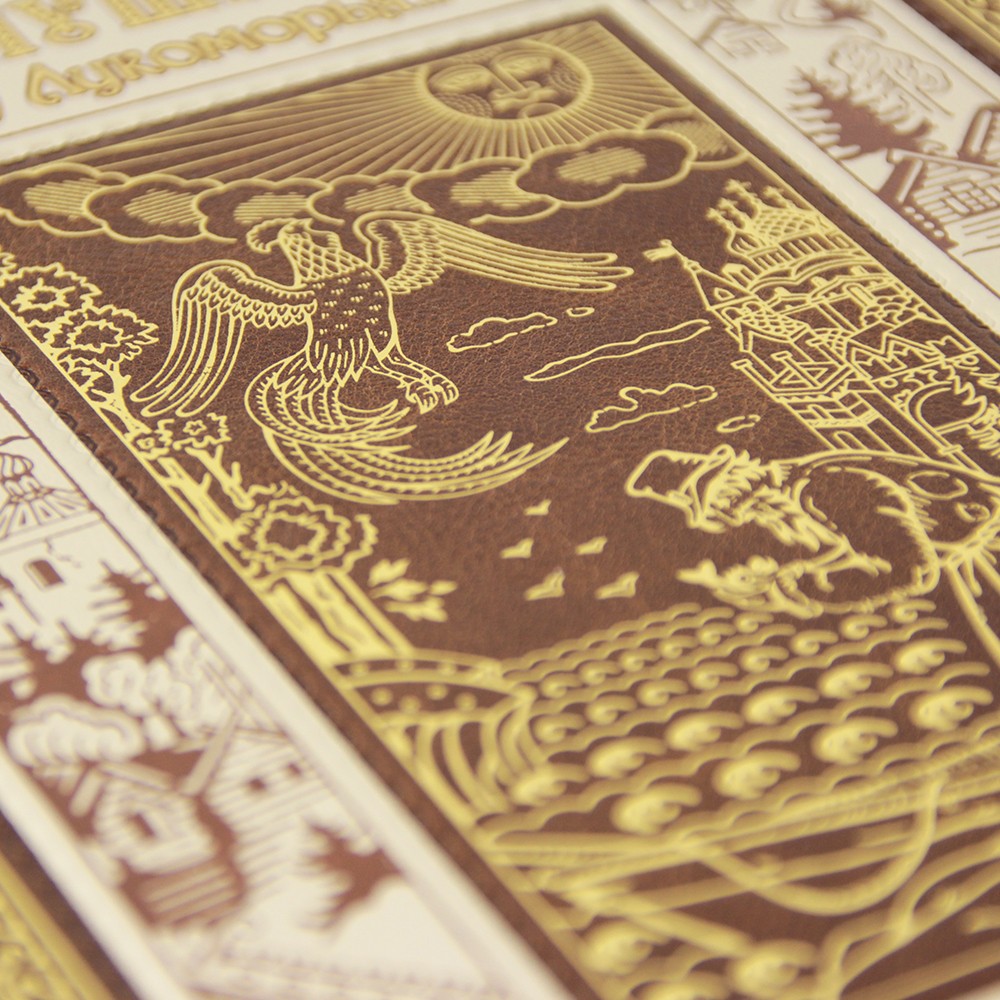 Исполнение: Составной переплёт ручной работы из натуральной кожи 2 видов. Форзац из дизайнерской бумаги. 2 бинта на корешке, ручной обработки. Каптал золотой из натуральной кожи. Обрез блока торшонированный золотой. Тиснение блинтовое, золотой и цветной фольгой. Ляссе.
