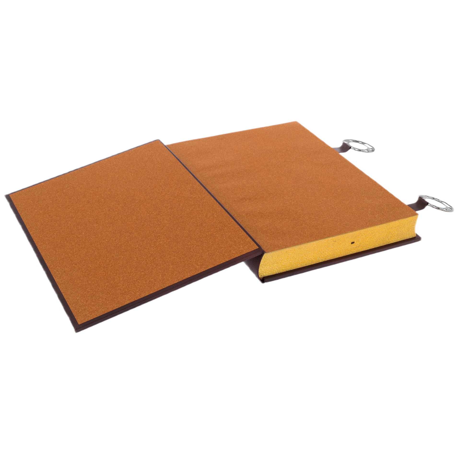 Особенности оформления: французский цельнокожаный переплет ручной работы на шнурах. Форзац составной на кожаной слизуре. Каптал двойной наборный, ручное плетение из шелковых нитей. Обрез торшорированный золотой фольгой. Ляссе шелковое. Украшения переплета: фигурная вырубка, декоративные металлические застежки.