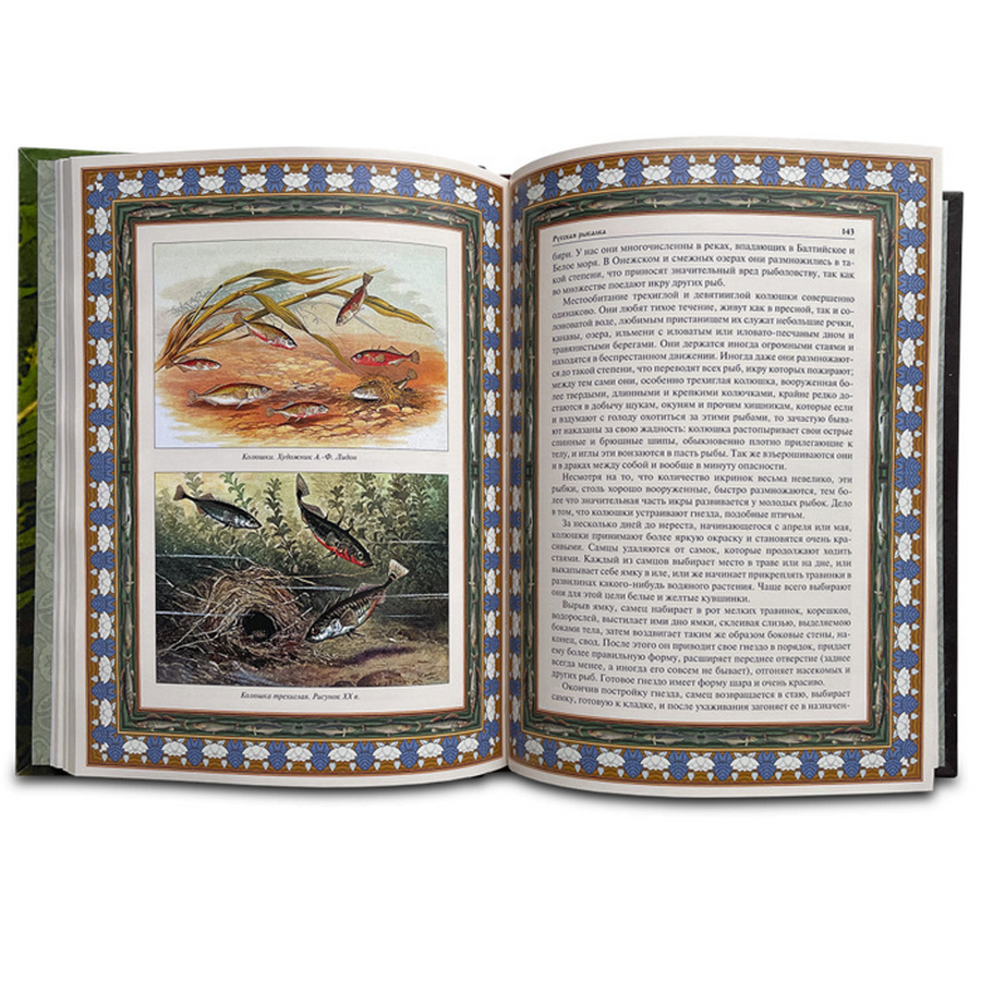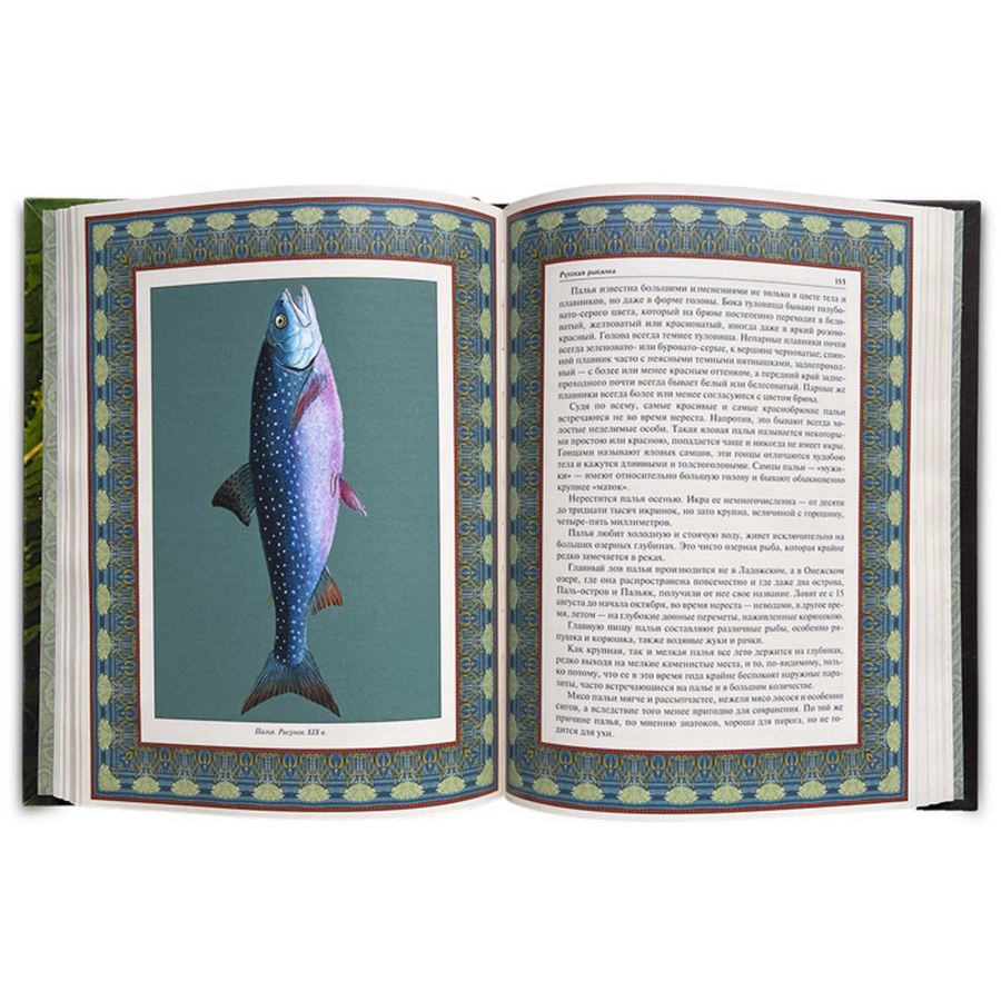 Подарочное, богато иллюстрированное издание в кожаном переплете ручной работы из натуральной кожи с трехсторонним золотым обрезом. Книга оформлена художественным литьем с изображениями рыб, фотопечать на коже, тиснение орнаментом с эффектом золотого напыления.