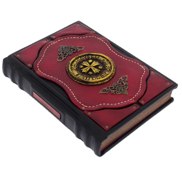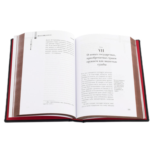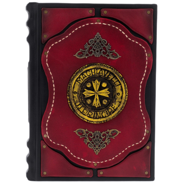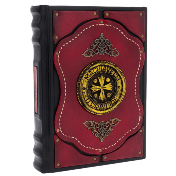 Этот уникальный экземпляр "Государя", заключённый в благородный кожаный переплёт насыщенного бордового оттенка, является не просто книгой, а настоящим символом власти. Центральный золотой медальон с латинской надписью, окружённый утончёнными элементами тиснения, словно печать эпохи, подчеркивает монументальность и значимость этого издания. Металлические декоративные детали и плавные линии ручной работы придают обложке особую величественность, гармонично сочетая эстетику эпохи Возрождения с современной изысканностью.