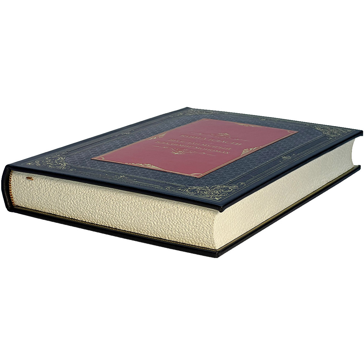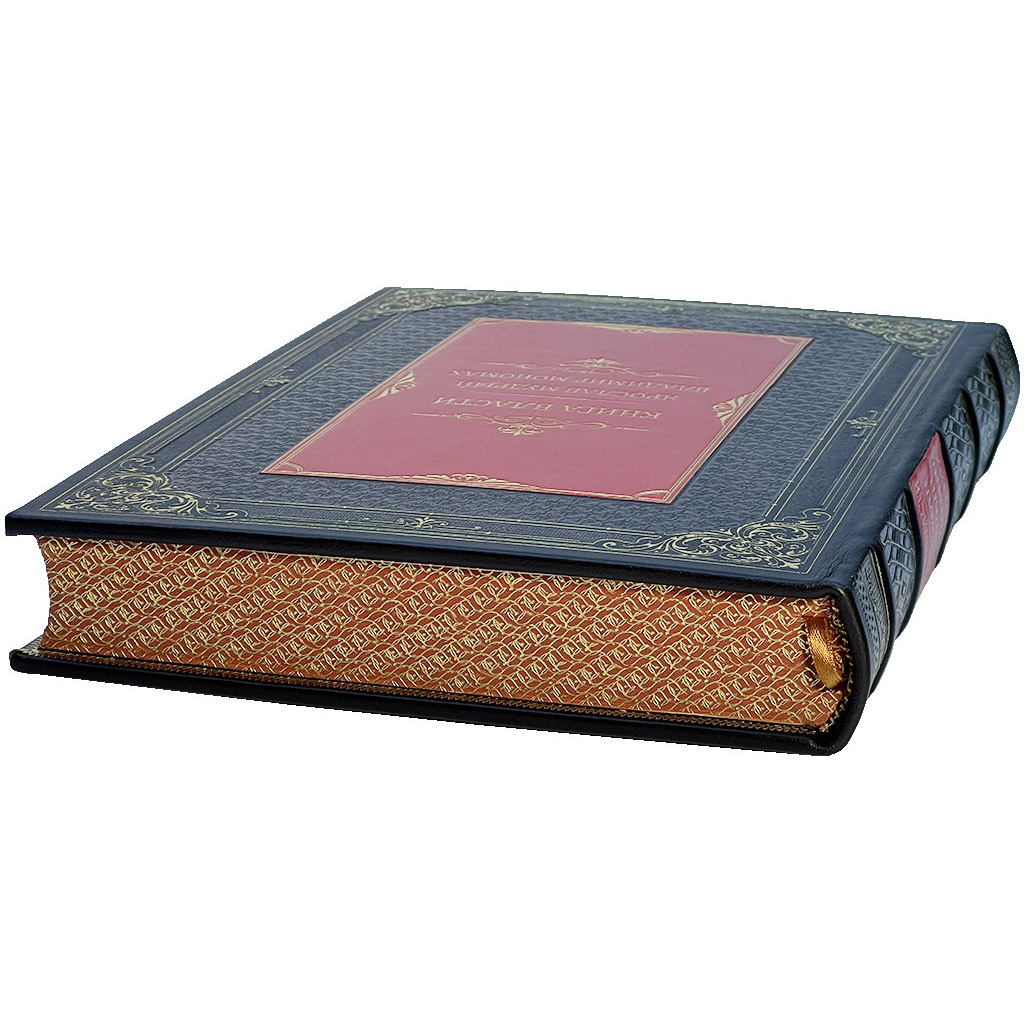 Исполнение:цельнокожаный переплёт ручной работы, украшен цветной кожаной вставкой, а также золотым и блинтовым тиснением, корешок декорирован бинтами, текст книги напечатан на бумаге Palatina Avorio 100 Австрийского производства, обрез оформлен в технике торшонирование, ляссе из шёлковой ленты, форзац цельный из дизайнерской бумаги, дублюра окатана золотом. Футляр кожаный, вдохновлён дизайном книги.