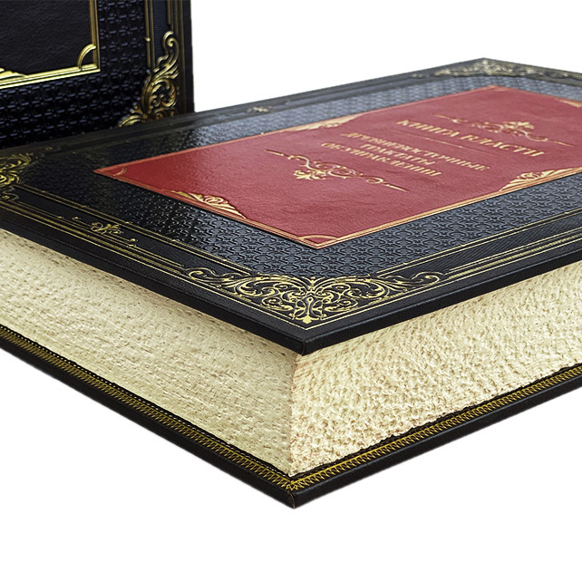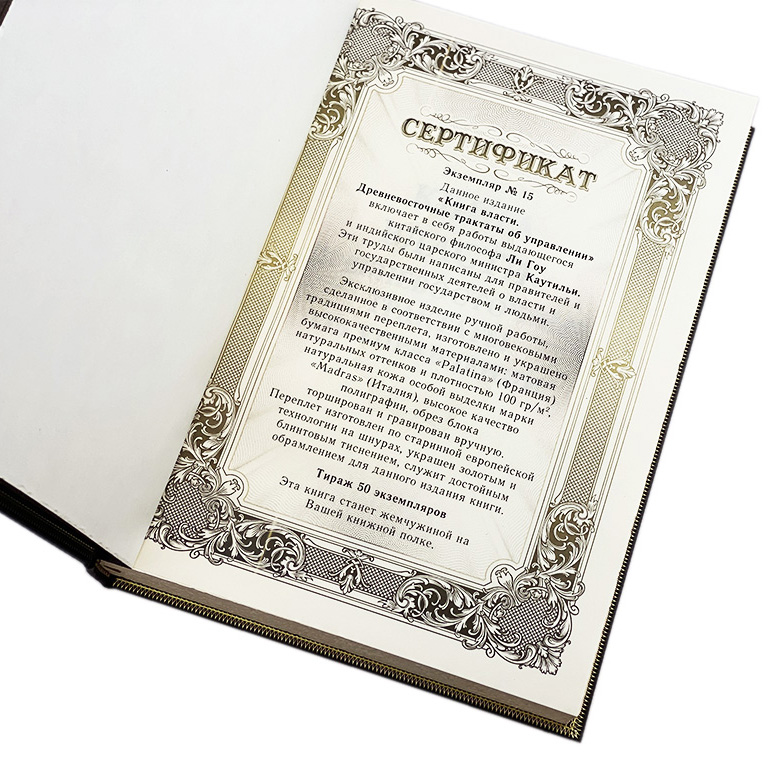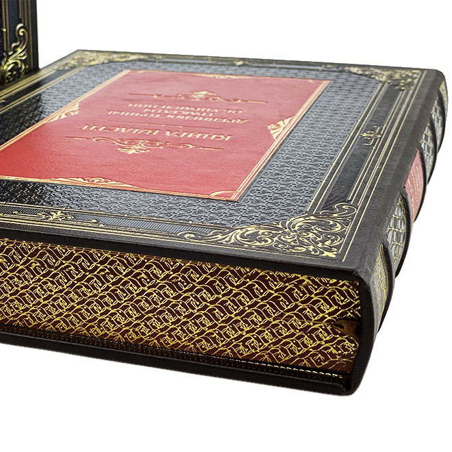 Исполнение: Цельнокожаный переплёт ручной работы, украшен цветной кожаной вставкой, а также золотым и блинтовым тиснением. Корешок декорирован бинтами. Текст книги напечатан на бумаге Palatina Avorio 100 Австрийского производства. Обрез оформлен в технике торшонирование. Ляссе из шёлковой ленты. Форзац цельный из дизайнерской бумаги. Дублюра откатана золотом. Футляр кожаный, вдохновлён дизайном книги.