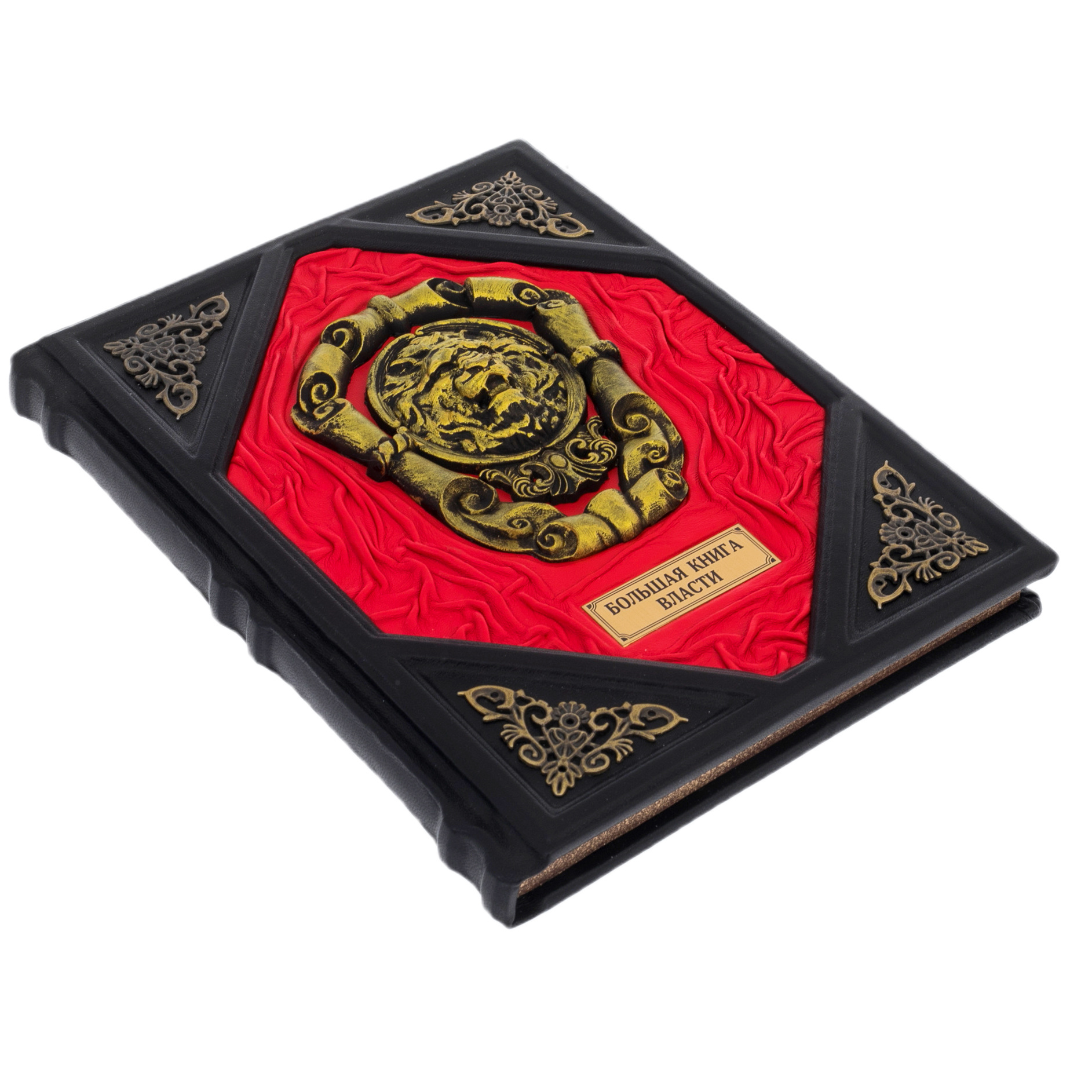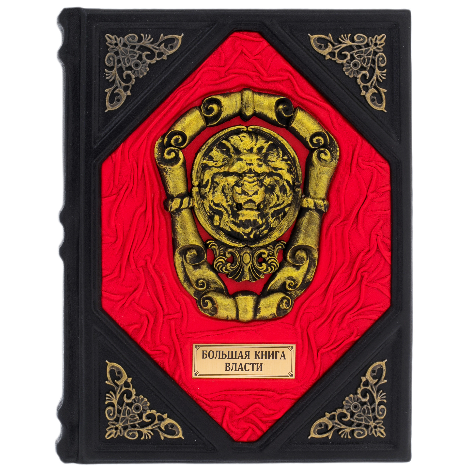 Переплёт выполнен из натуральной кожи, чёрной и алой, с глубоким рельефом и вручную тонированными декоративными элементами. В центре обложки — барельеф в виде львиной маски в бронзовом обрамлении, символизирующей силу, стойкость и непоколебимую волю. Алый шёлковый фон придаёт изданию парадный характер, контрастируя с чёрными вставками и золотым тиснением. Каждый декоративный элемент — от завитков в уголках до рамки с названием — изготовлен и закреплён вручную, с безупречной точностью и вниманием к стилю.