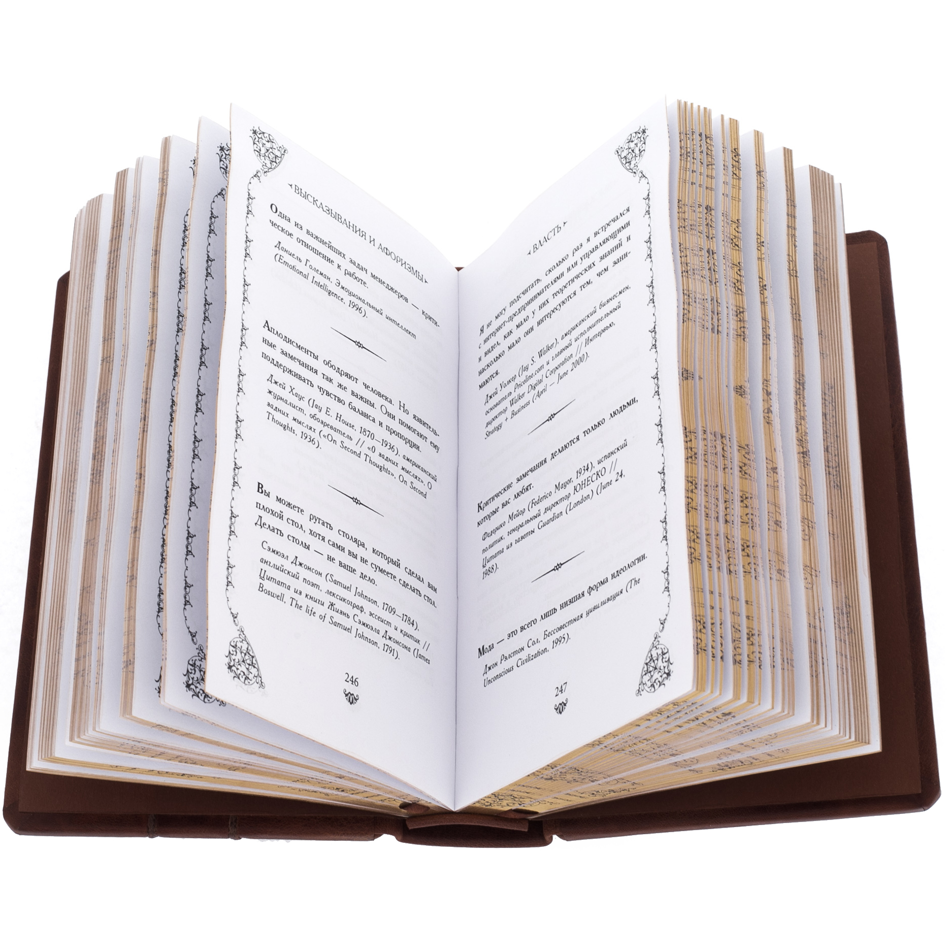Особенности оформления:составной переплет «Брадель», ручной работы, выполнен из комбинации натуральных кож (кожа теленка «Robbat Cognac», кожа «Robbat Wisky» производства итальянской кожевенной фабрики «Benericetti»). Обложка книг и футляр оформлены многоуровневым тиснением: глубоким блинтовым и рельефным золотым (использована фольга «Luxor 240»). Обрез книг вручную полирован и выполнен в уникальной технологии художественной запечатки золотой основы. Футляр устлан итальянским коттон-бархатом.