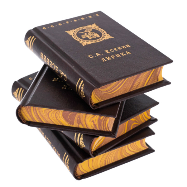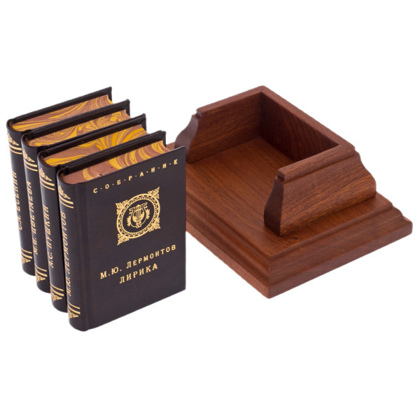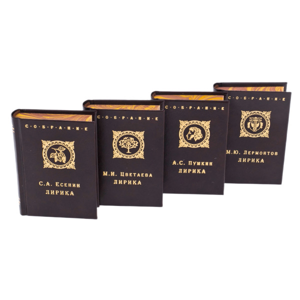 В этих книгах собраны бессмертные строки великих русских поэтов — Пушкина, Лермонтова, Есенина и Цветаевой. Их имена, аккуратно выгравированные золотыми буквами, словно оживают на тёмной гладкой коже обложек, напоминая о вечности их творчества. Тонкие орнаменты, украшающие переплёты, переносят в эпоху, когда литература была не только искусством слова, но и выражением высших идеалов.