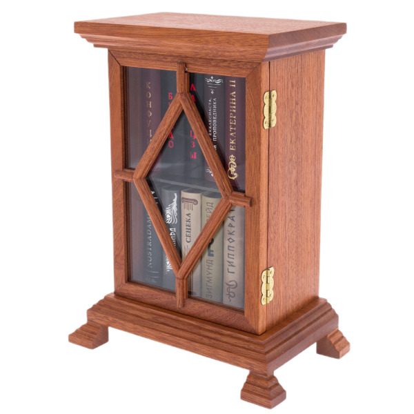 Шкаф выполнен из ценной породы дерева, отполирован до бархатного блеска и снабжён прочными латунными петлями и миниатюрной застёжкой. Внутри — стеклянная полка, визуально делящая пространство на два яруса, как в классических библиотечных витринах. Каждая книга в наборе отпечатана на плотной дизайнерской бумаге, текст оформлен с орнаментальными элементами и бережно сверстан в соответствии с канонами старинной типографики. Чтение этих книг становится не только интеллектуальным удовольствием, но и визуальным праздником, сродни прикосновению к музейному экспонату.