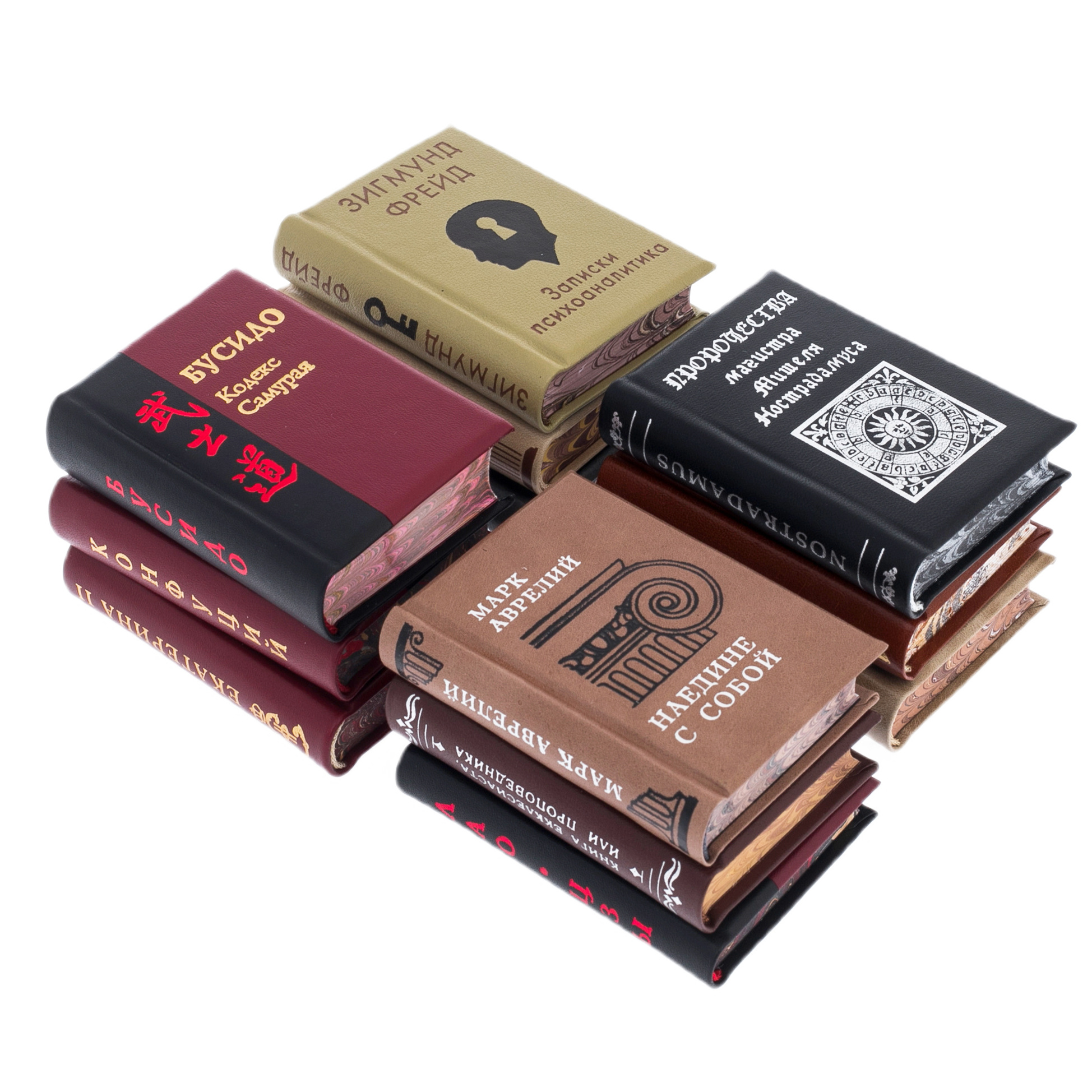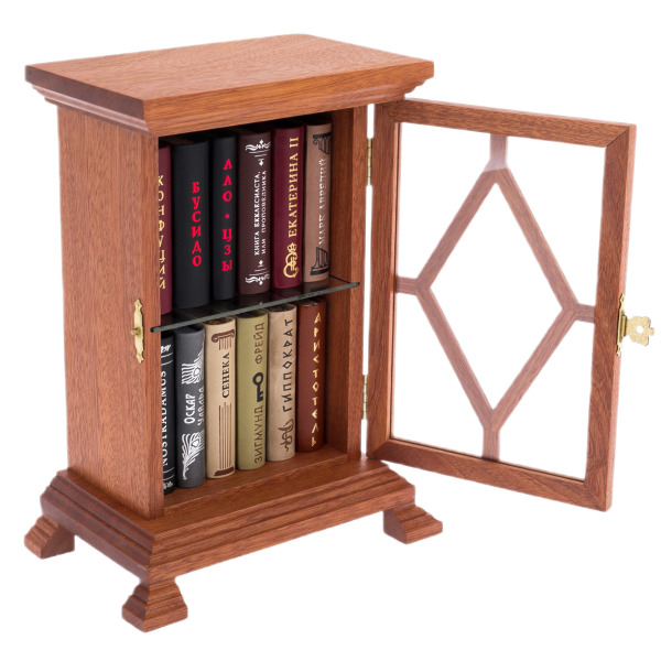 Коллекция миниатюрных книг "Шкаф Диамант" — редкое сочетание интеллектуального содержания и изящной формы, обращённое к ценителям элитарных книжных собраний. Комплект включает 12 миниатюрных томов, каждый из которых посвящён великой исторической личности или философскому учению: от Аристотеля и Сенеки до Фрейда и Екатерины II. Издания заключены в качественные переплёты с тиснением и оформлены декоративными элементами, а миниатюрный формат придаёт коллекции особый шарм. Книги размещены в деревянном шкафу ручной работы с застеклённой дверцей, украшенной резной накладкой в форме ромба, что делает комплект одновременно декоративным и функциональным.