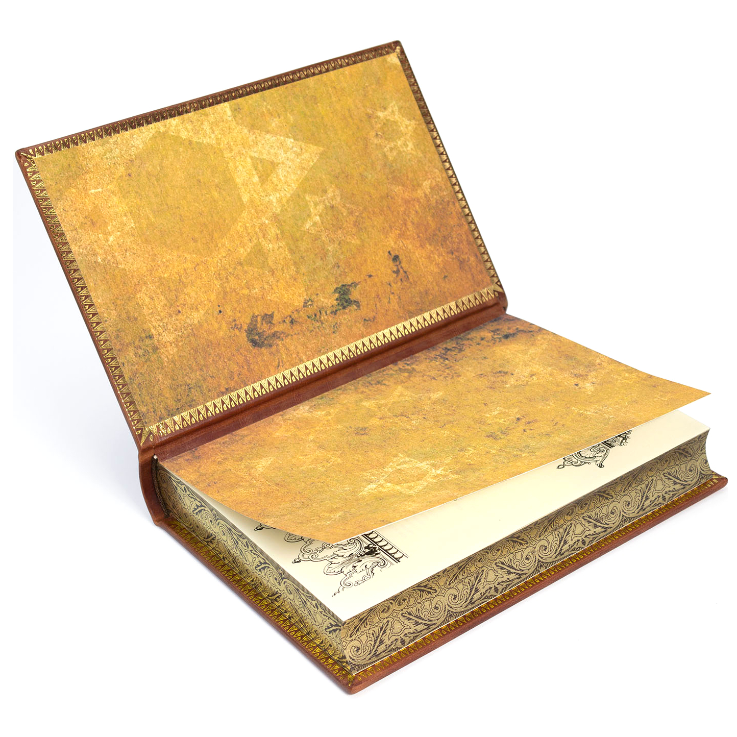 Особенности оформления: полностью ручная работа; обрезы блока страниц вручную отшлифованы и нанесен золотой орнамент.