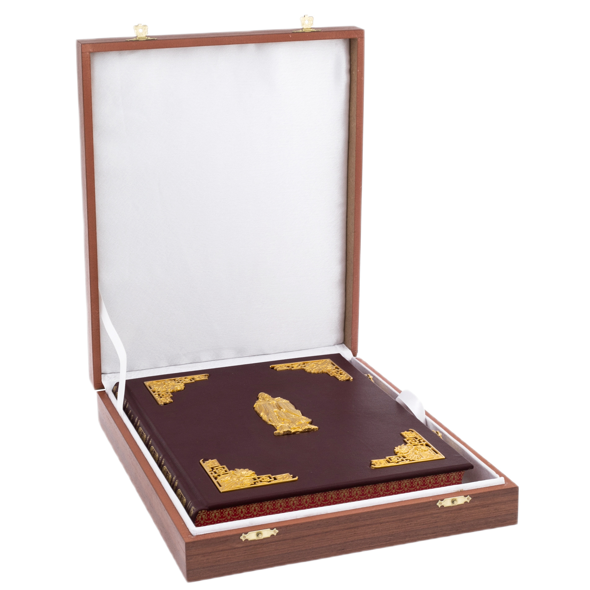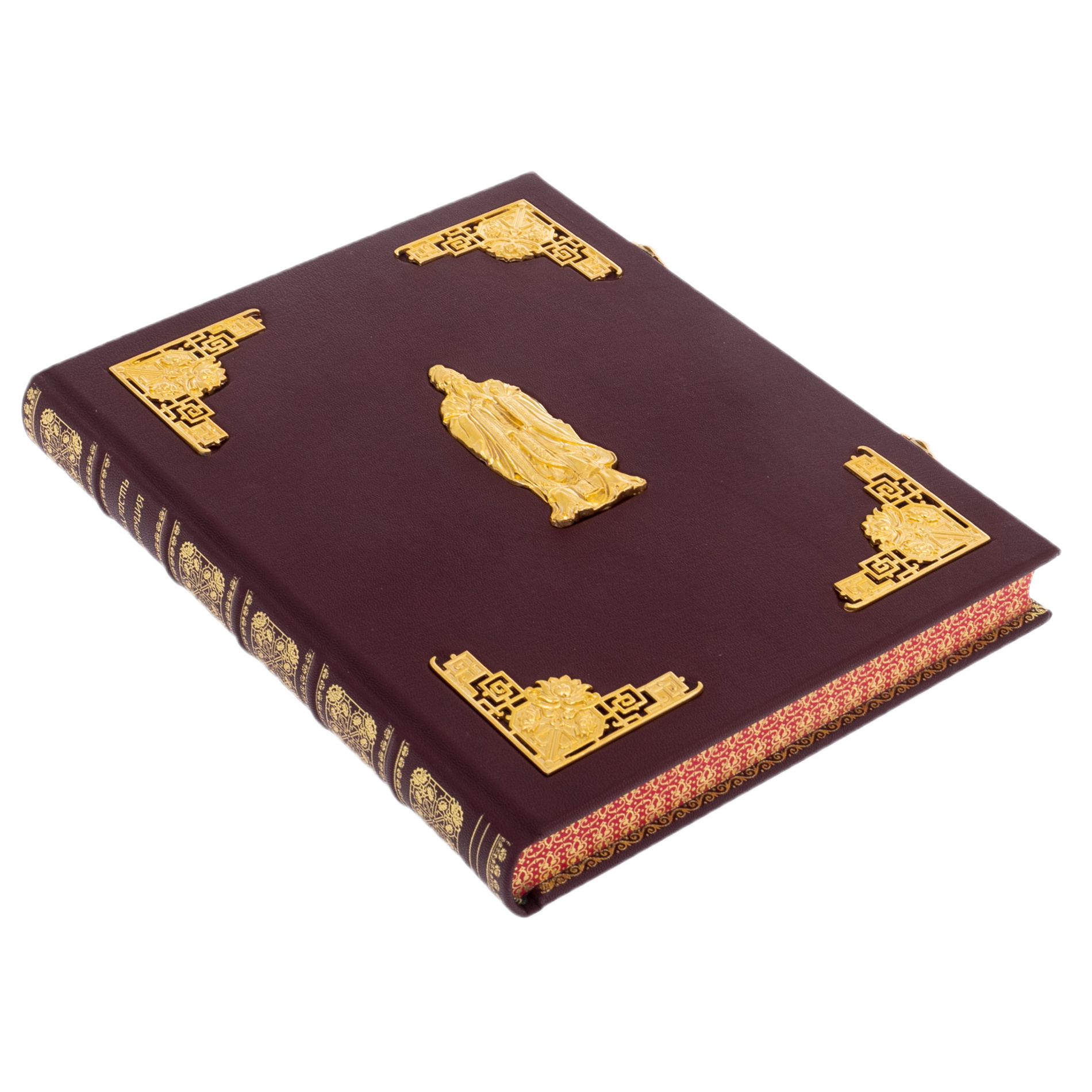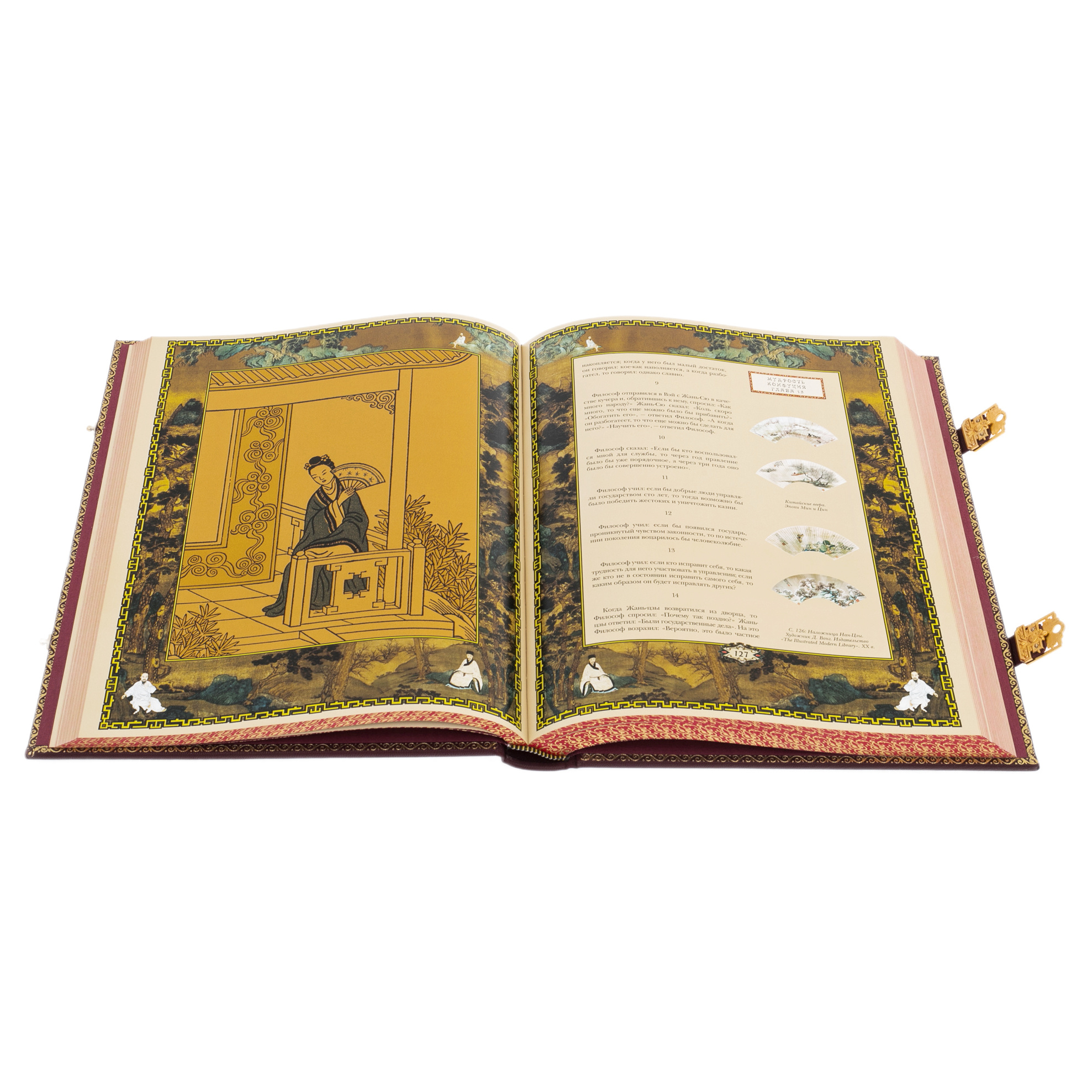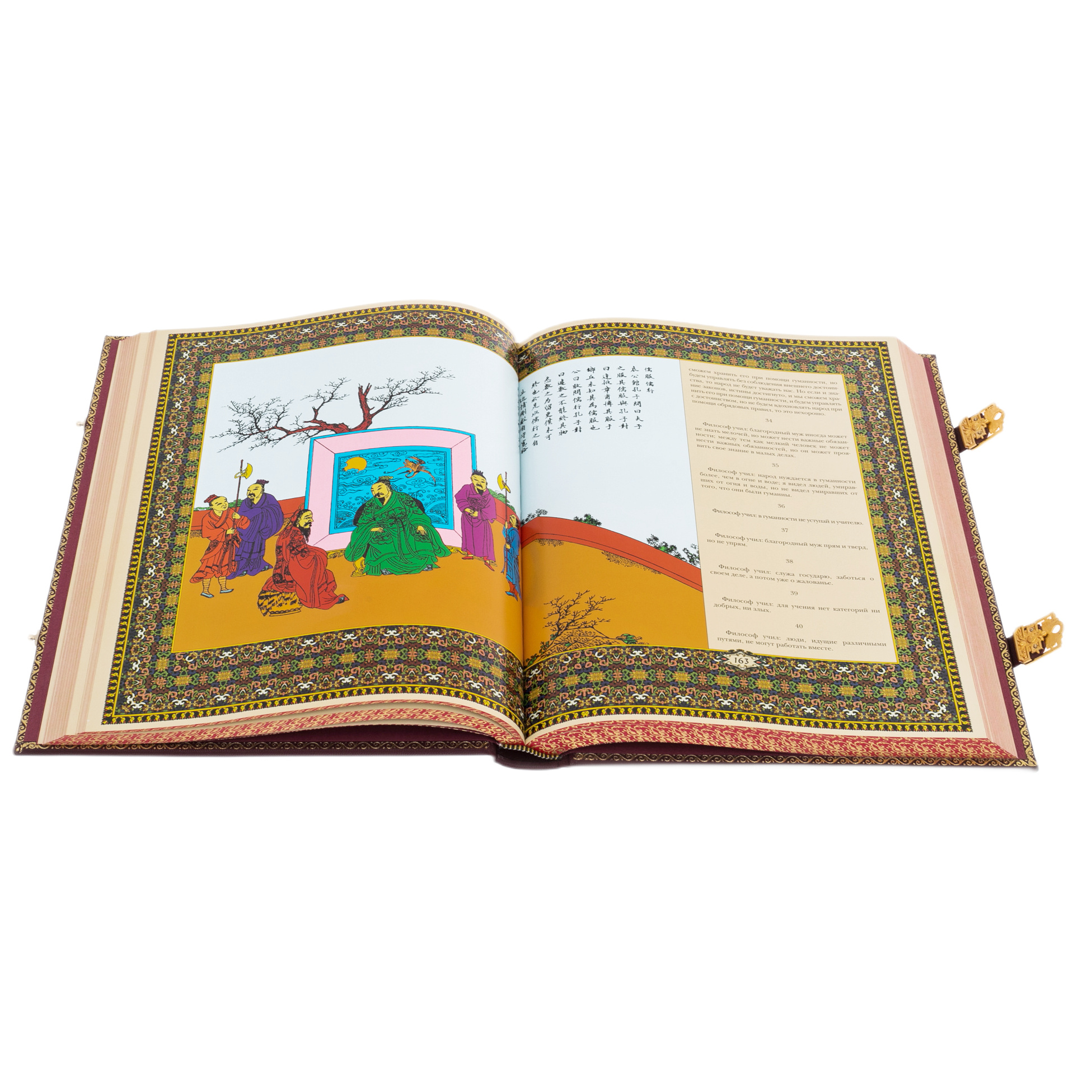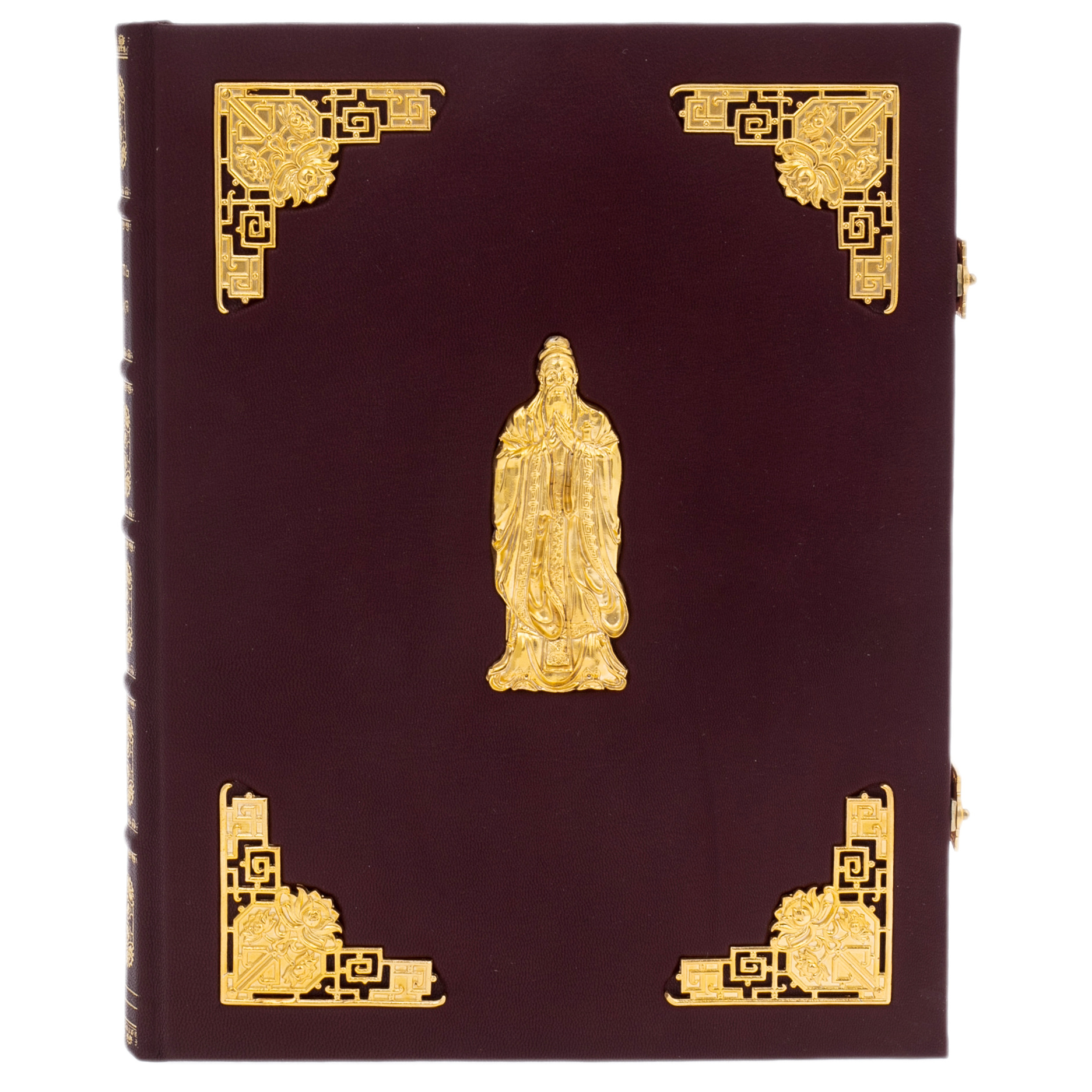 Золотые уголки переплета, украшенные тончайшей резьбой, напоминают о том, как конфуцианские истины поддерживают всю структуру духовной жизни, подобно фундаменту, на котором стоит здание. В центре обложки изображена фигура Конфуция — как знак мудрости, которая направляет и учит через века.
