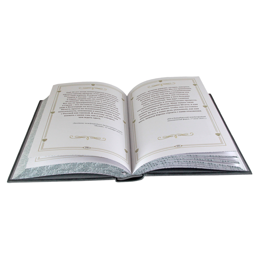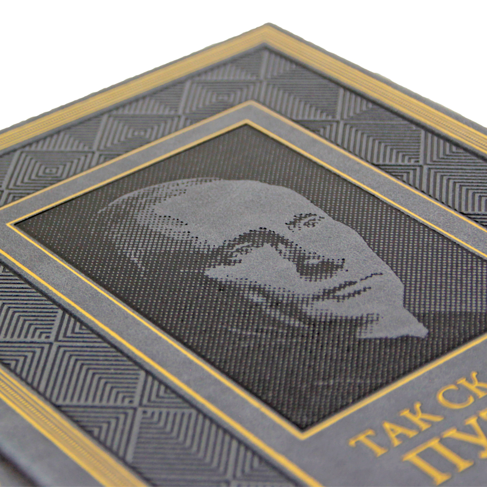 Исполнение: переплёт ручной работы из натуральной кожи, форзац из дизайнерской бумаги, 5 бинтов на корешке, ручной обработки, каптал из натуральной кожи, обрез блока полноцветная печать, тиснение блинтовое, золотой и цветной фольгой, ляссе.